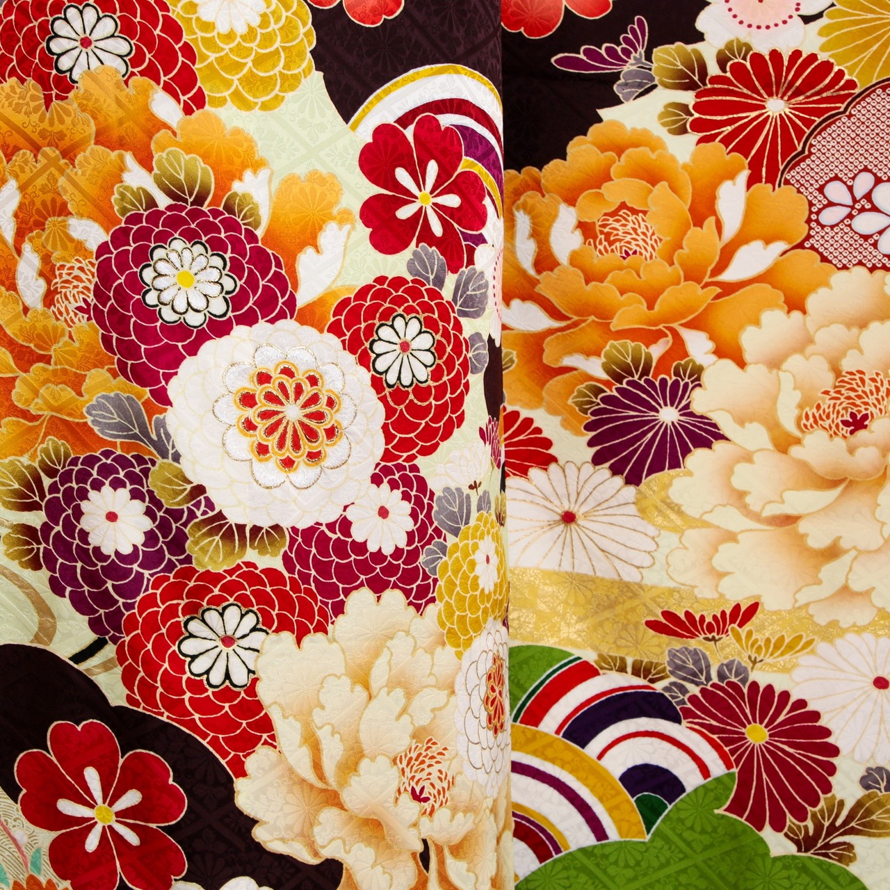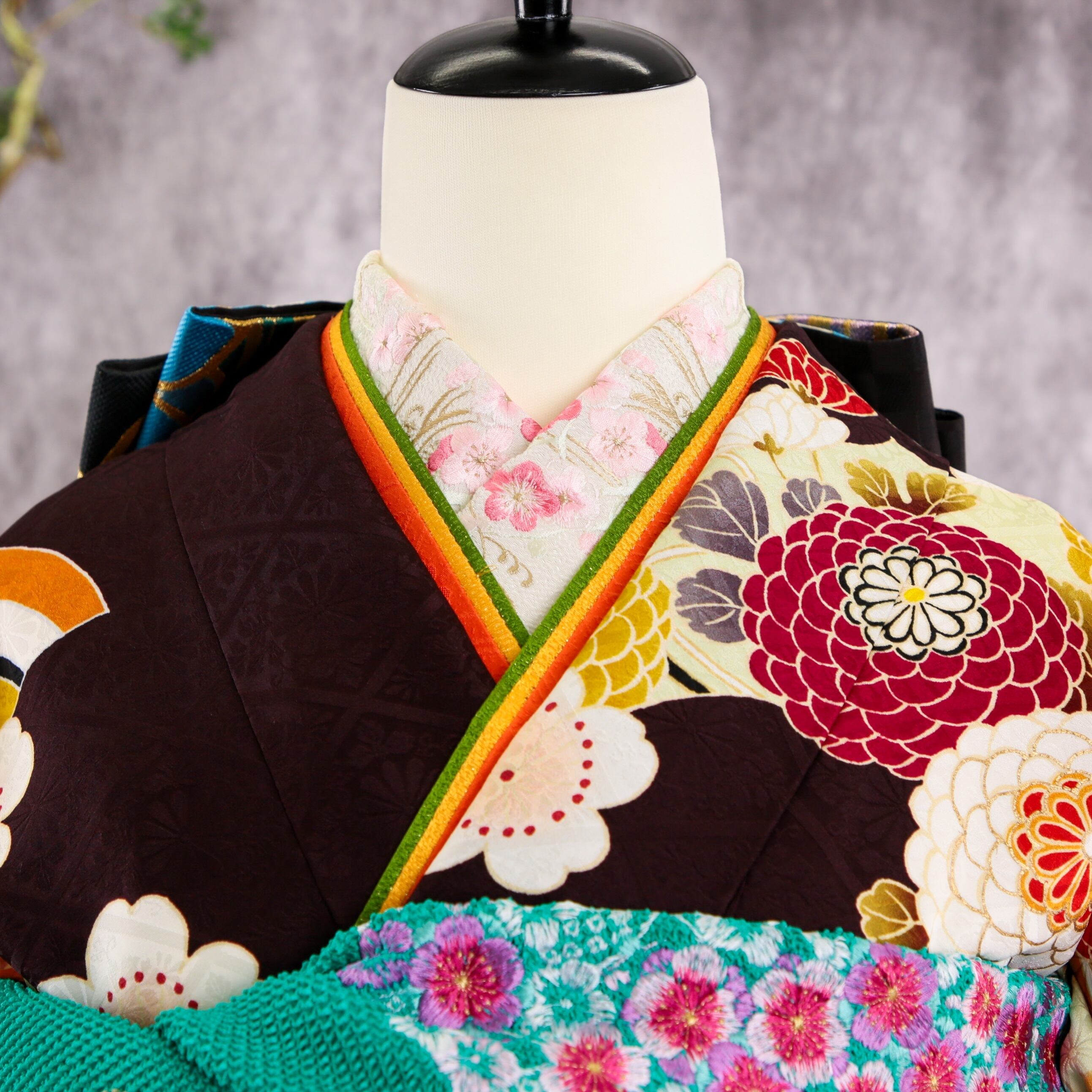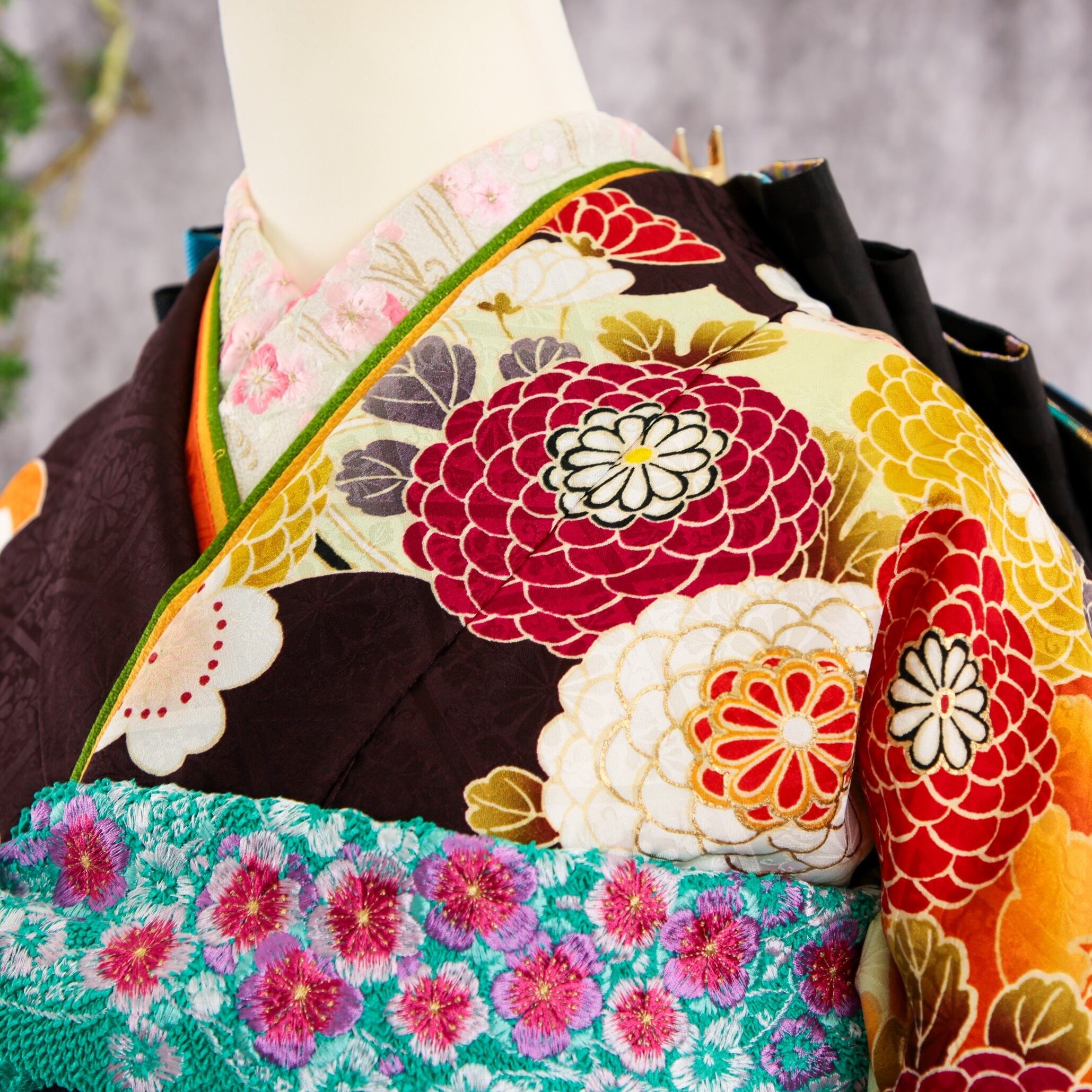 茶色地に菊や牡丹が華やかな古典振袖です。