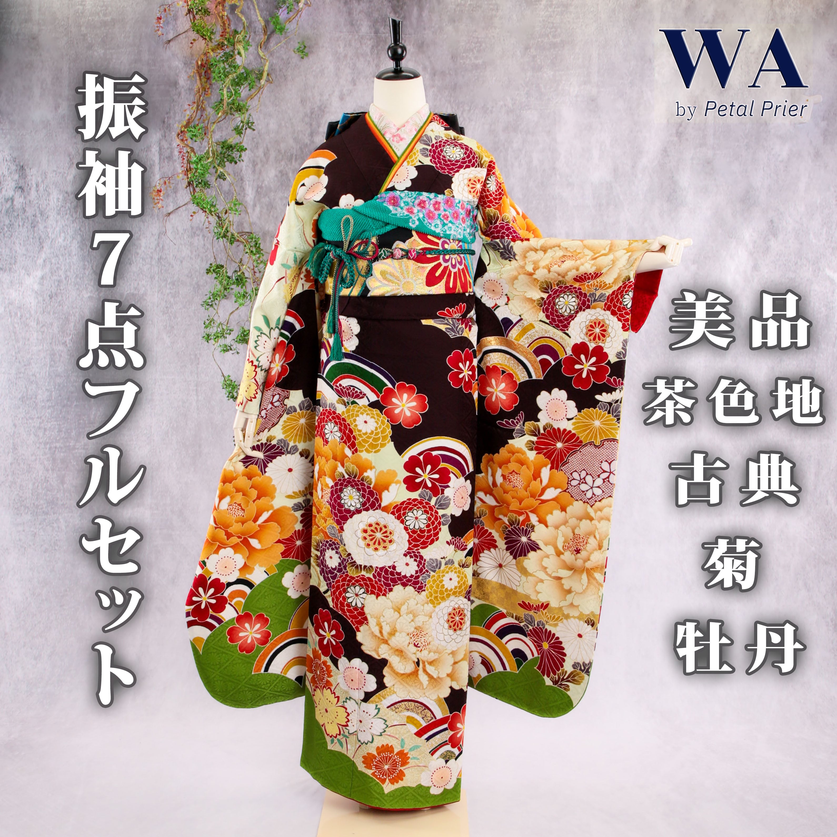 振袖フルセット 振袖セット 振袖 LLサイズ 茶×古典 美品 成人式 着物 晴れ着 7点フルセット F-519