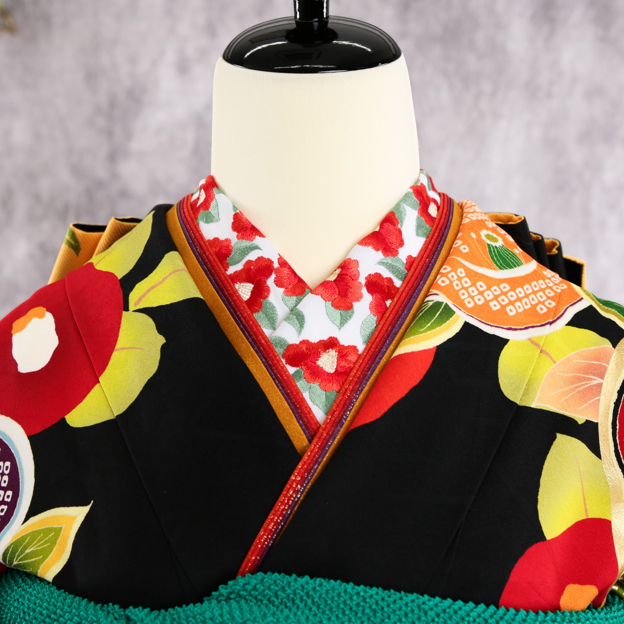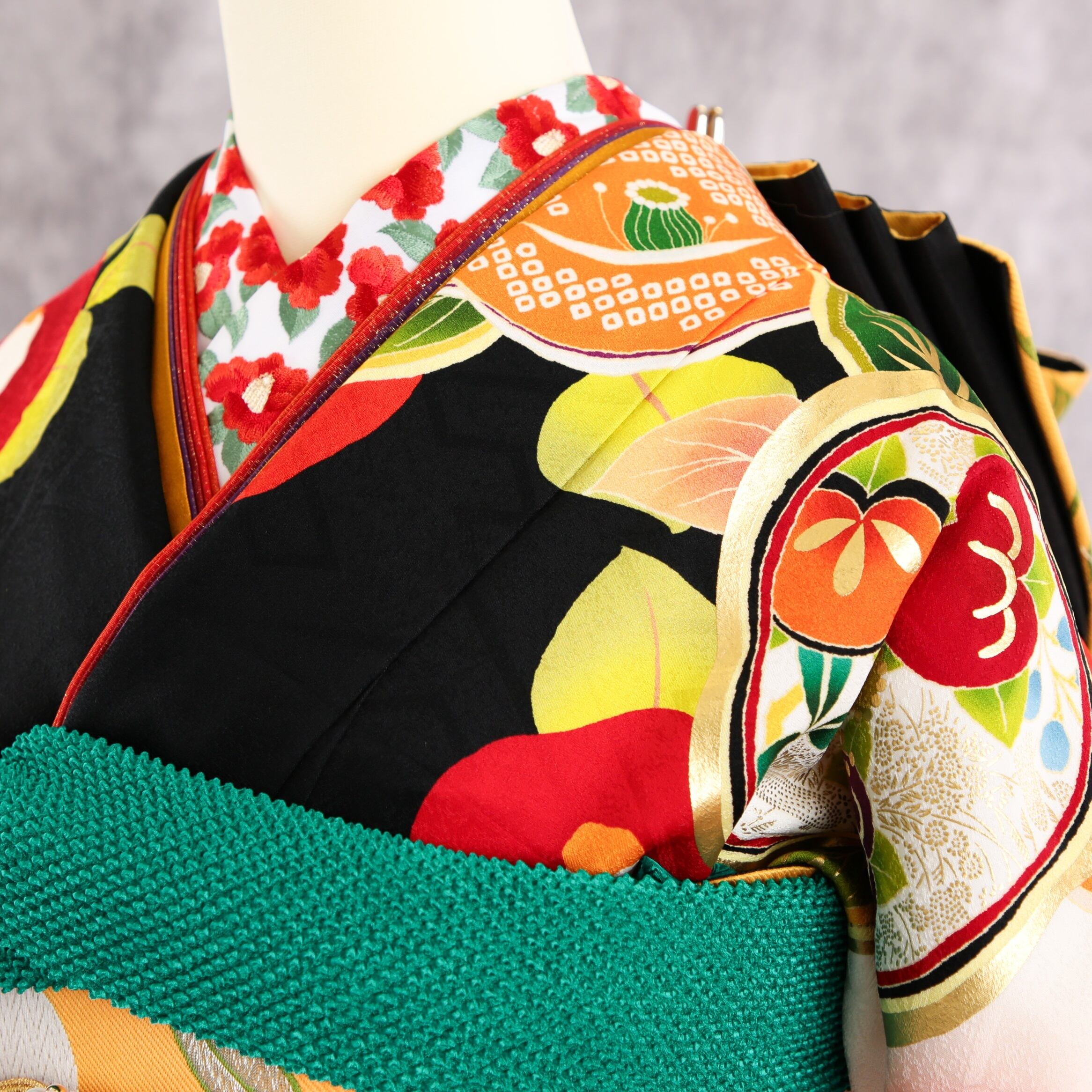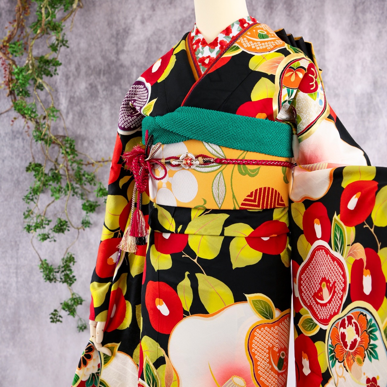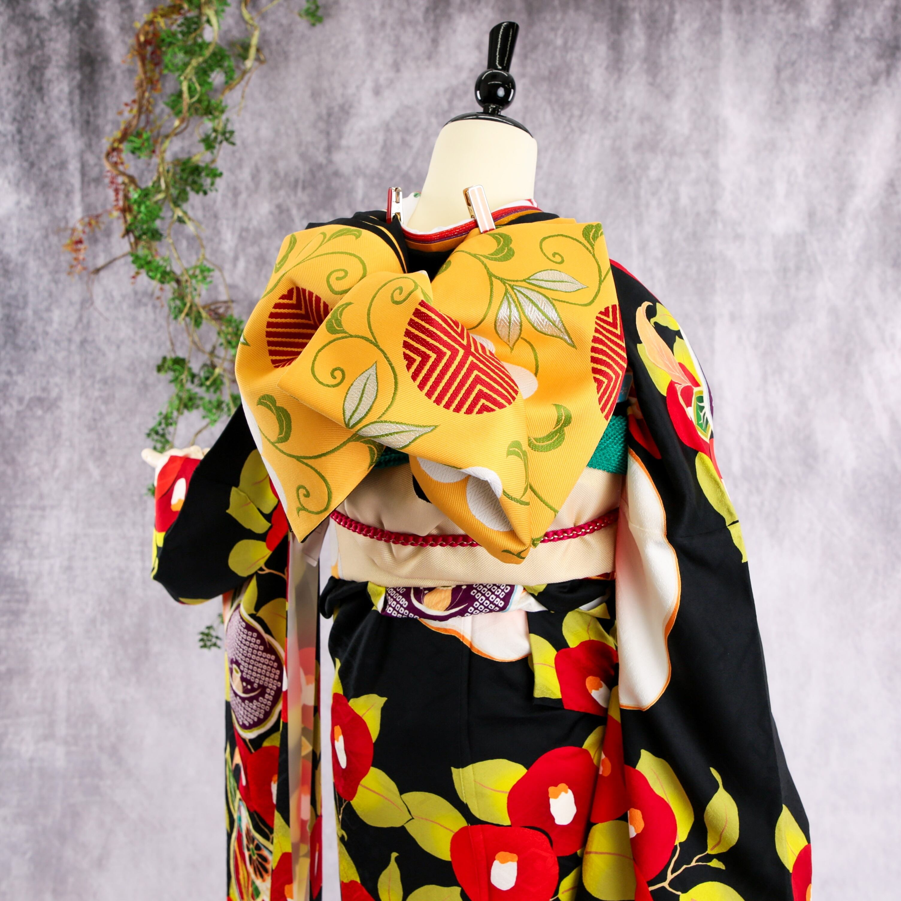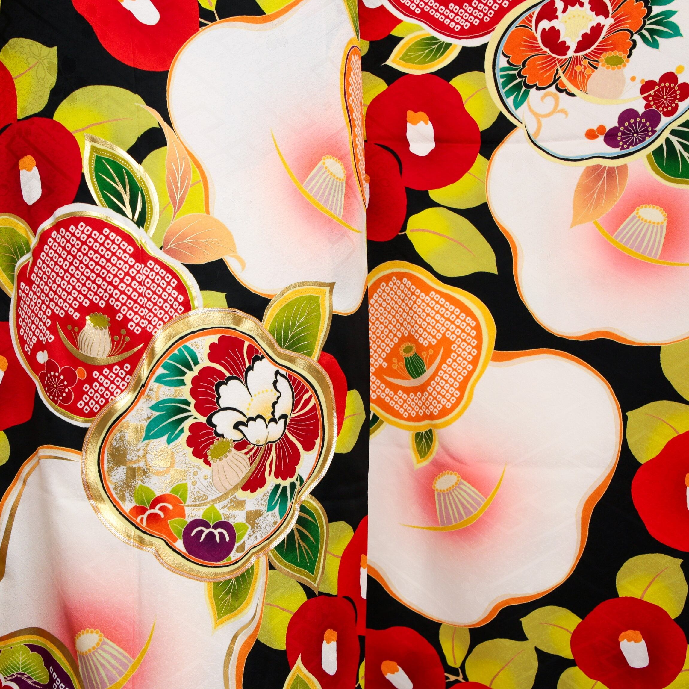 黒地に椿や金駒刺?が印象的なレトロ振袖です。