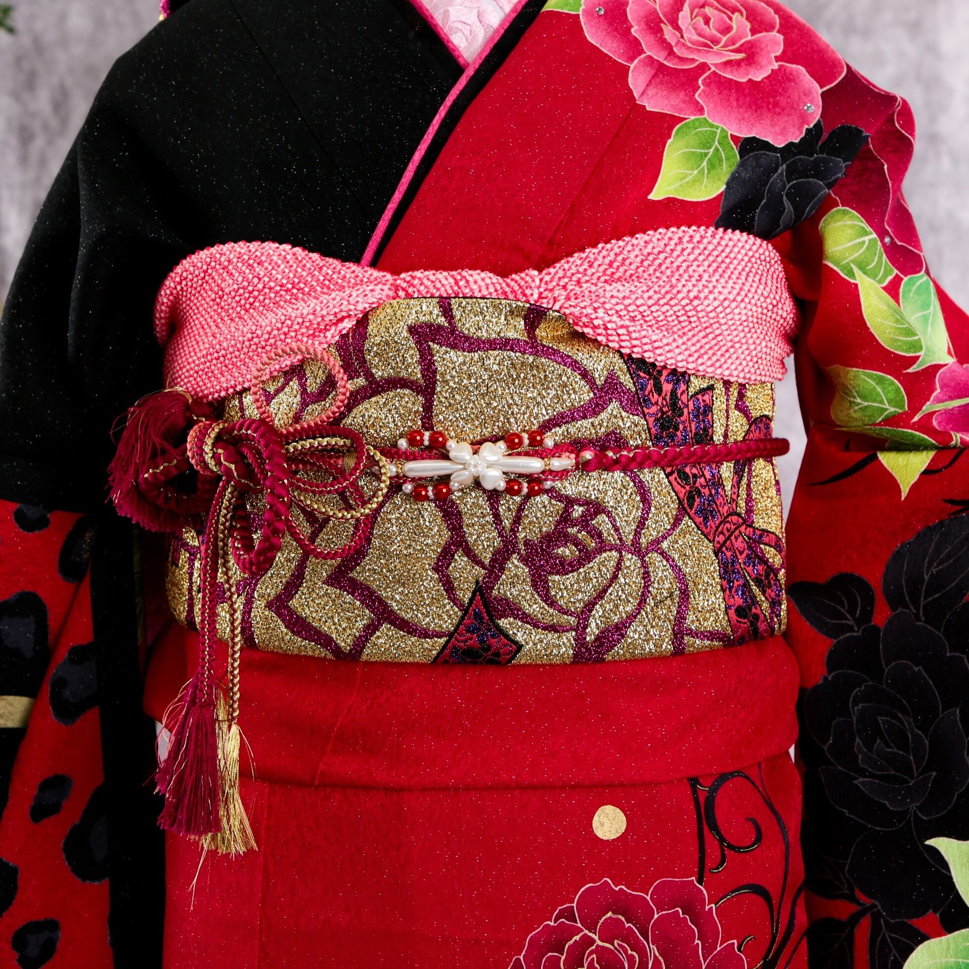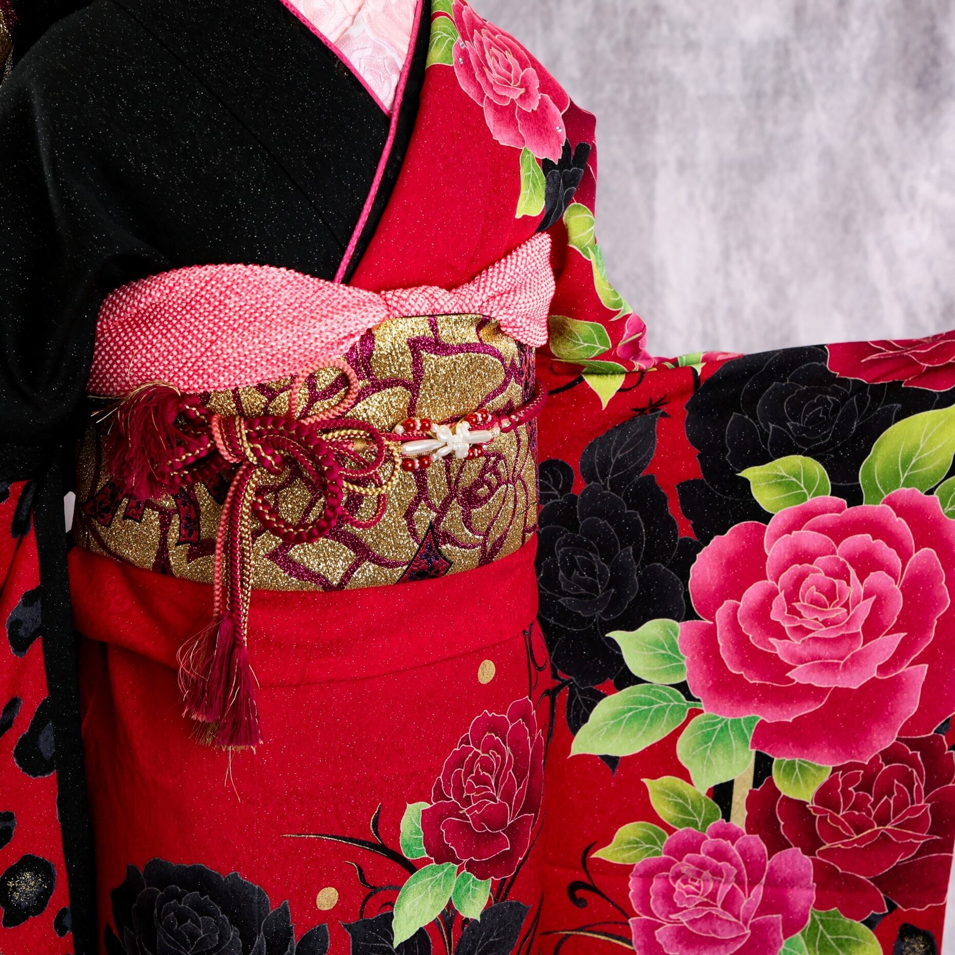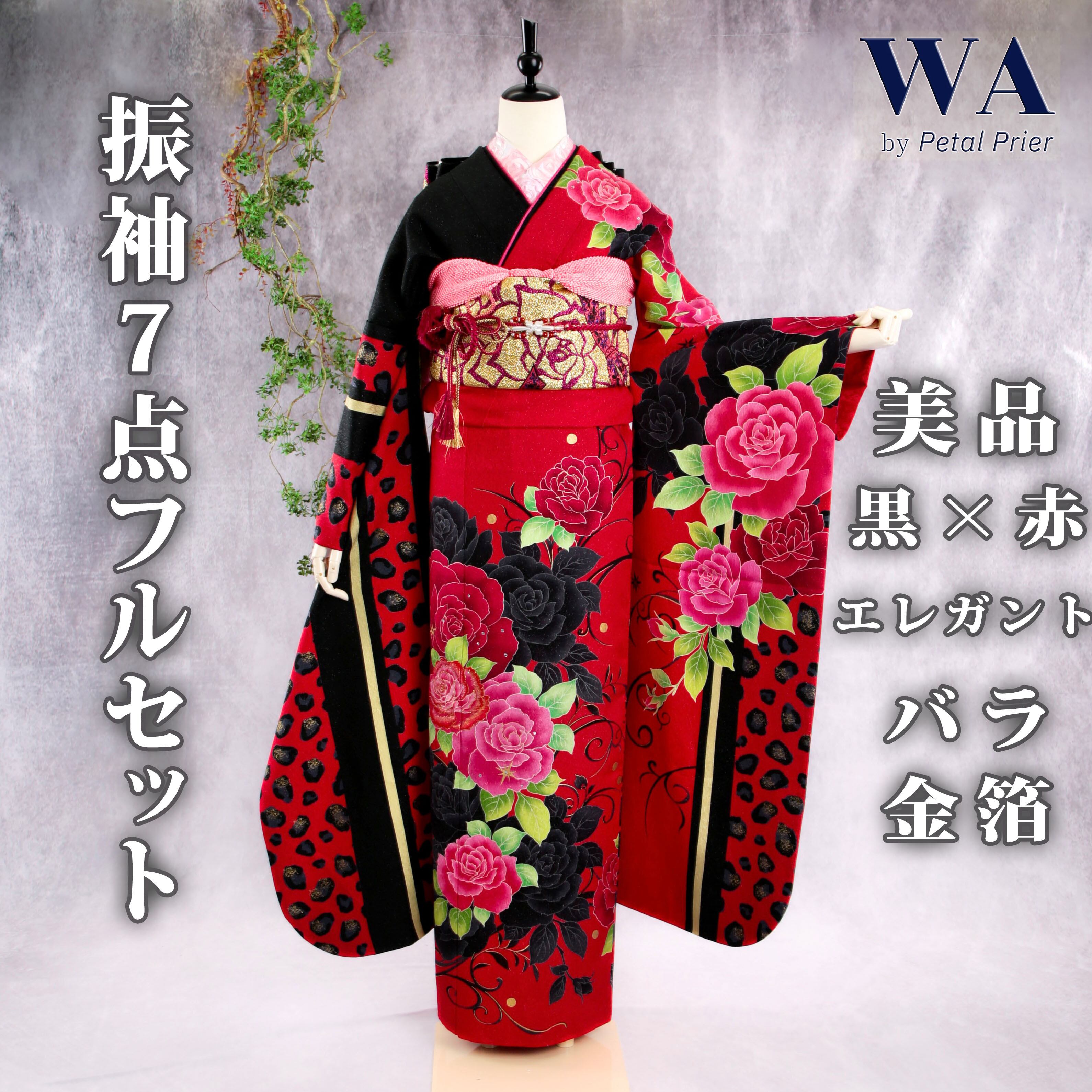 振袖フルセット 振袖セット 振袖 LLワイドサイズ 赤×薔薇 美品 成人式 着物 晴れ着 7点フルセット F-523