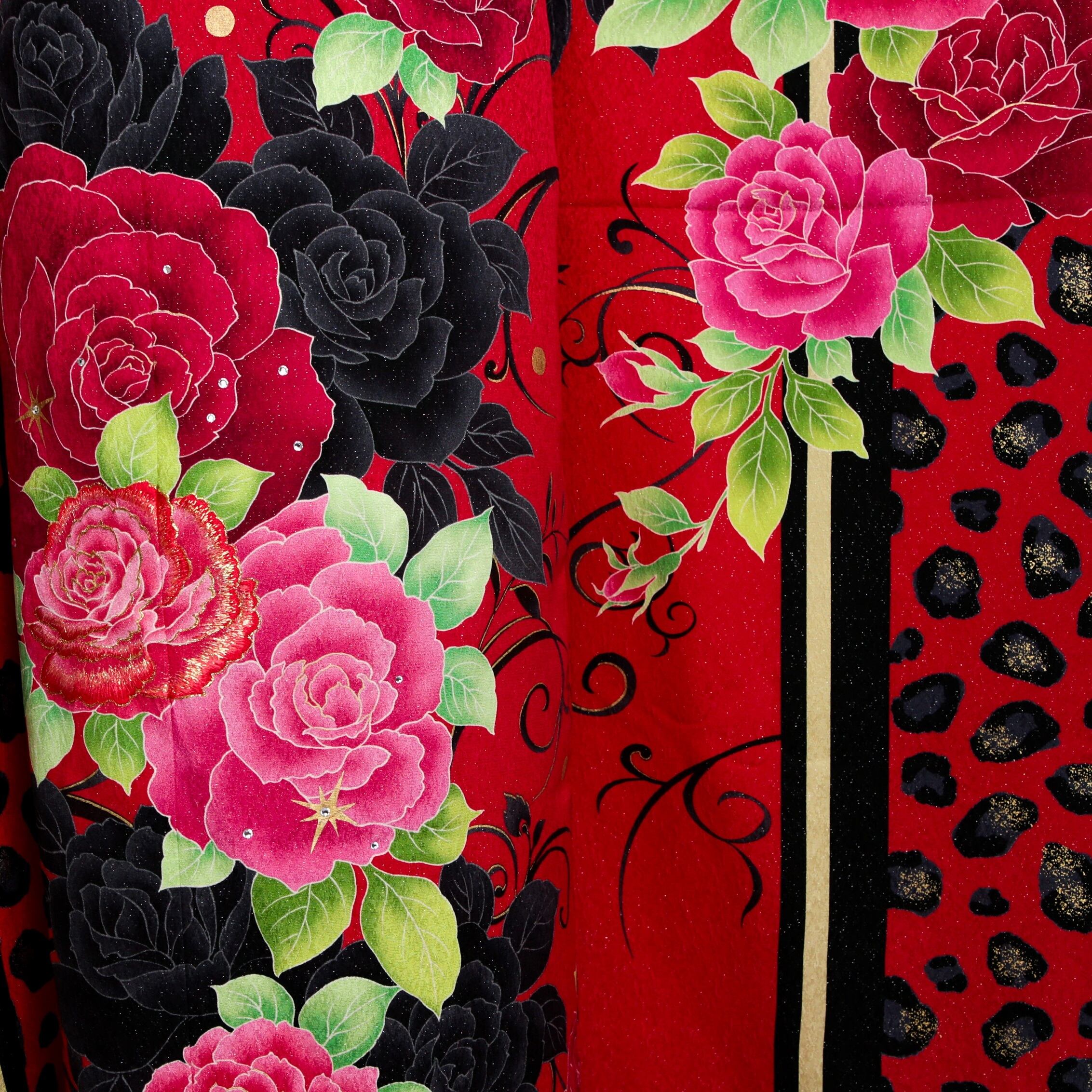 赤地に薔薇やヒョウ柄がワイルドな振袖です。