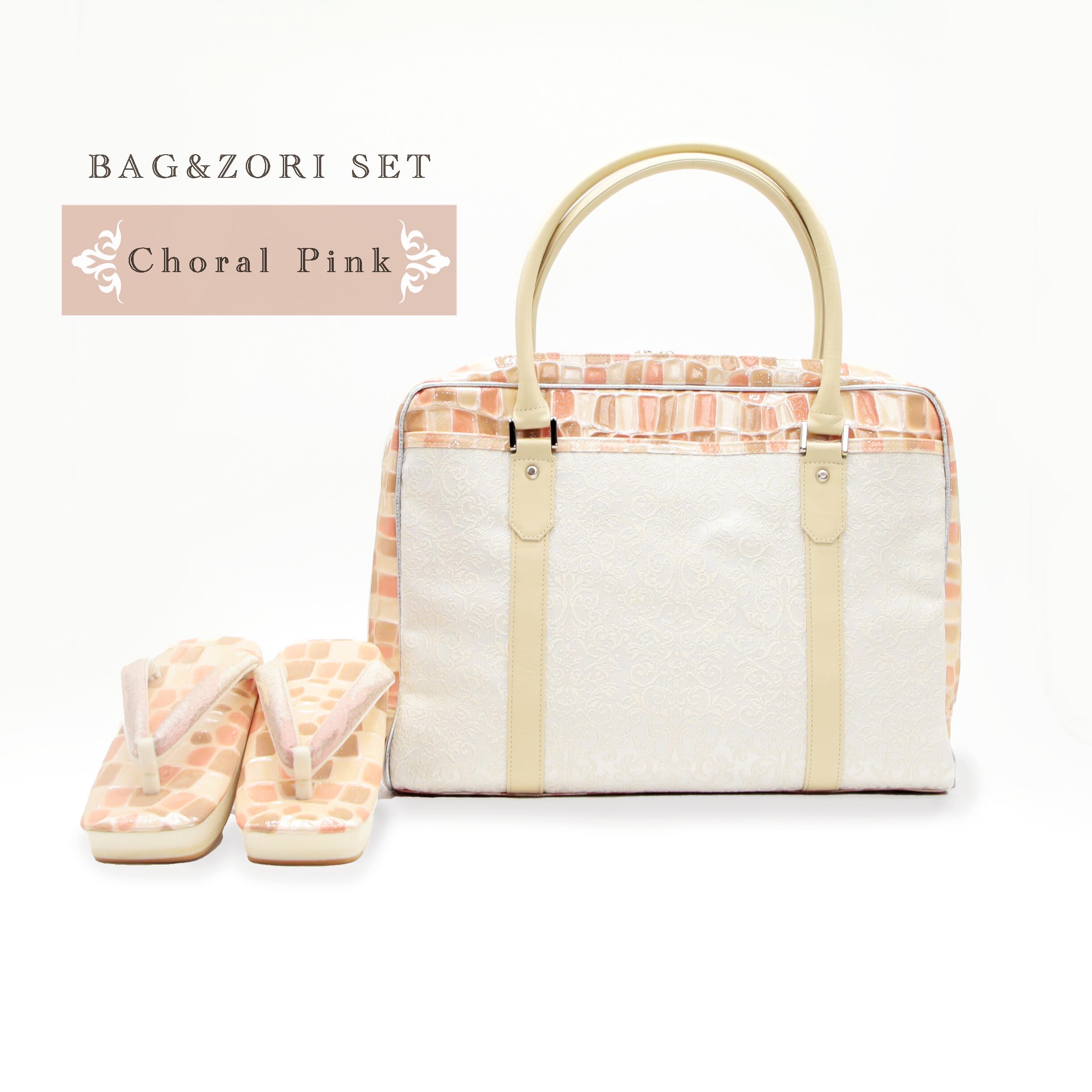 草履バッグ 草履バック 草履バッグセット 新品・未使用 うれしづくし 着物 カジュアル 小紋 紬 洒落着 牛革 トートバッグ 和装バッグ 帯地 A4 ピンク オレンジ コーラル フリーサイズ Fサイズ Z-183