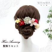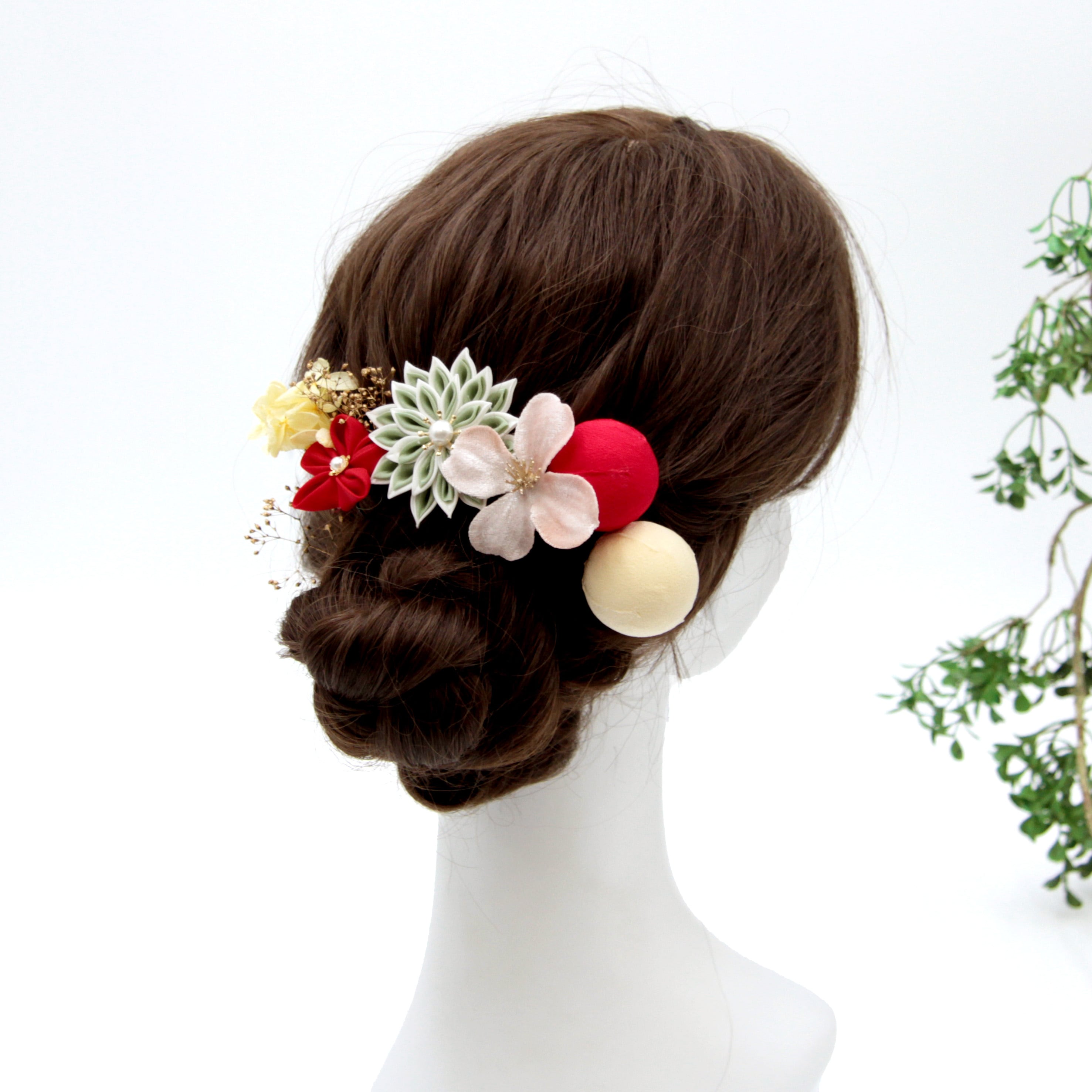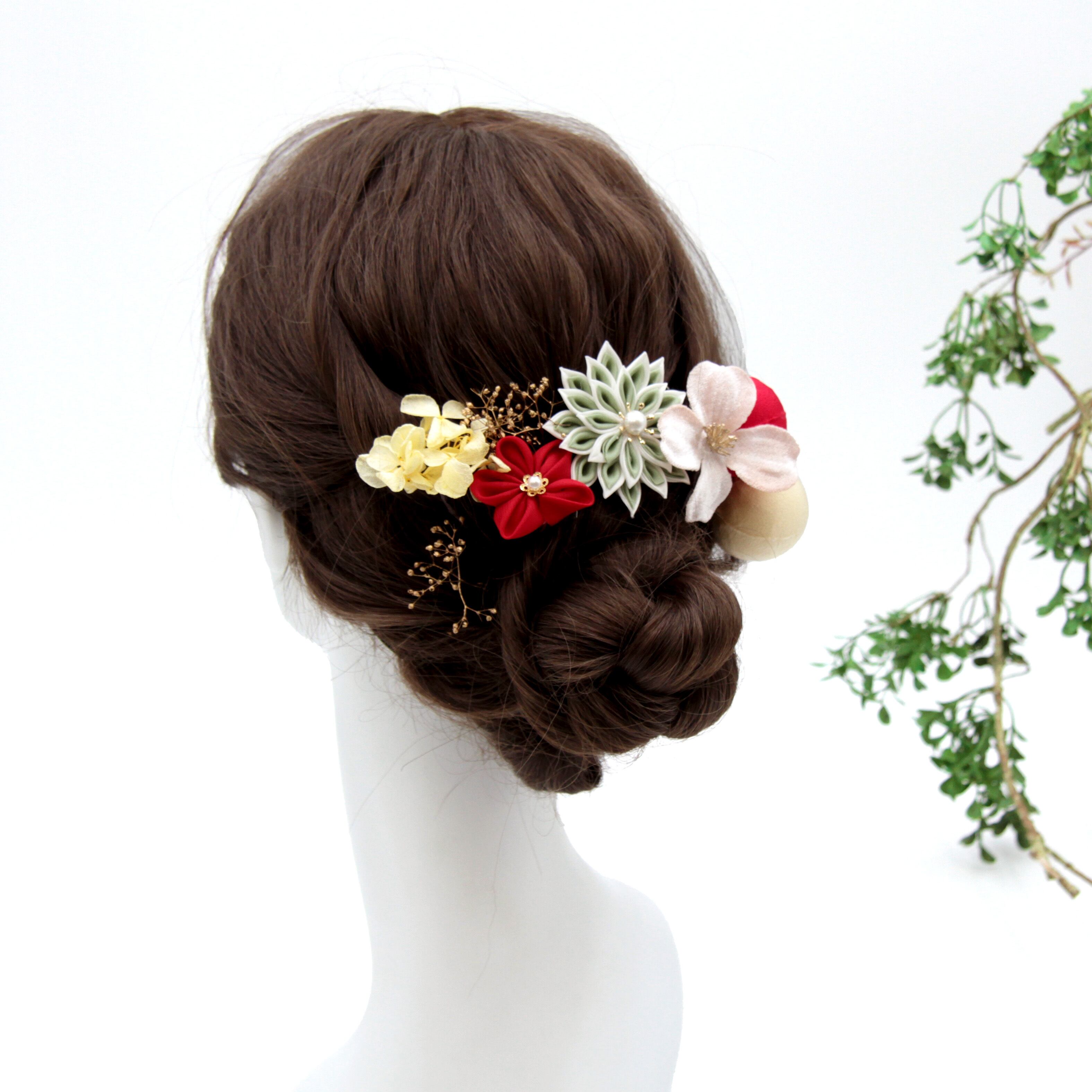 つまみ細工や和ボール等を使用した可愛らしい髪飾りです。
