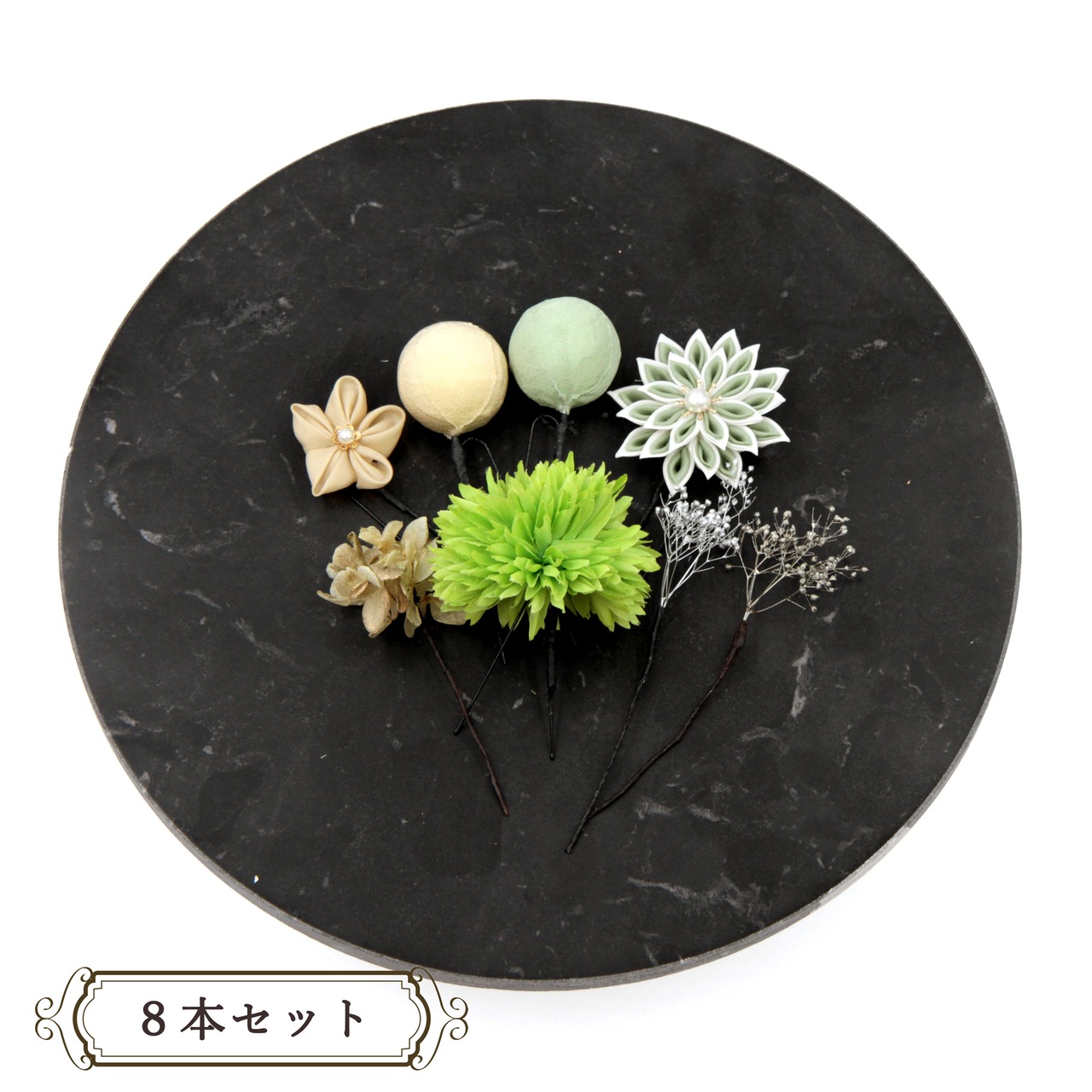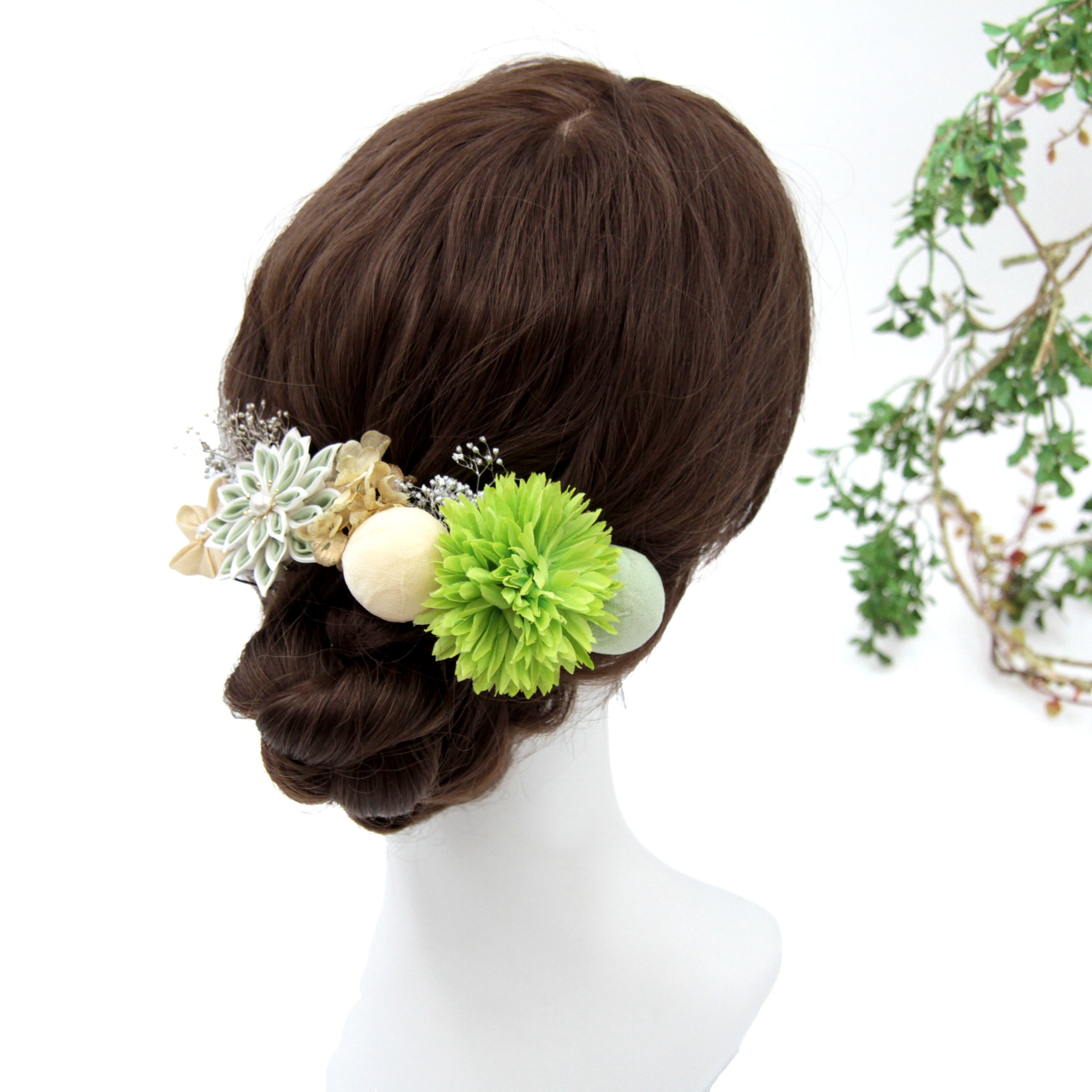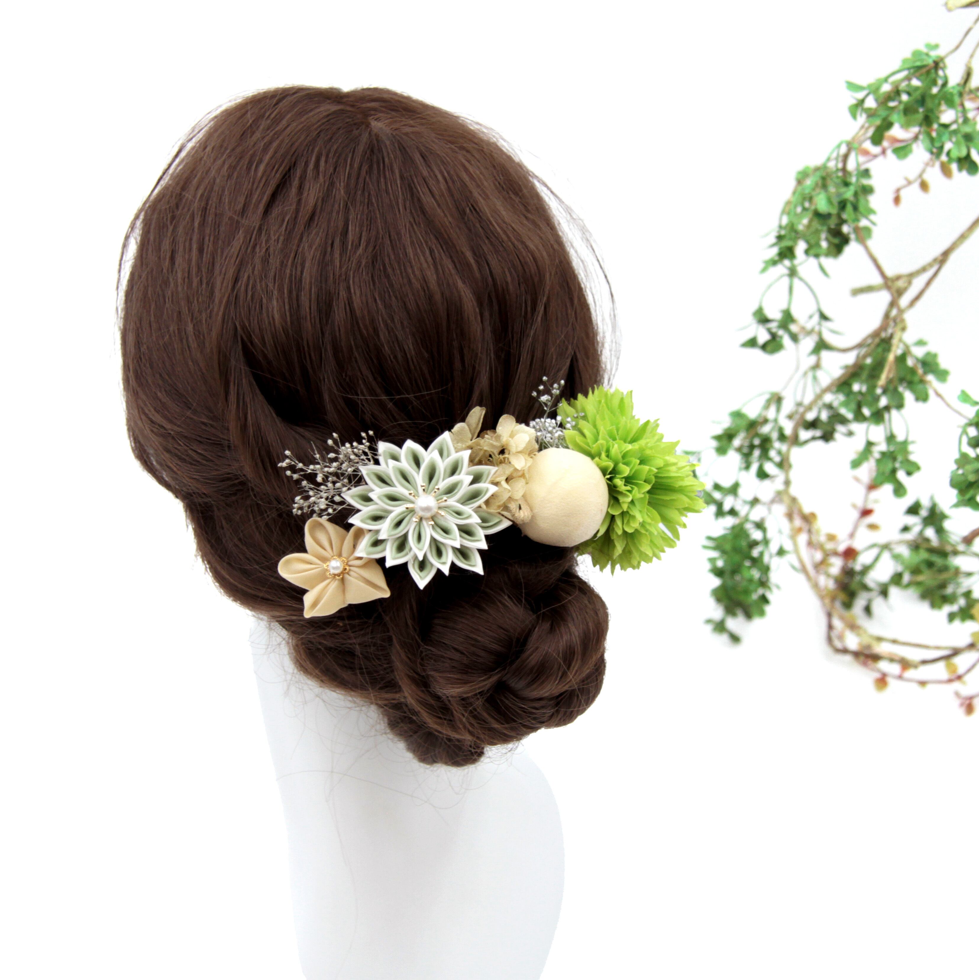 グリーン×ベージュ色でまとめたナチュラルで可愛い髪飾り。