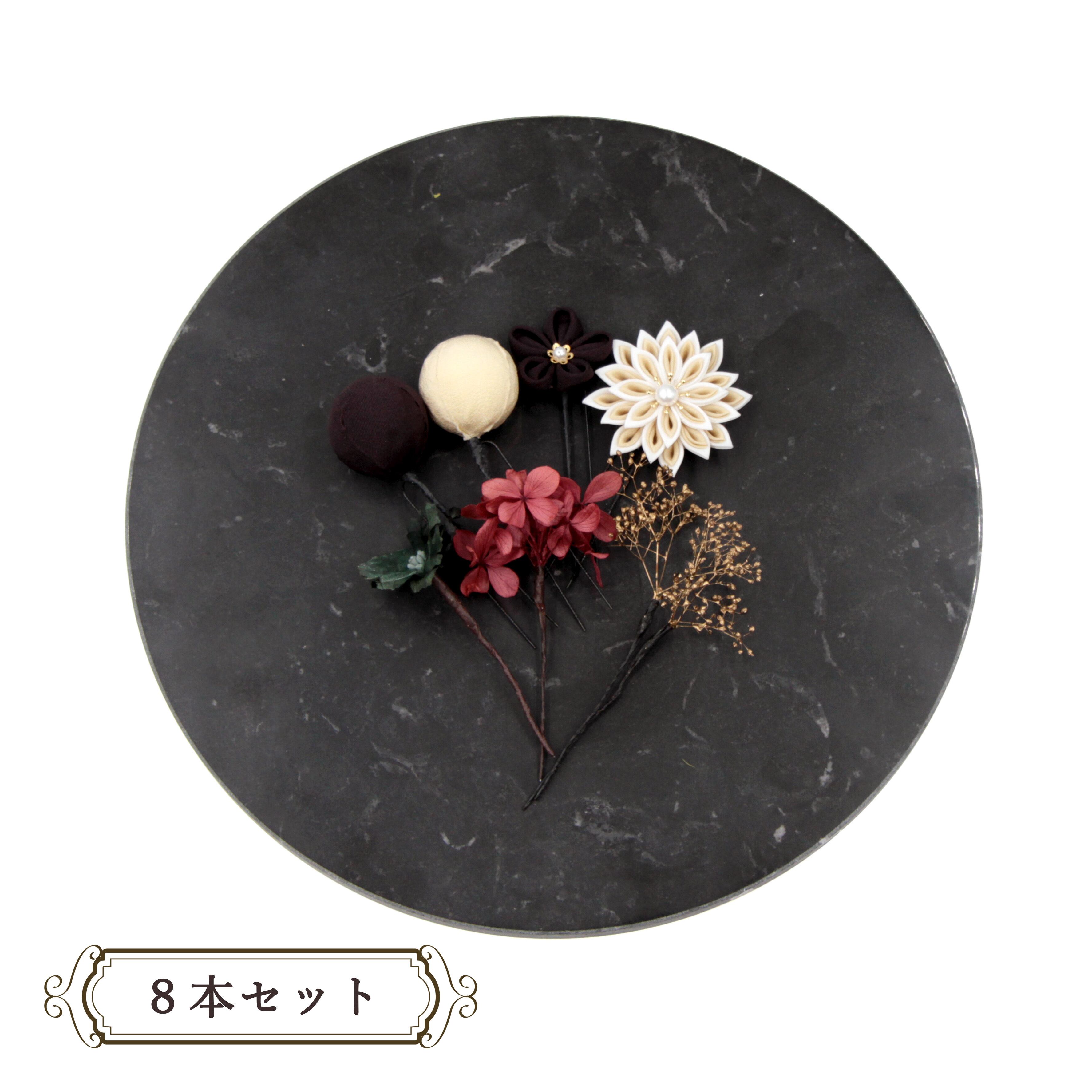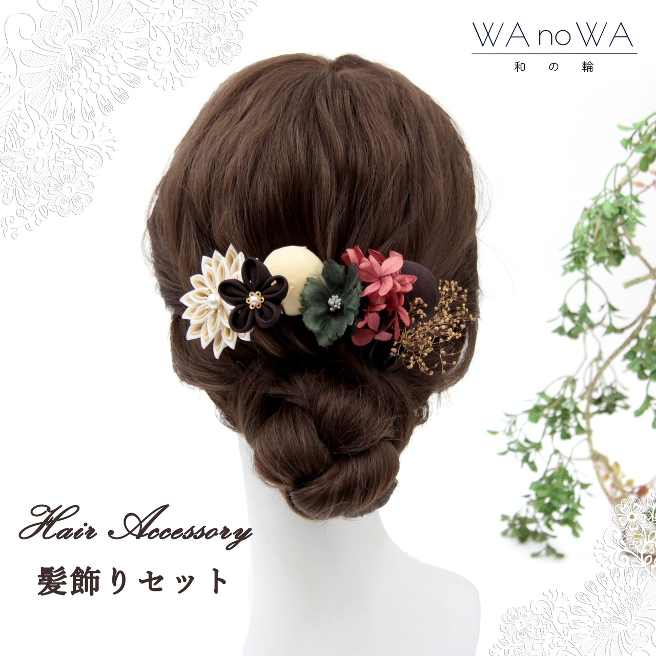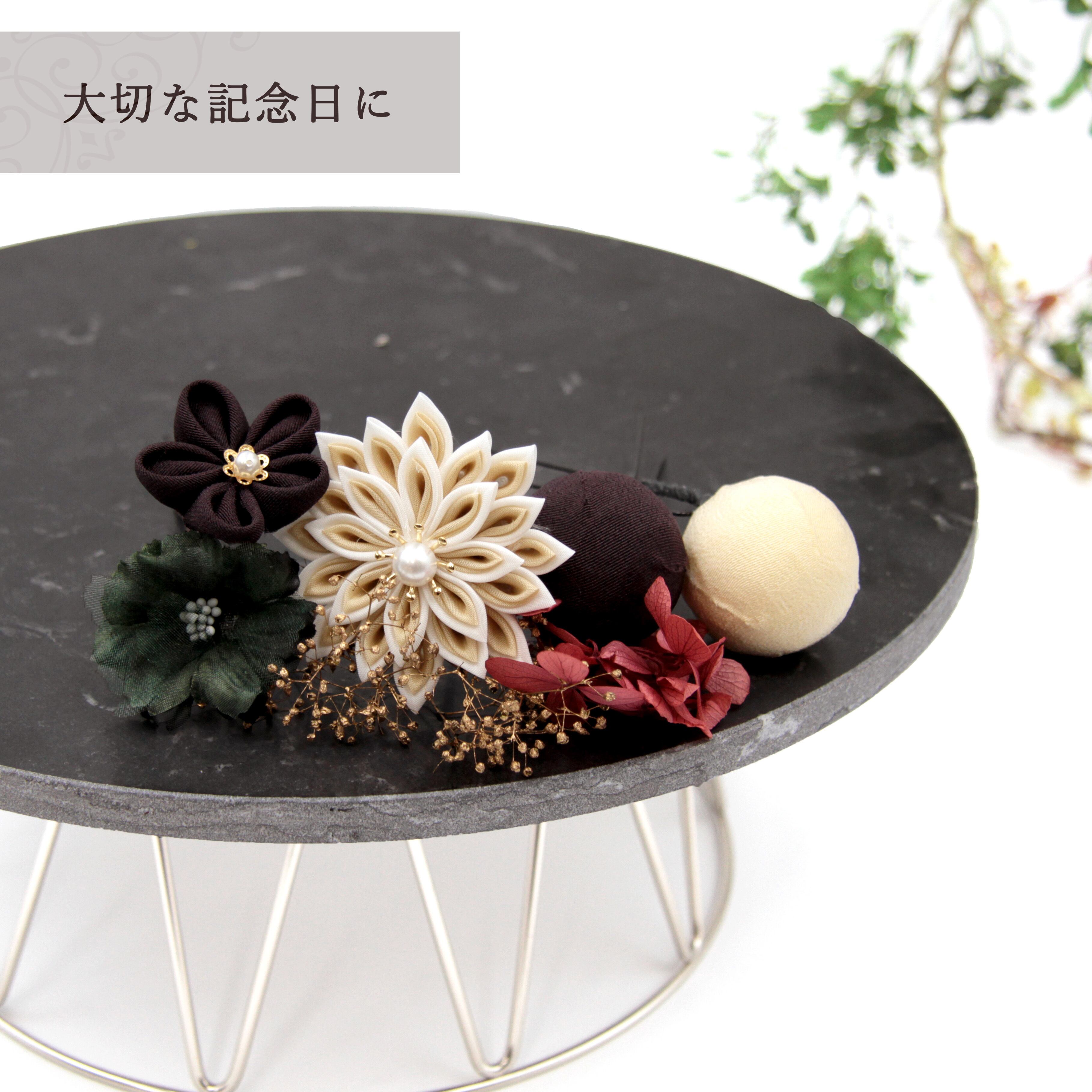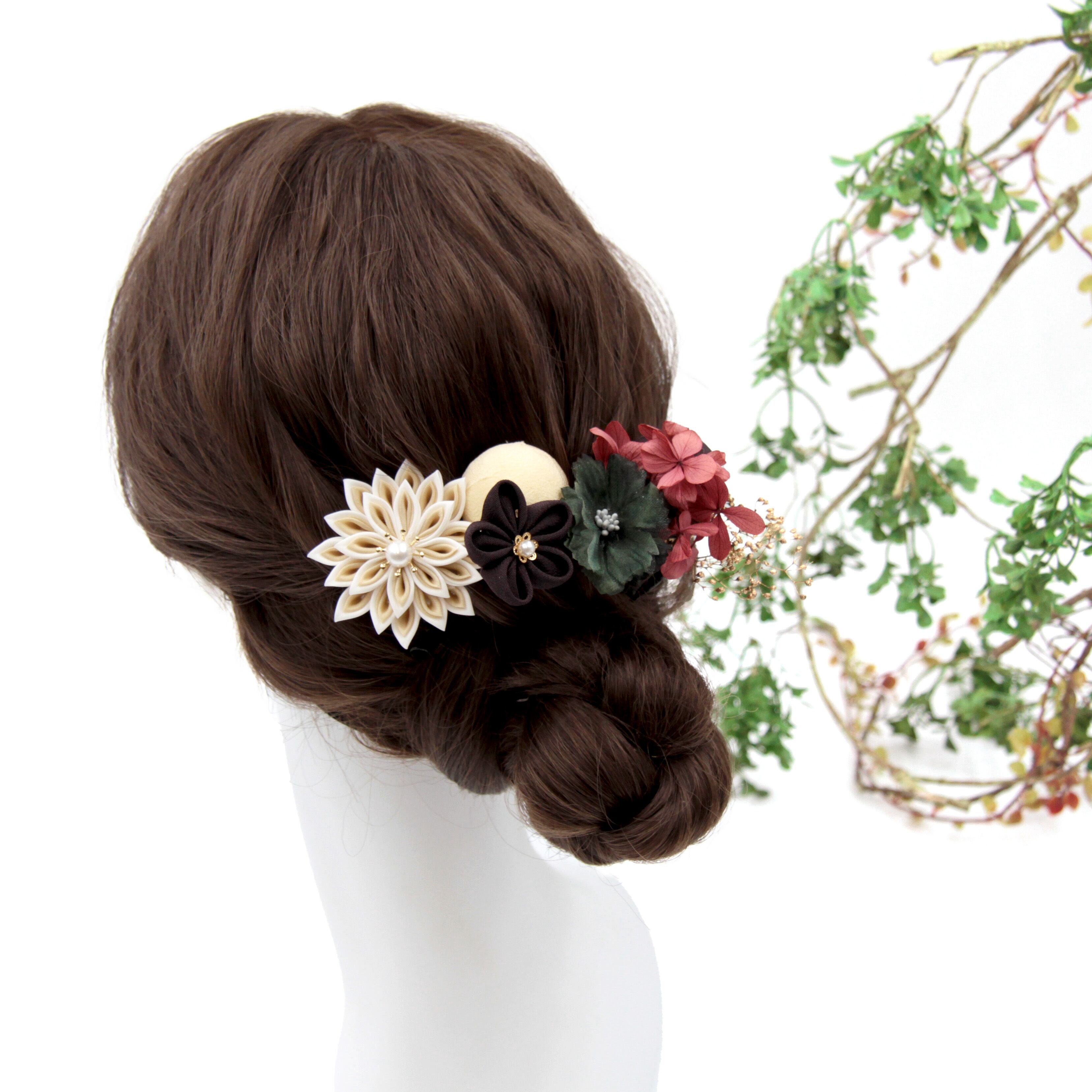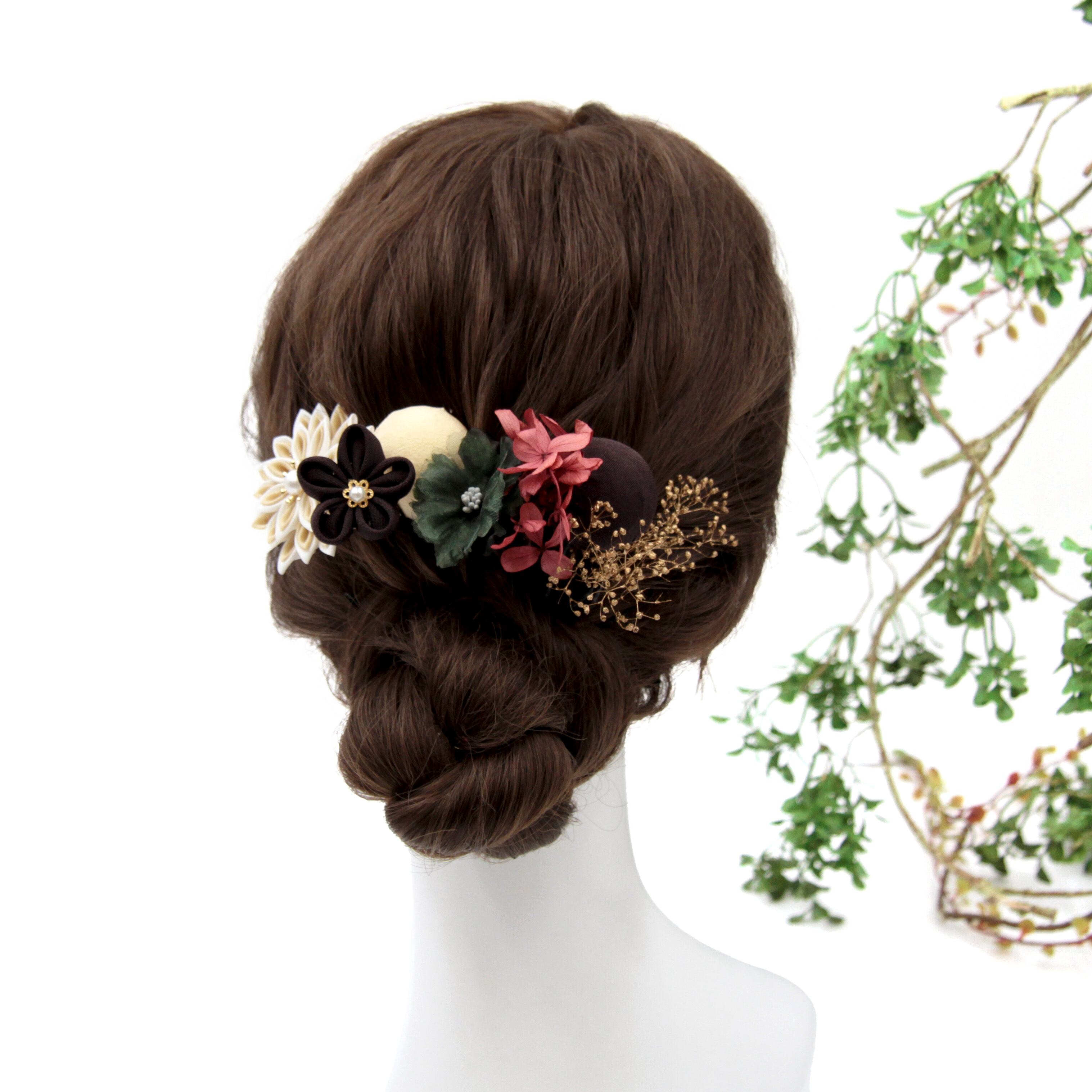 ベージュやブラウン、ボルドーといった落ち着いた色味の髪飾り。