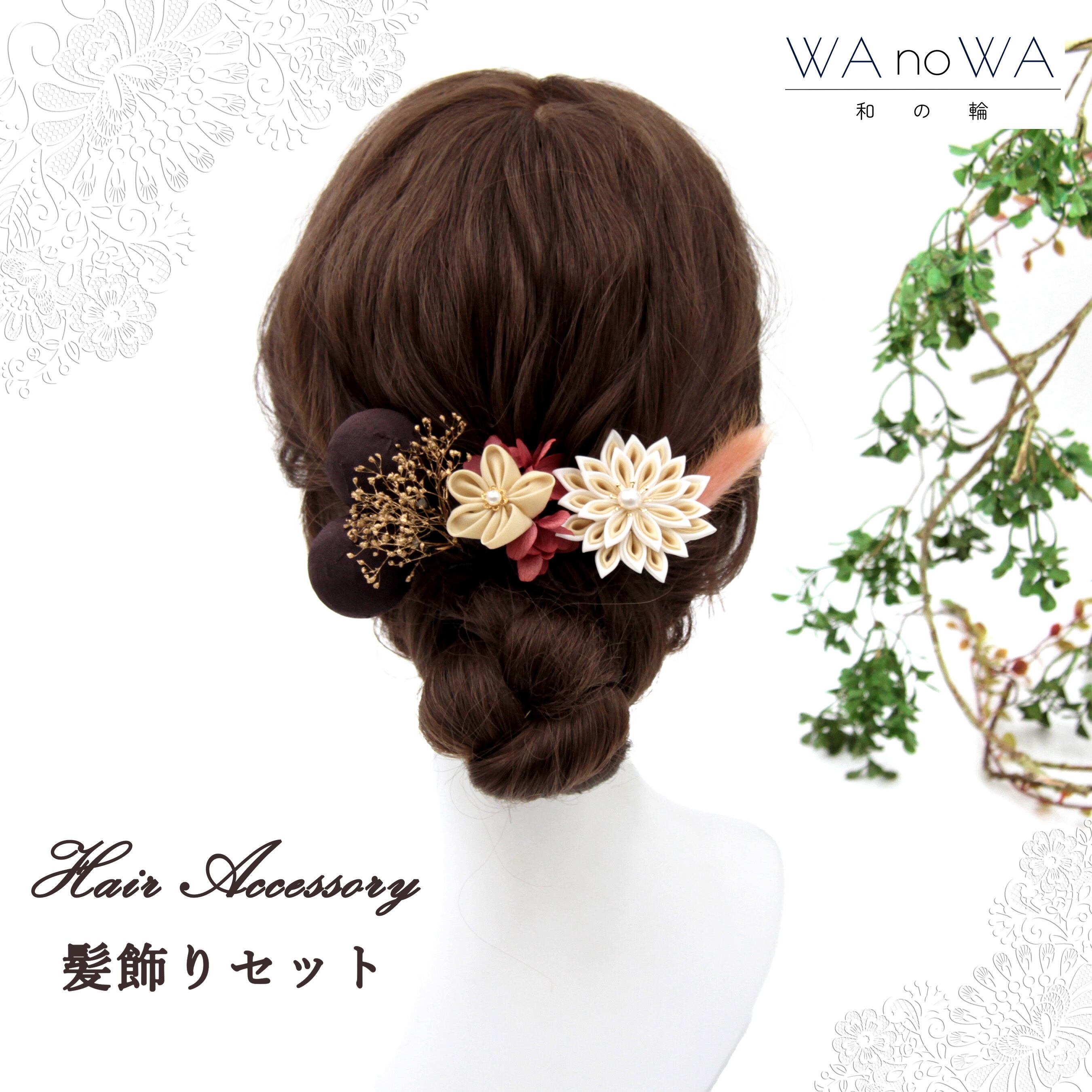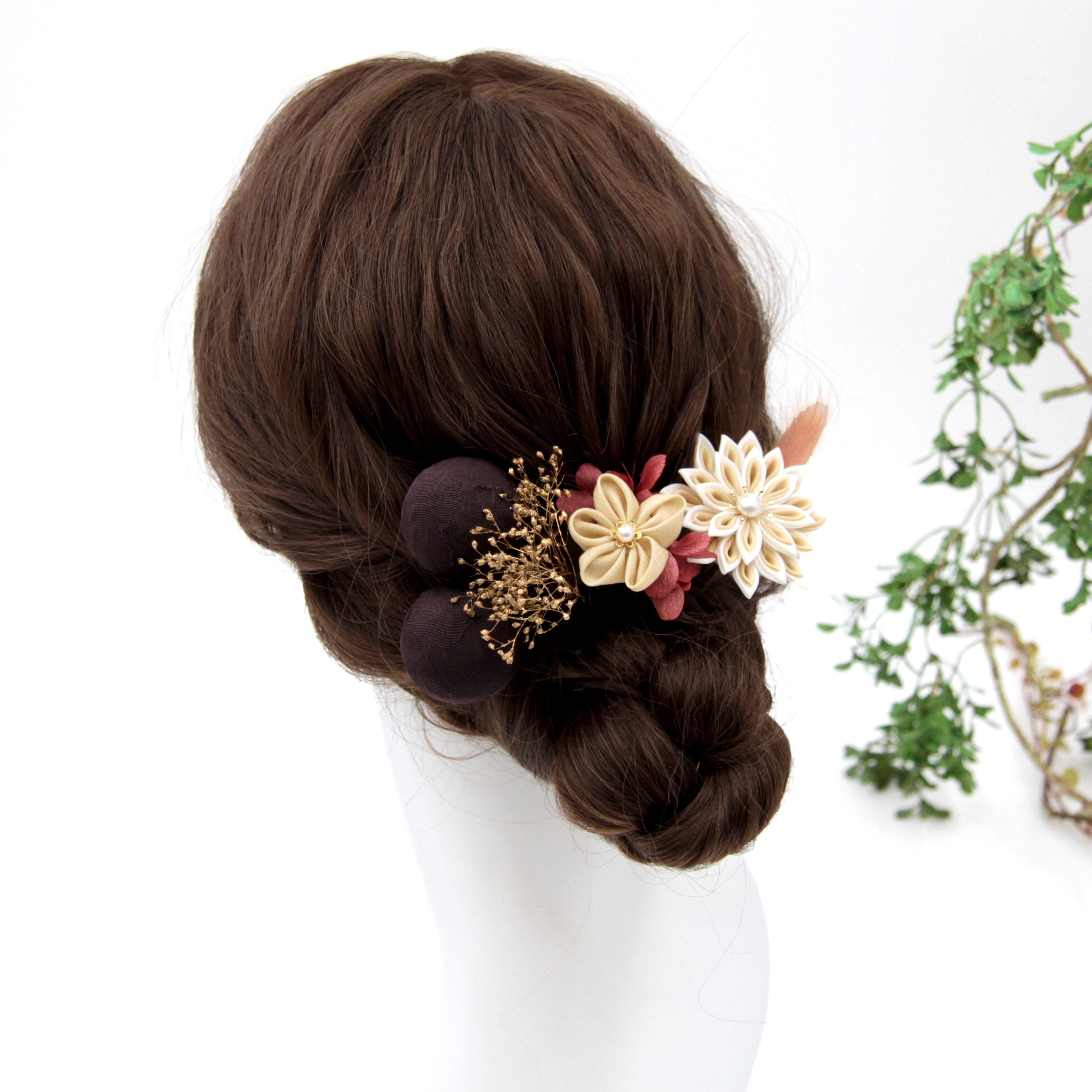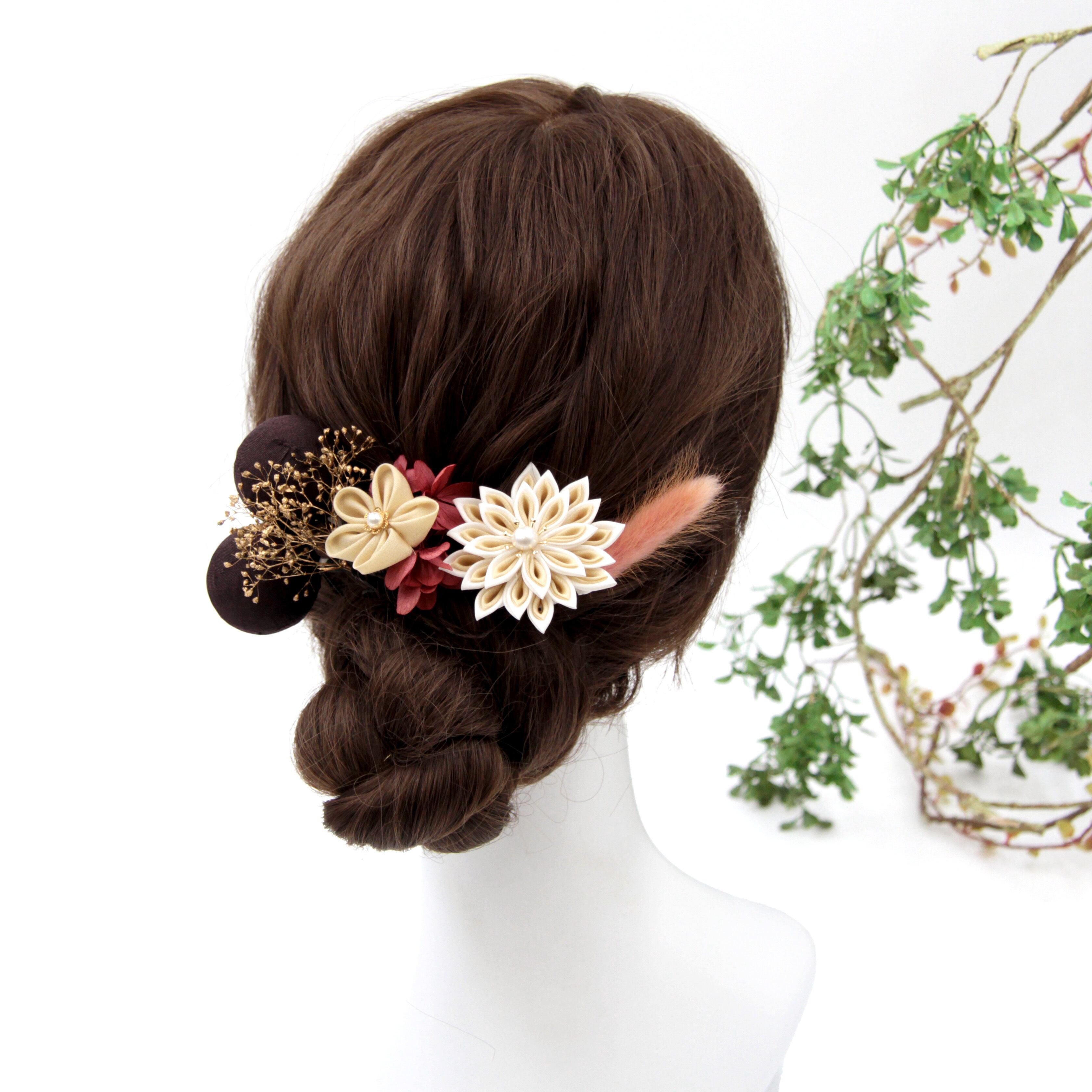 ベージュやブラウン、ピンク色でまとめた可愛らしい髪飾り。