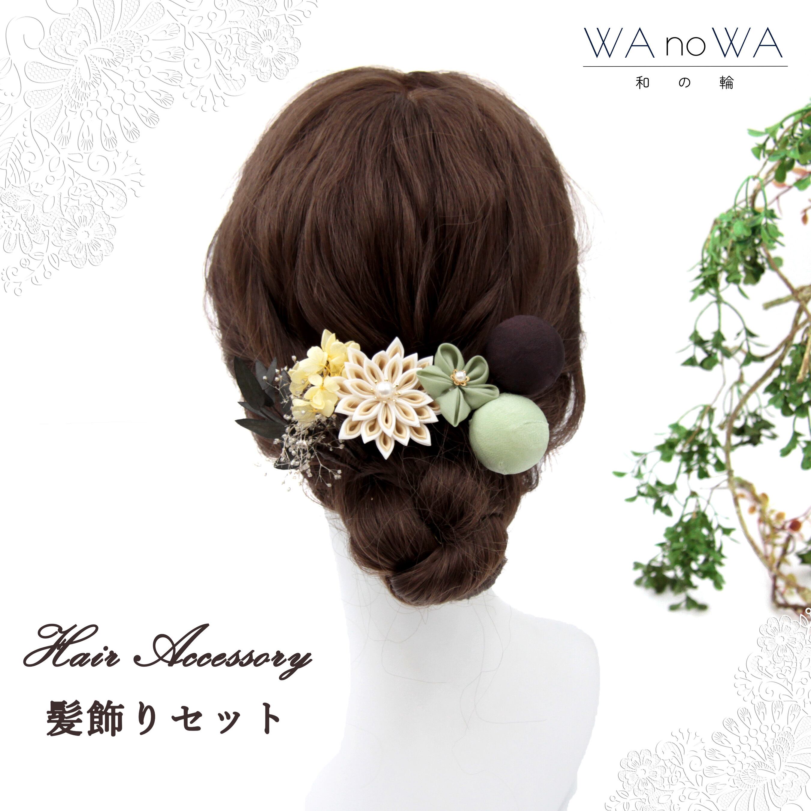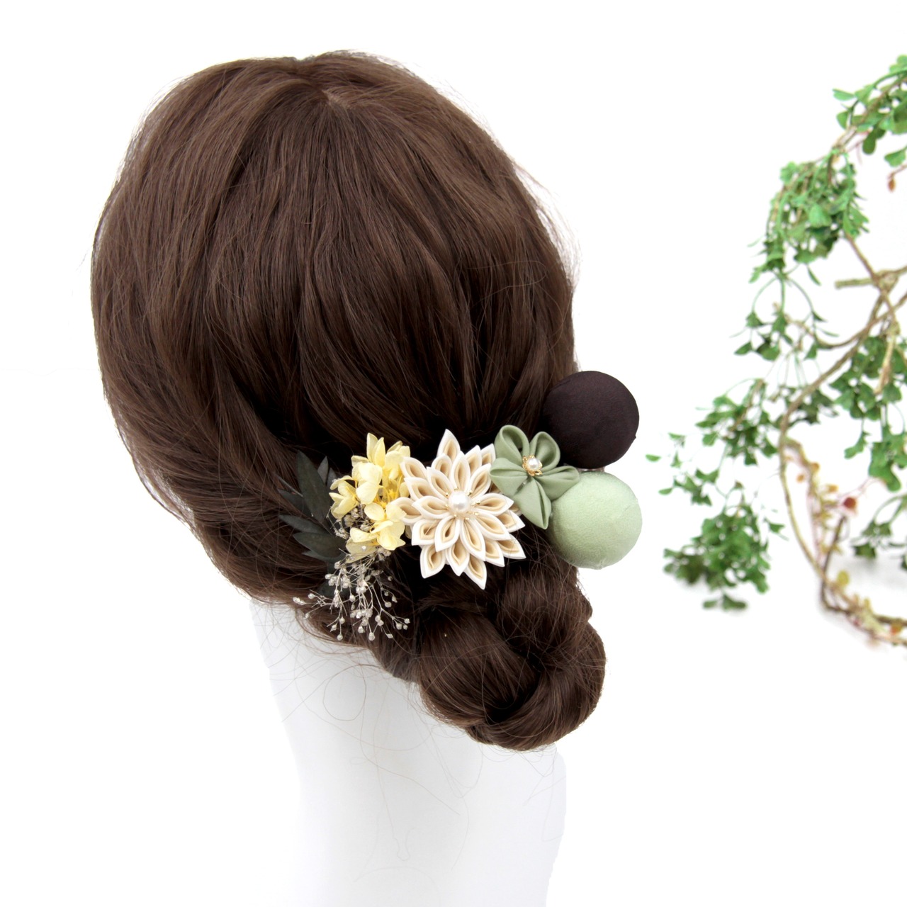 緑やブラウンなど落ち着いた色味でまとめた髪飾り。
