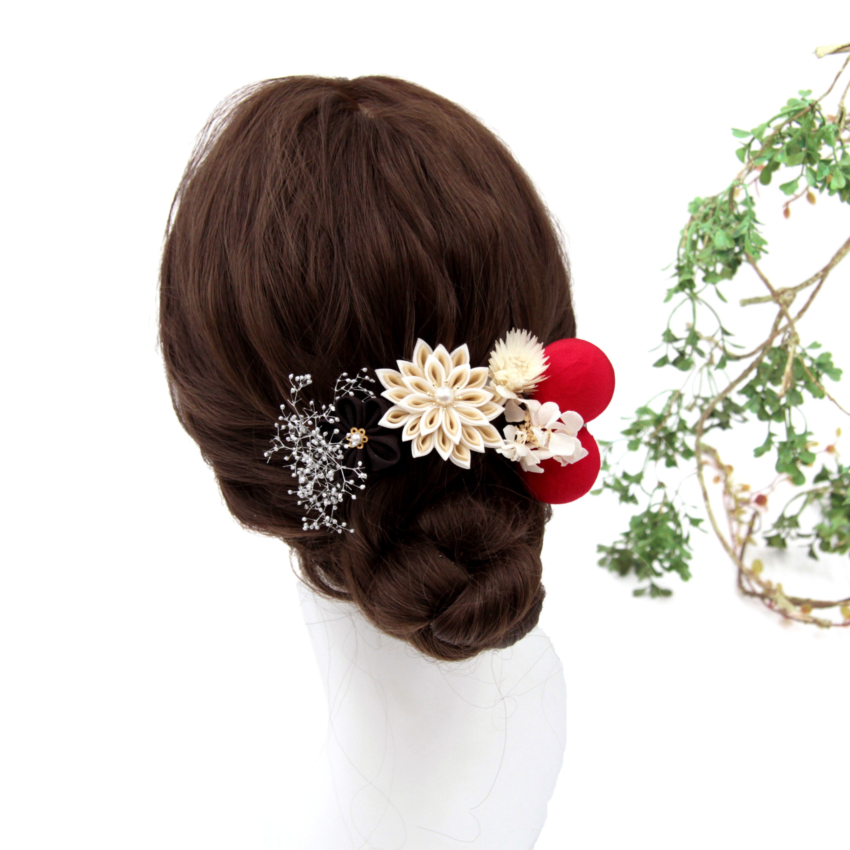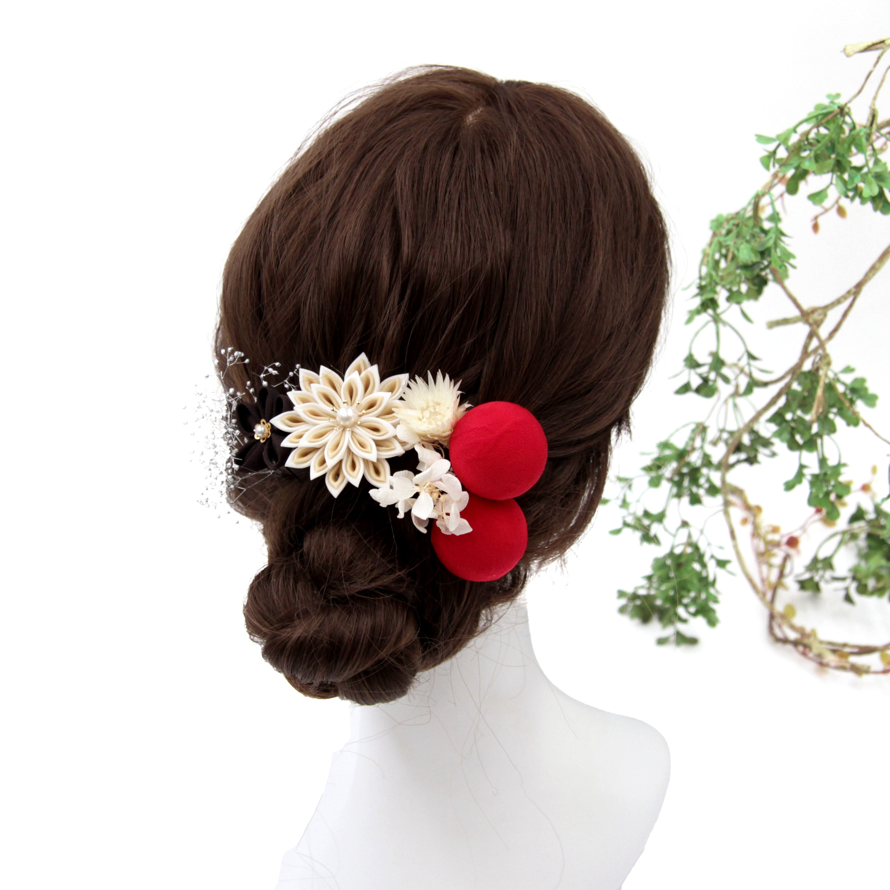 赤いつまみボールが差し色となっている可愛らしい髪飾り。
