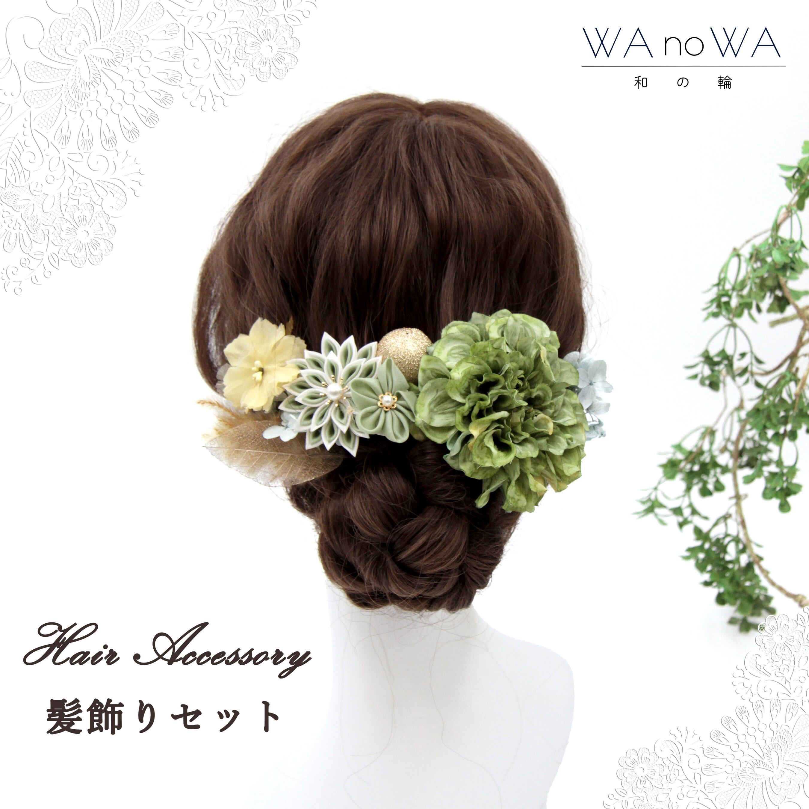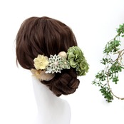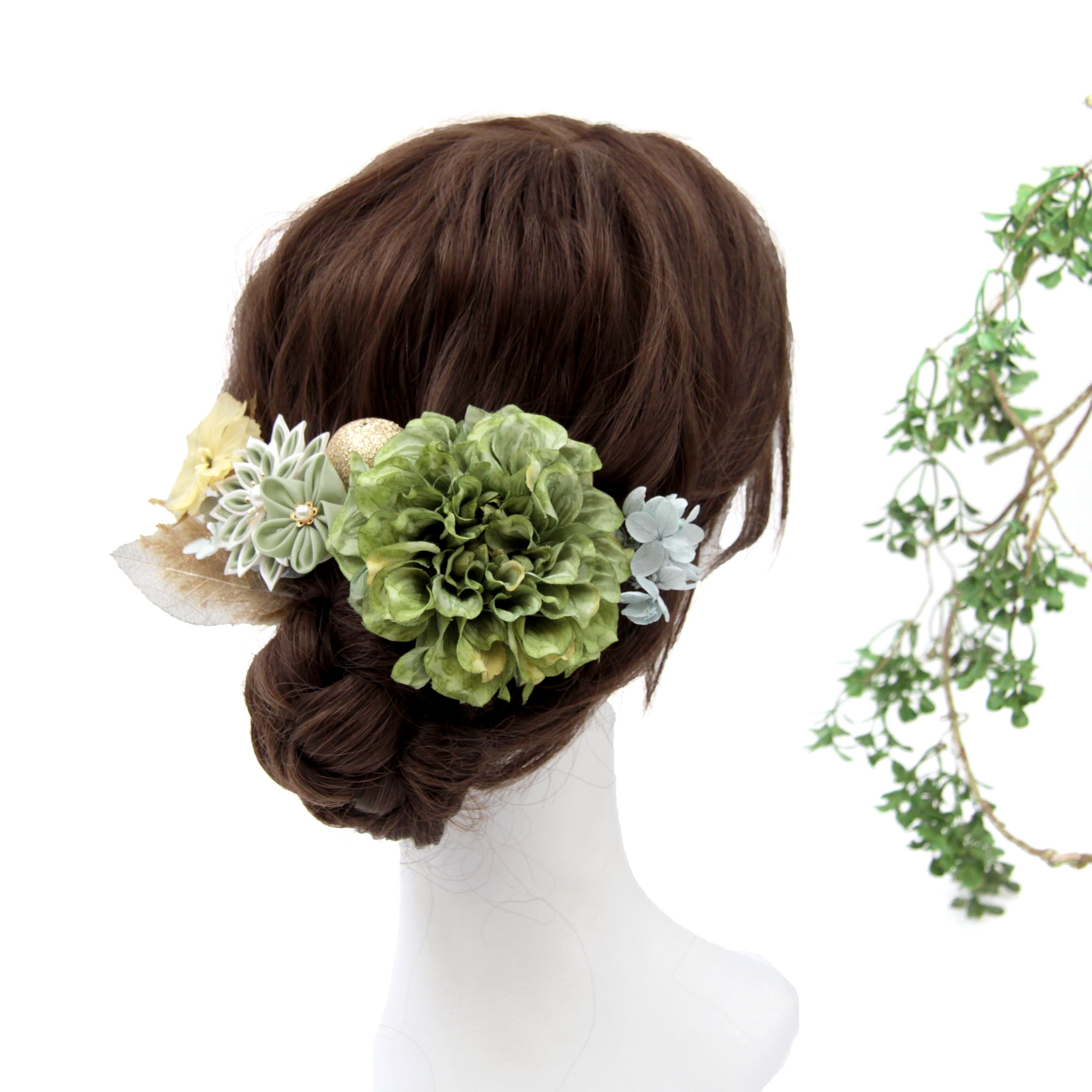 大きなくすみグリーンのダリアがポイントの髪飾り。