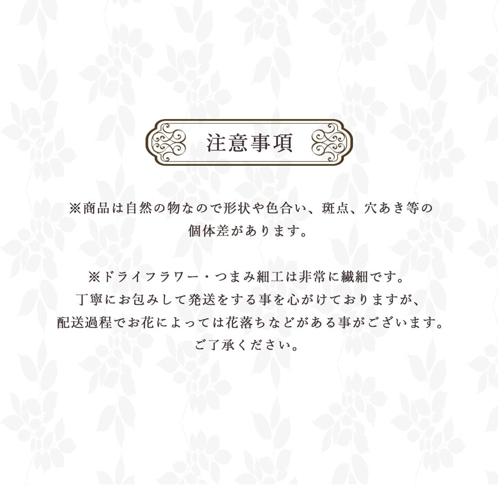 ※ドライフラワー・つまみ細工は非常に繊細です。丁寧にお包みして発送することを心がけておりますが、配送過程でお花によっては花落ちなどがある事がございます。ご了承ください。