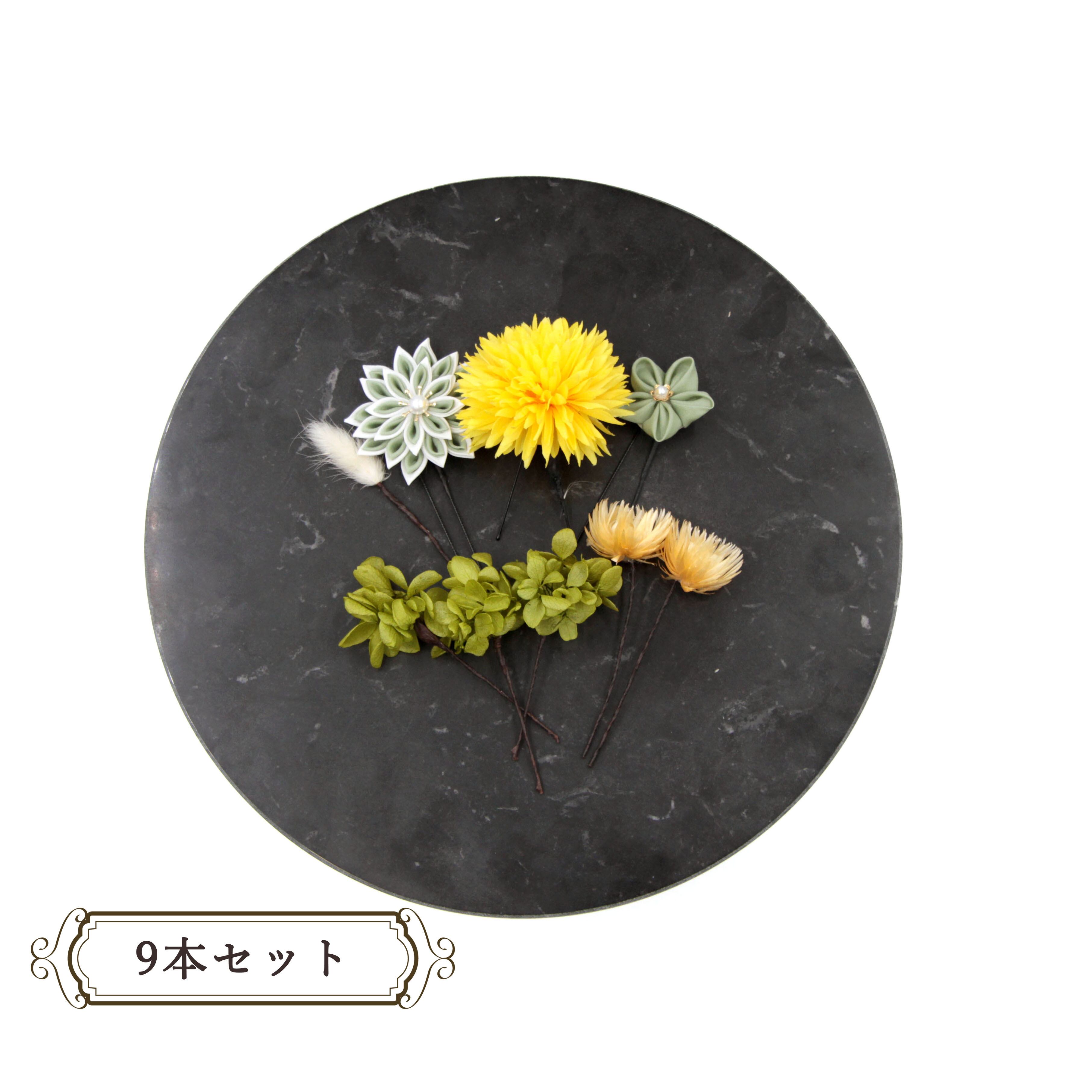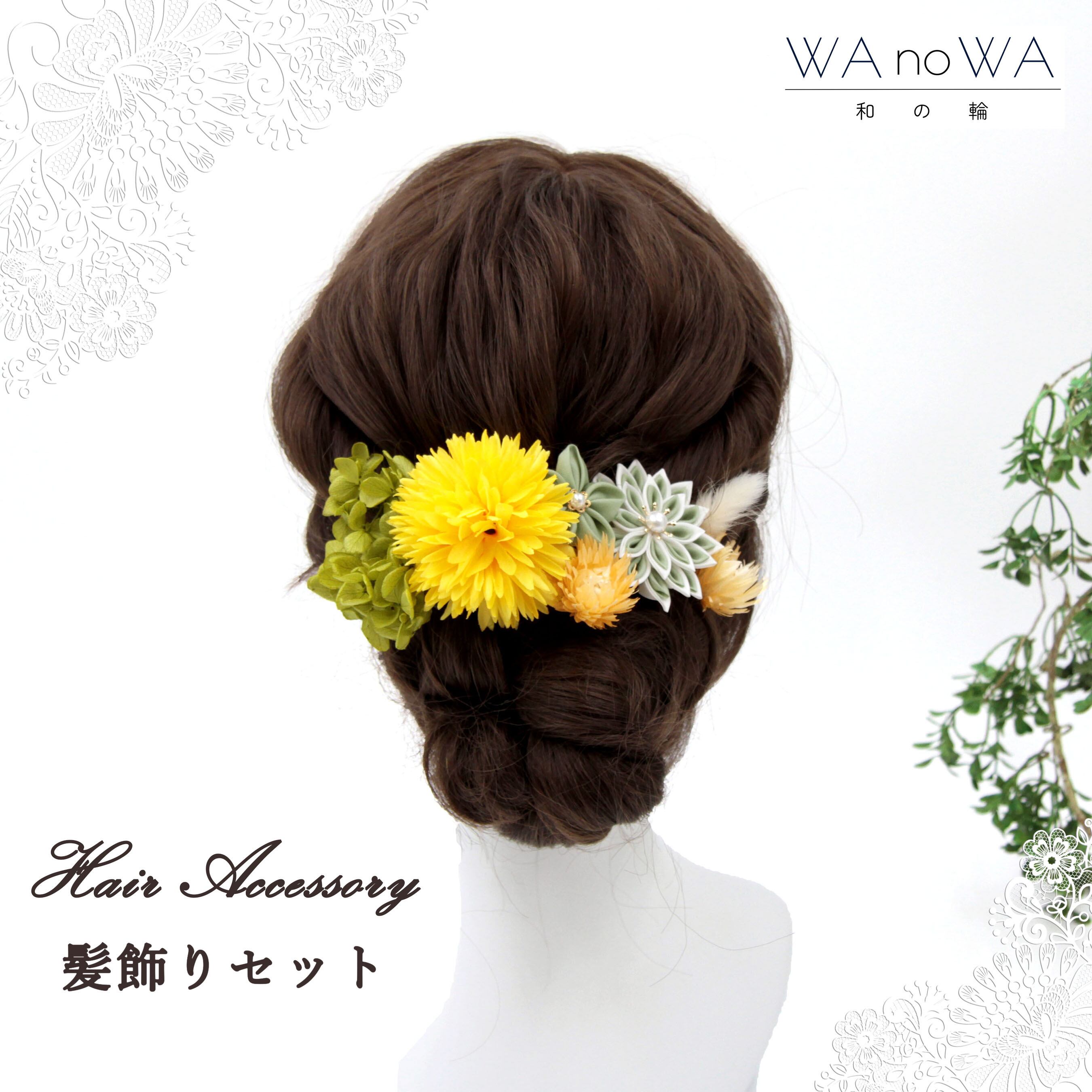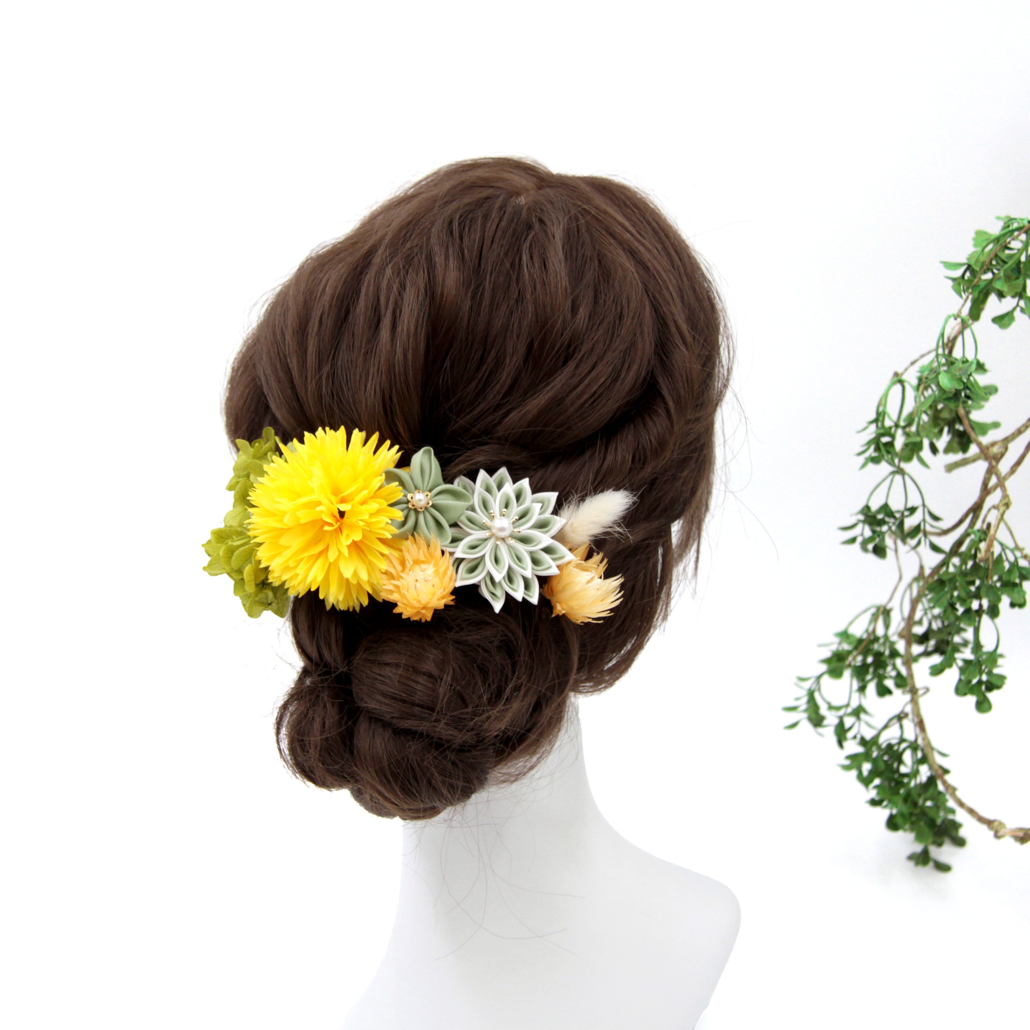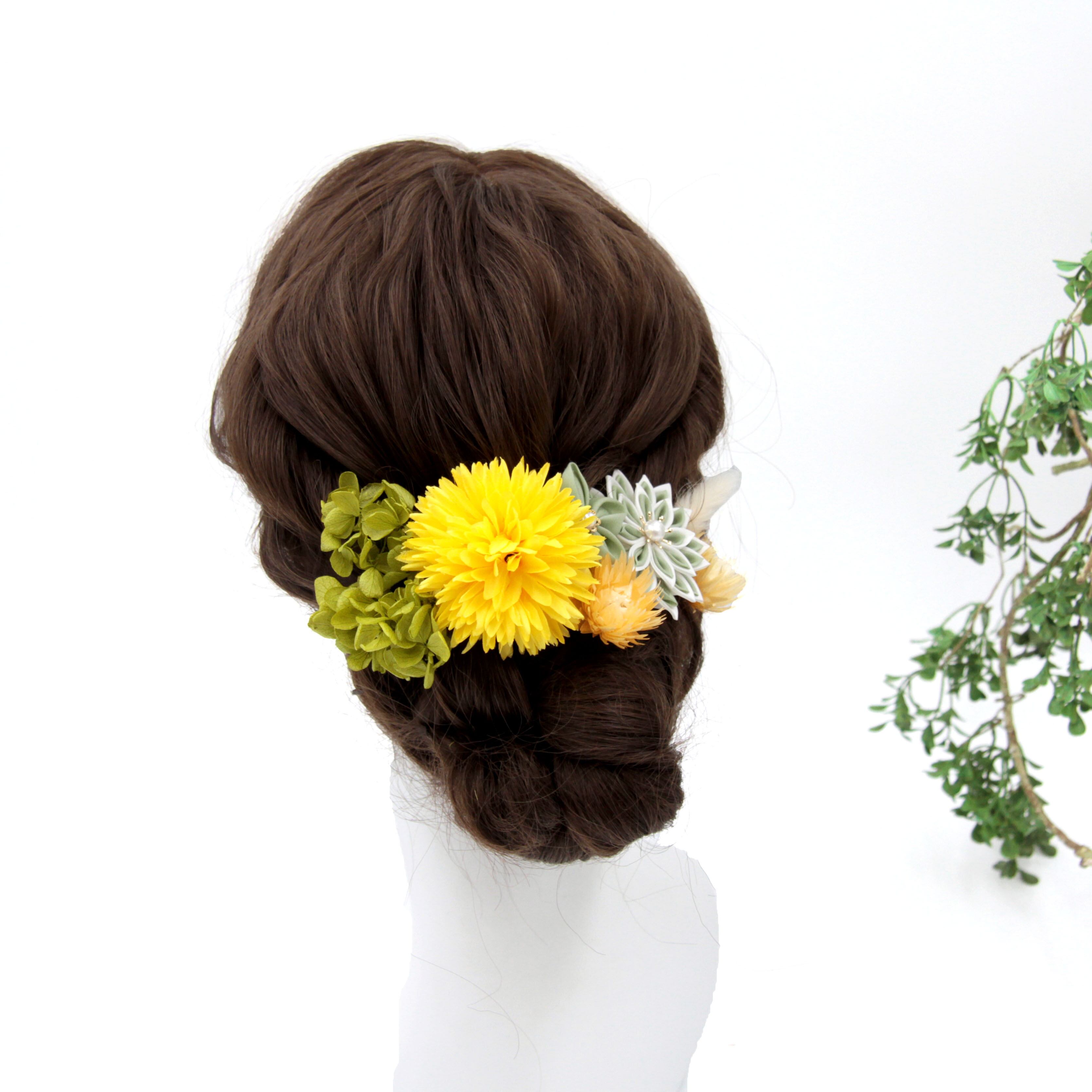 黄色のピンポンマムがポップで元気な印象の髪飾り。