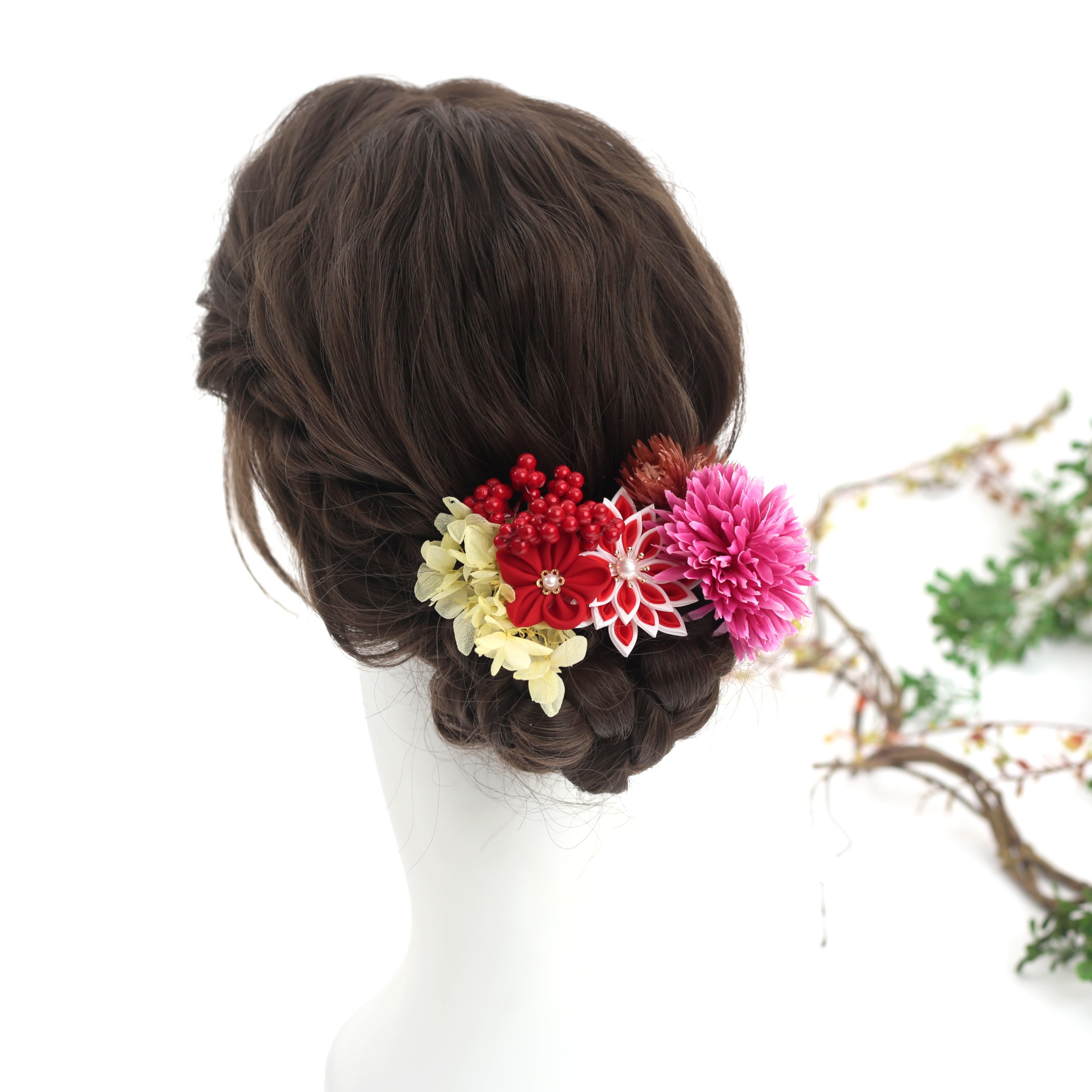 ピンクのピンポンマムがポイントの可愛い髪飾りです。