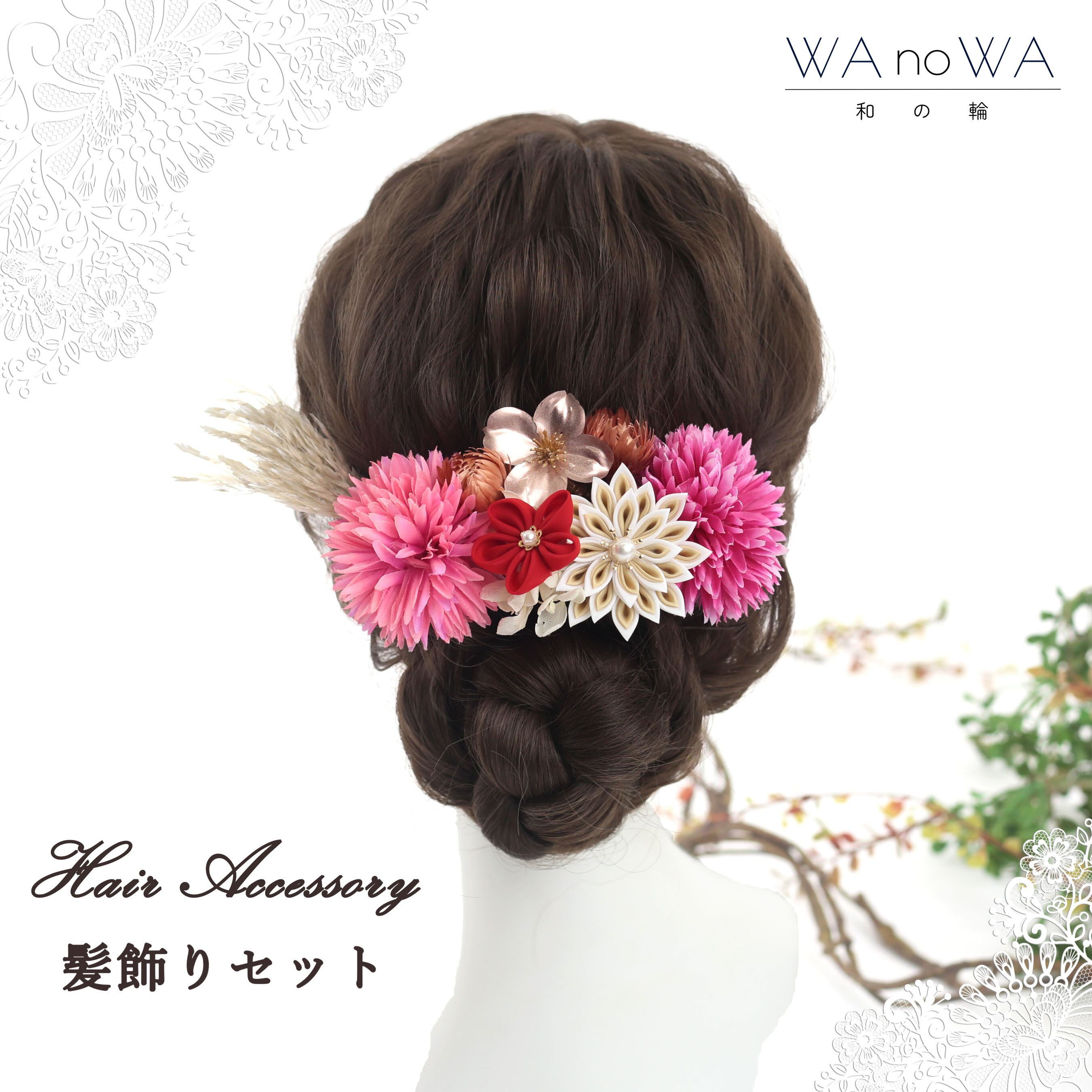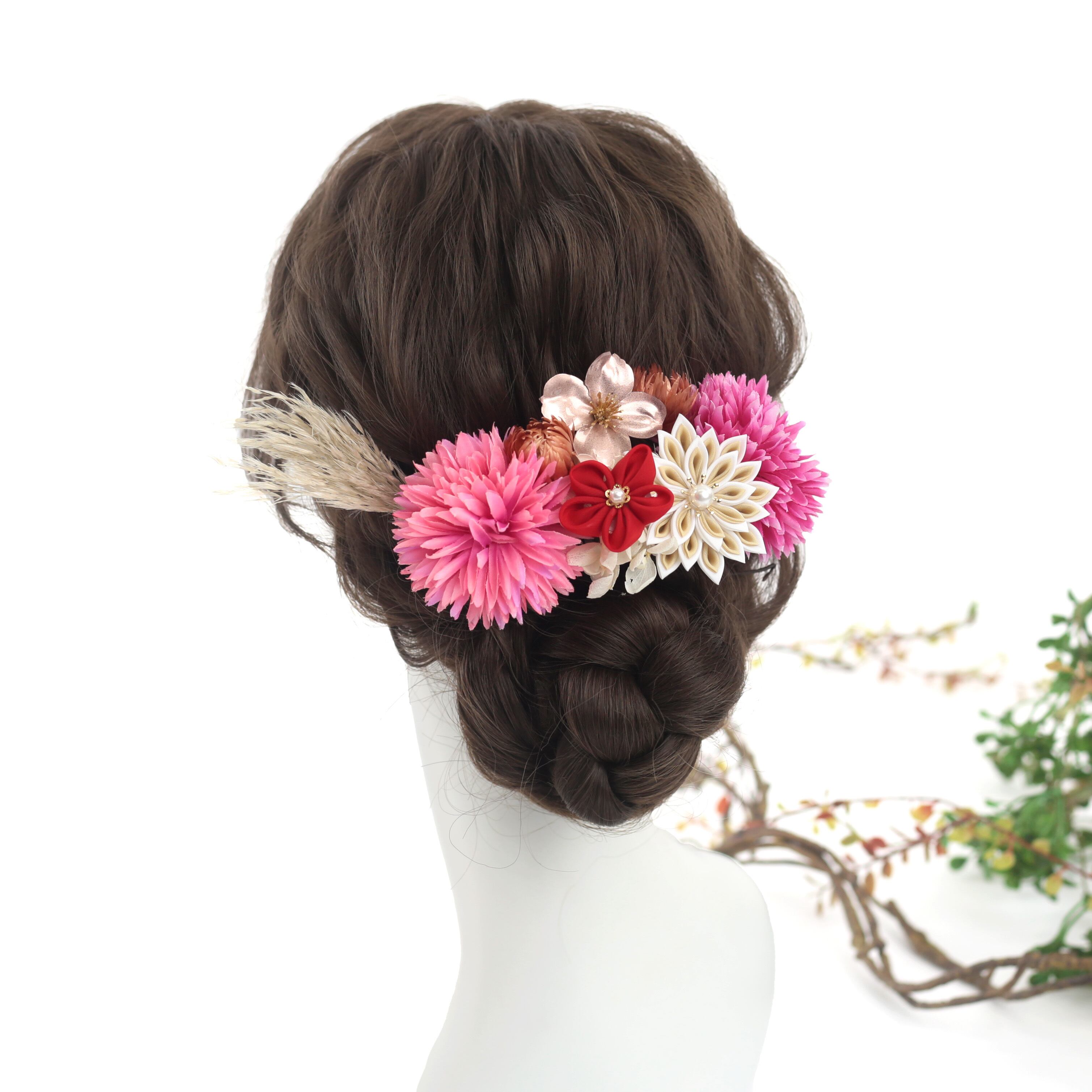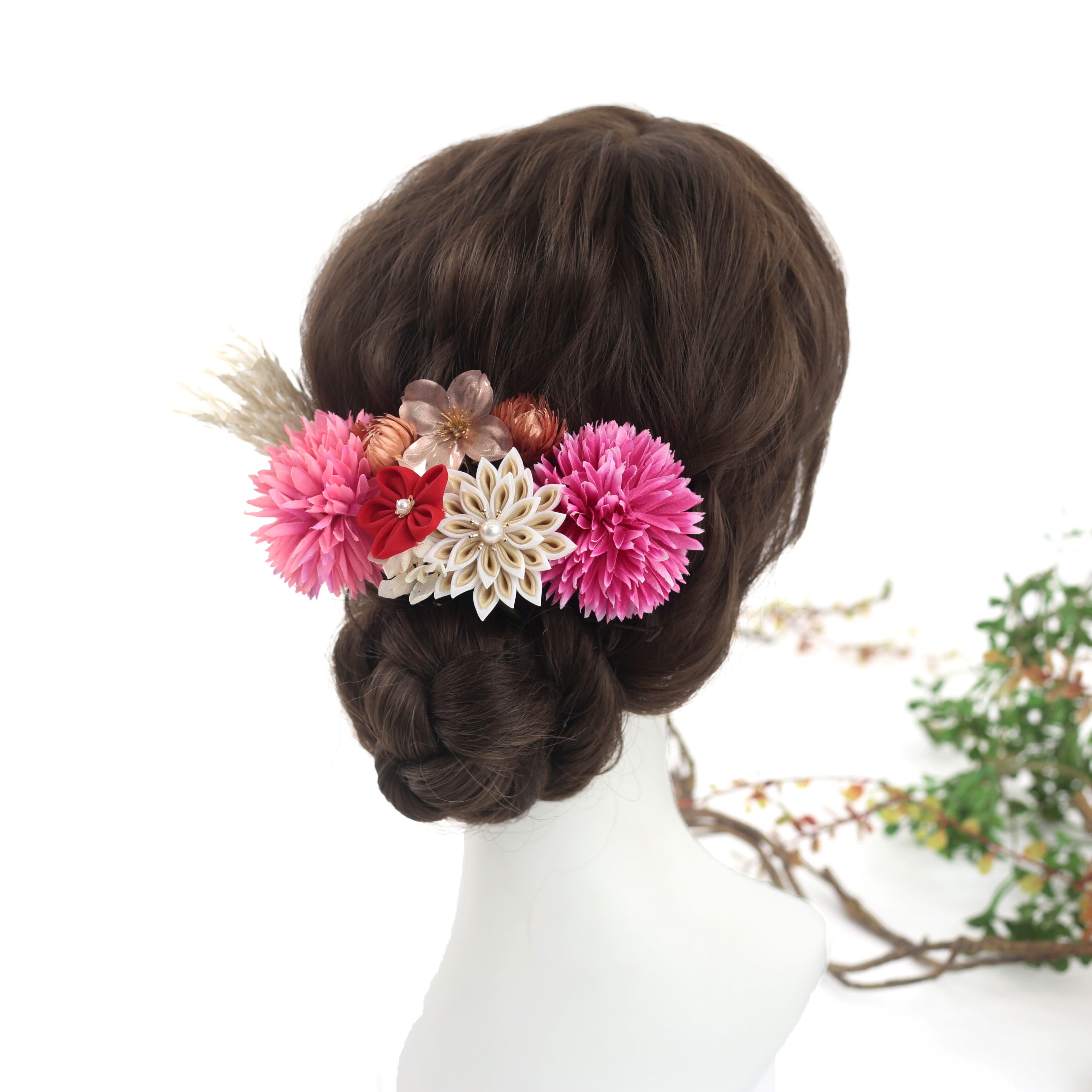 ピンクや紫のピンポンマムが存在感抜群で華やかな髪飾り。