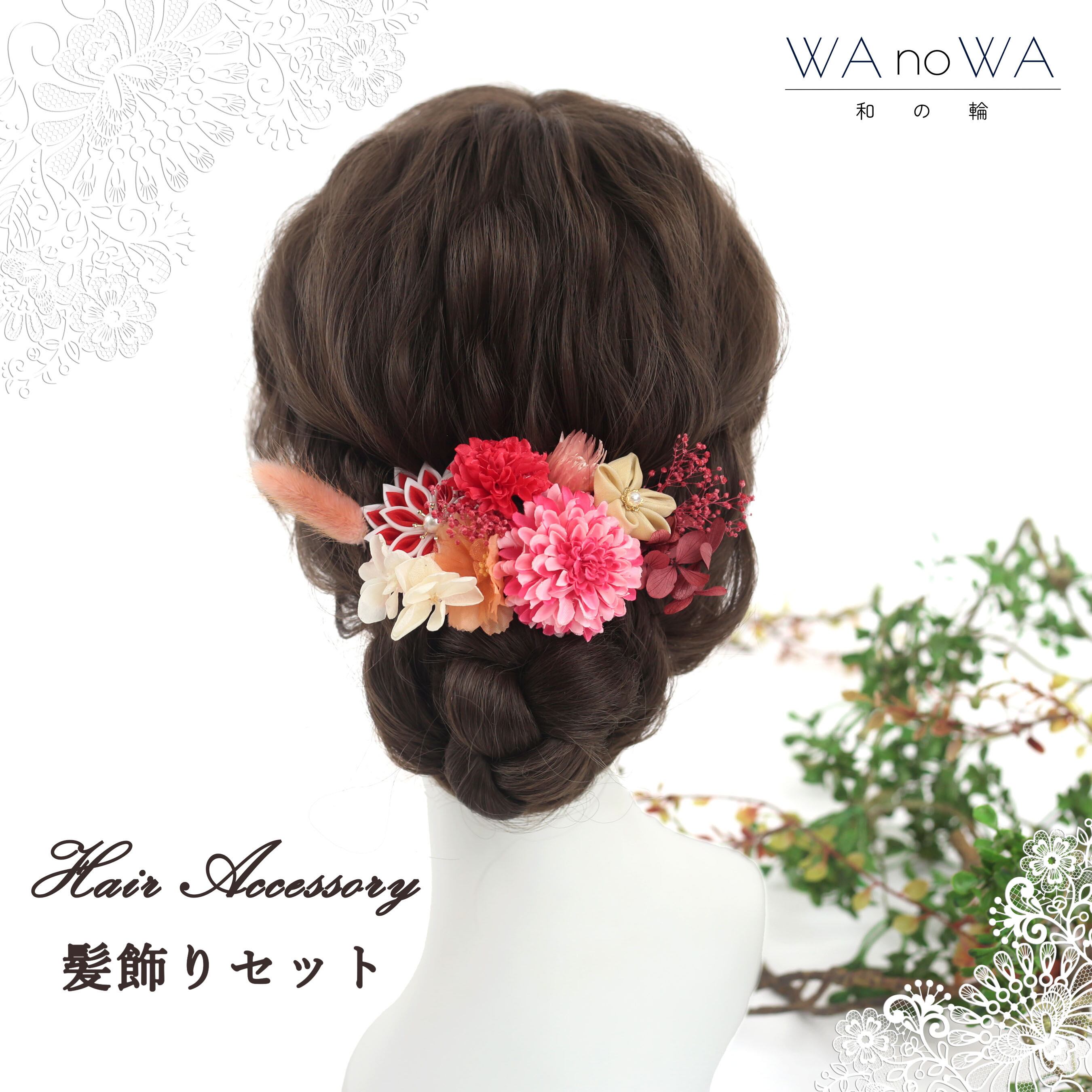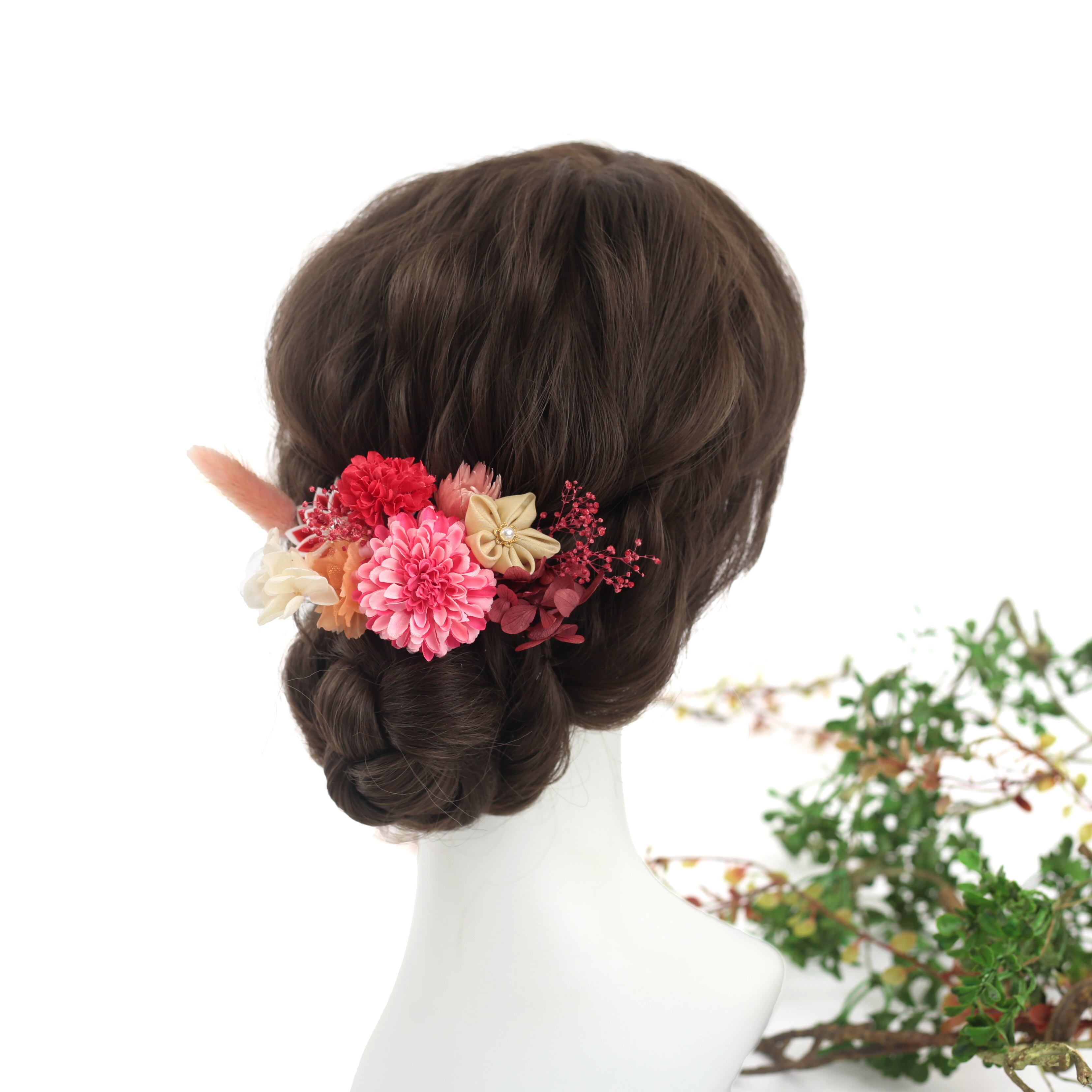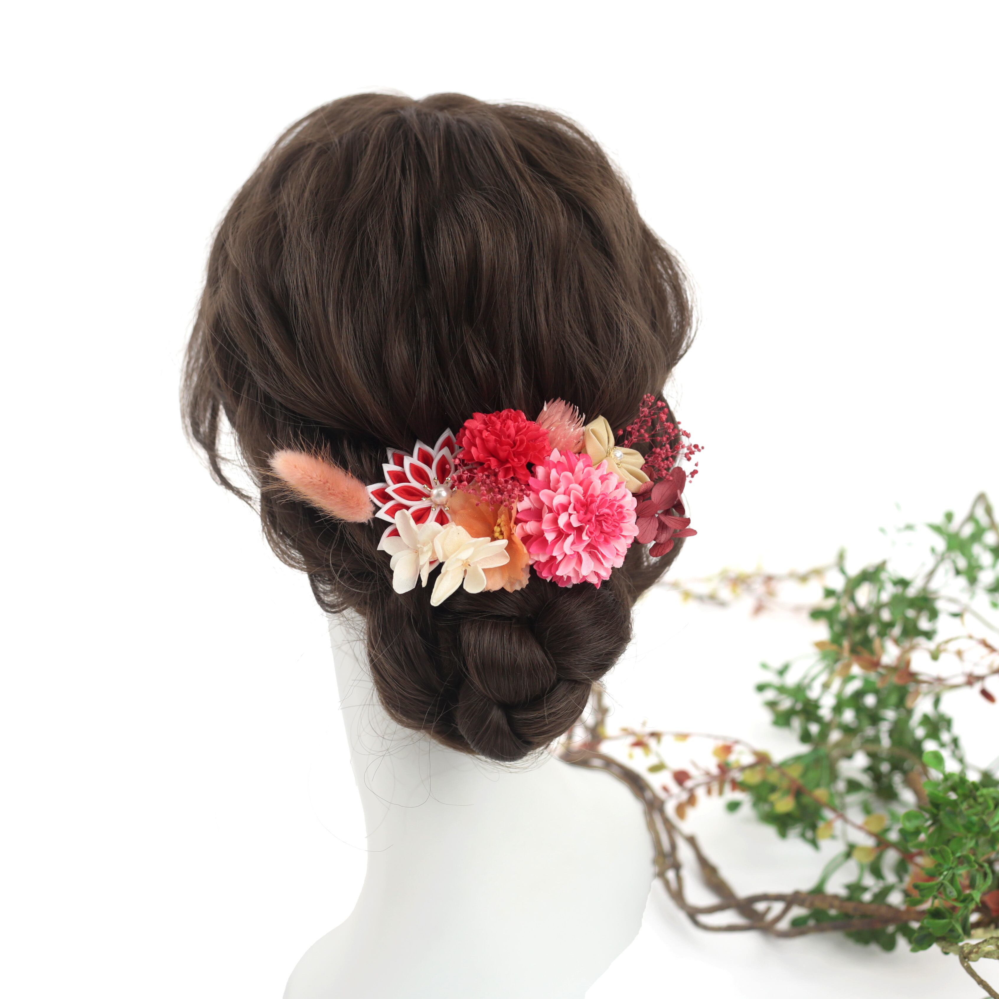 赤やピンクでまとめた可愛らしい髪飾り。