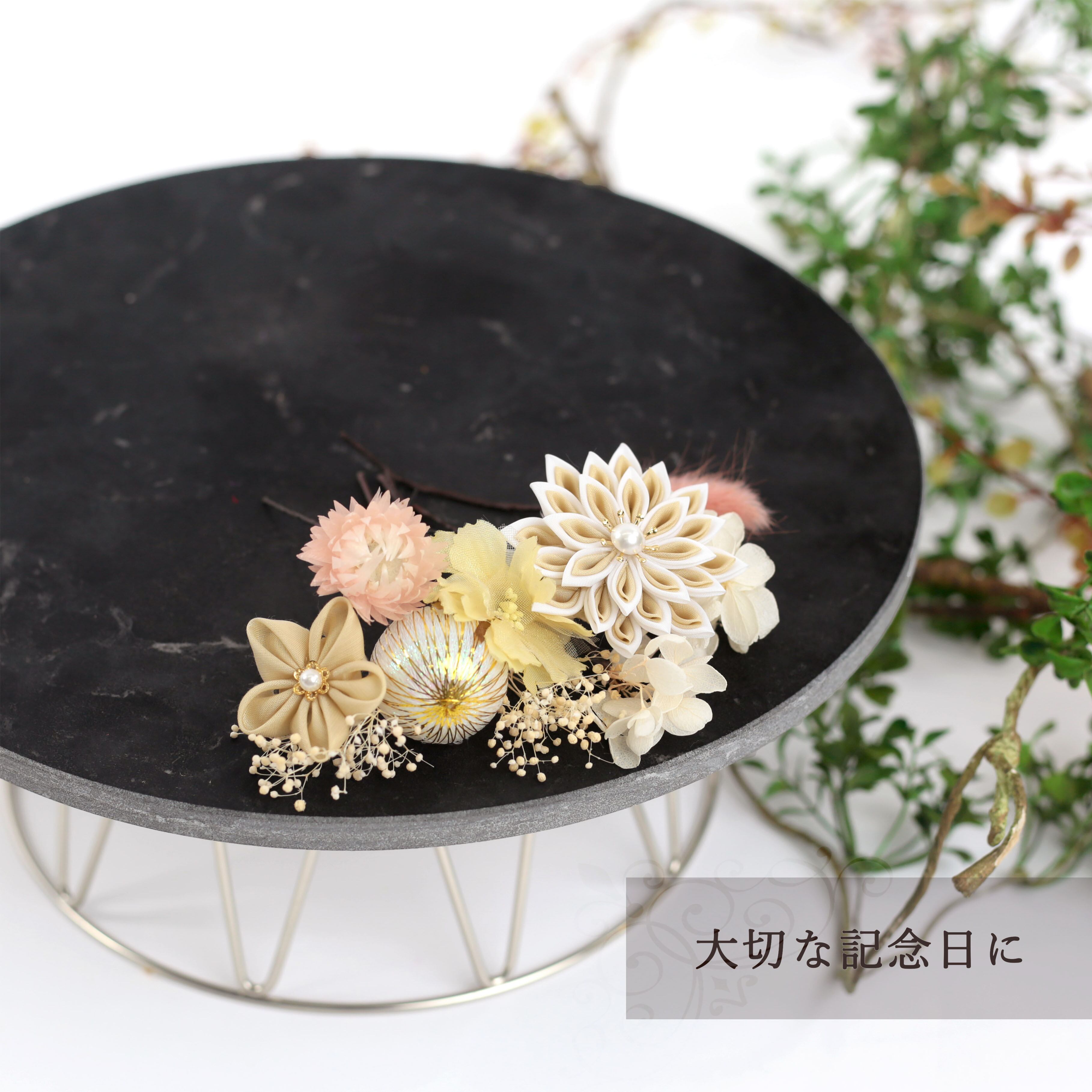 ※ドライフラワー・つまみ細工は非常に繊細です。丁寧にお包みして発送することを心がけておりますが、配送過程でお花によっては花落ちなどがある事がございます。ご了承ください。