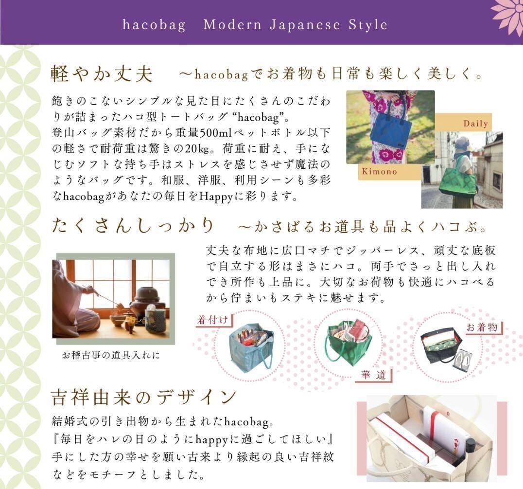 和装にも合うデザインで、日常使いや結婚式の引き出物、買い物、キャンプ、ビーチ、ビジネスシーンなど幅広く活躍。