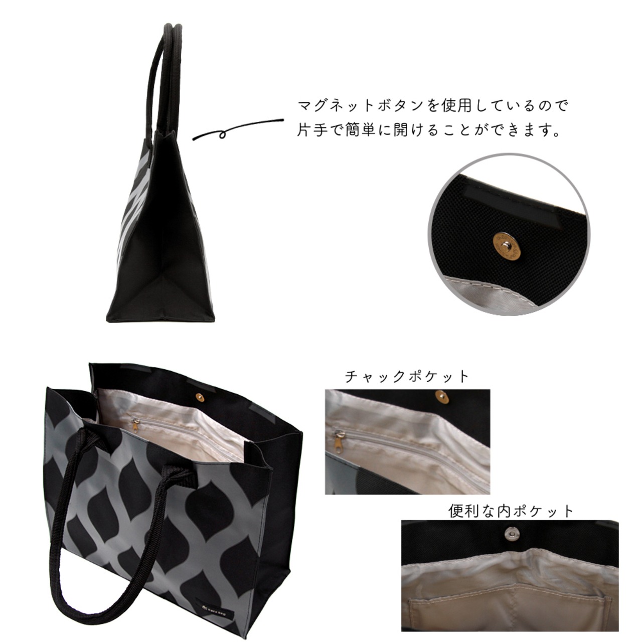 大容量、広いマチ、丈夫な底板、汚れに強い外生地、耐水加工の内側、ファスナー付き内ポケットを備えています。