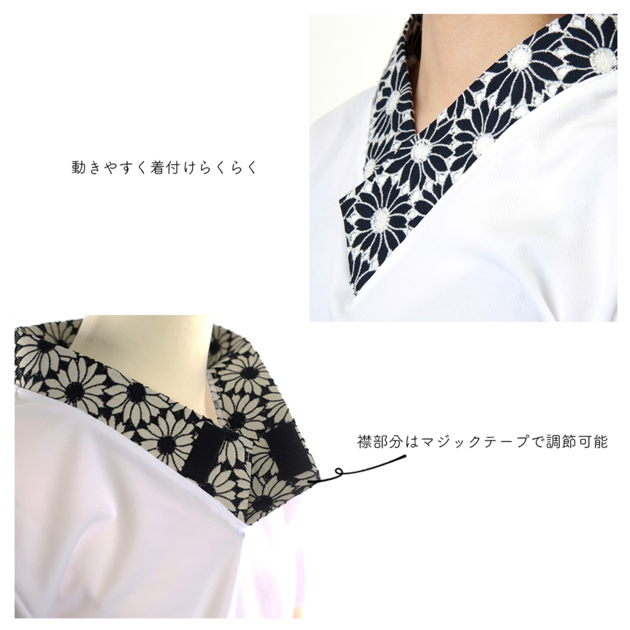 浴衣や着物の下にサッと着れて動きやすく、衿元部分はマジックテープで調節可能です。