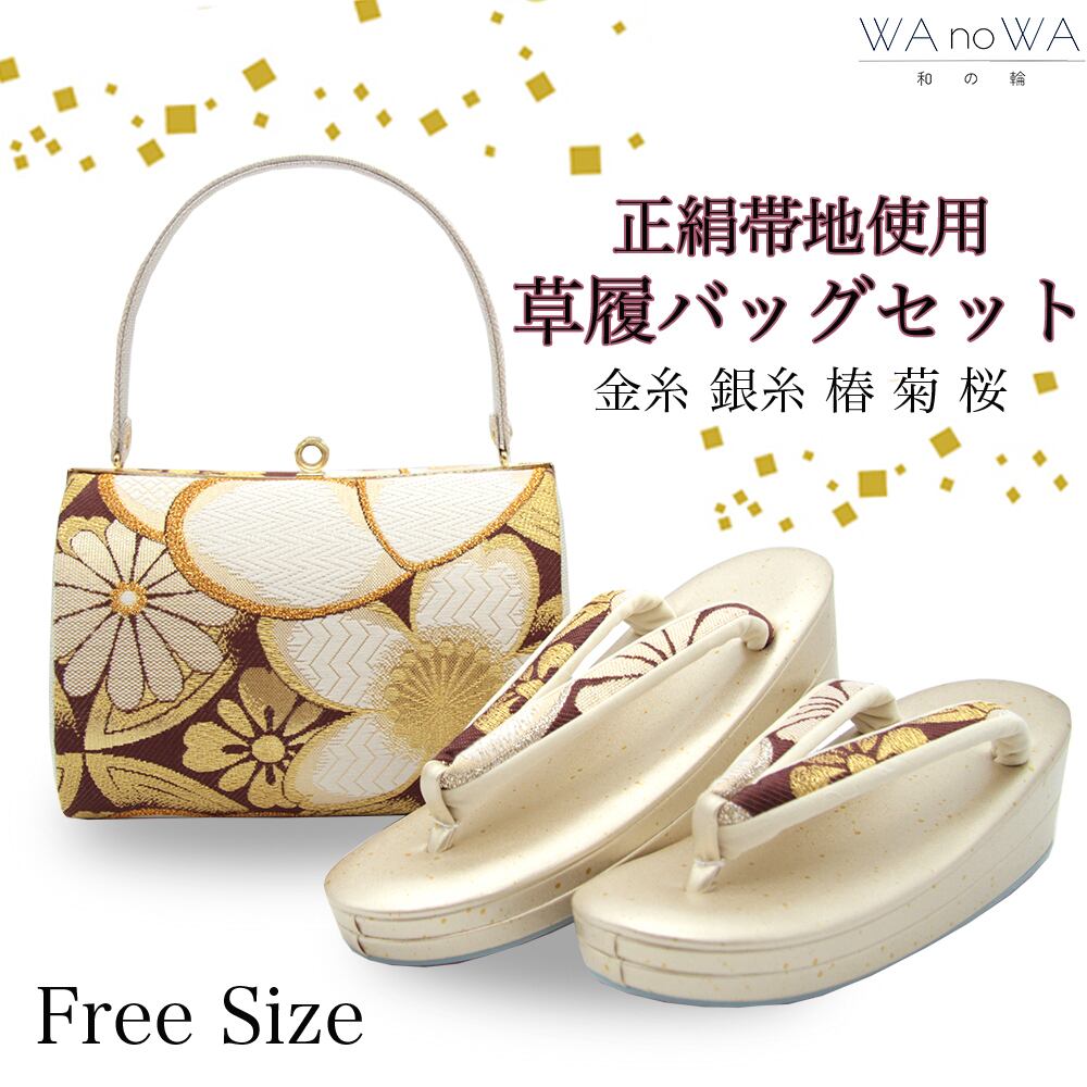 草履バッグ 草履バック 草履バッグセット 金糸 銀糸 椿 菊 桜 正絹帯地 赤茶地 振袖 成人式 卒業式 フリ−サイズ WA-Z-6