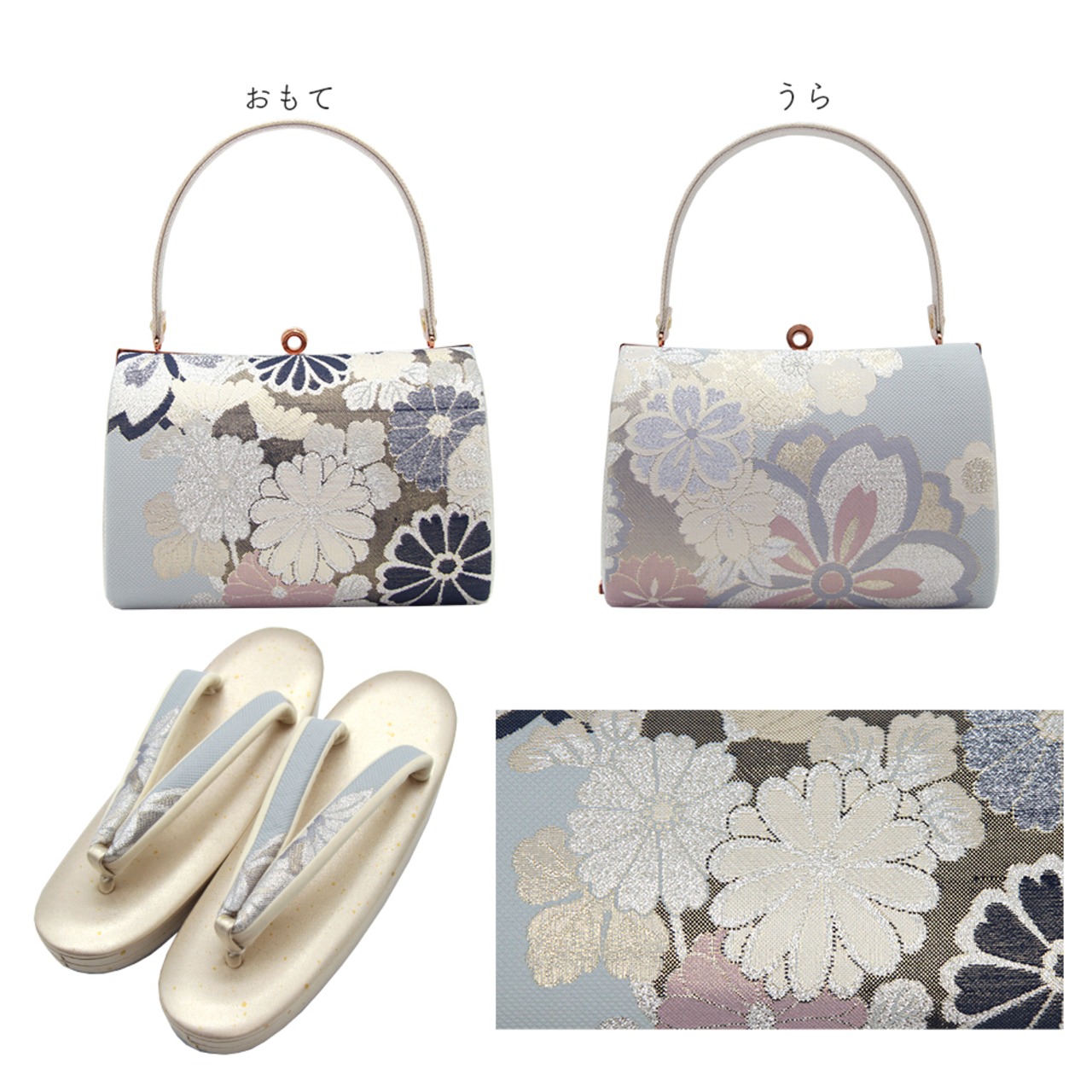 爽やかな水色地に菊や桜柄が入った草履バッグ。