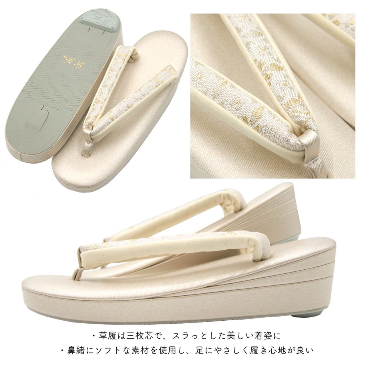 草履は足にやさしく履き心地が良く、三枚芯なのでスラっとした美しい着姿になります。