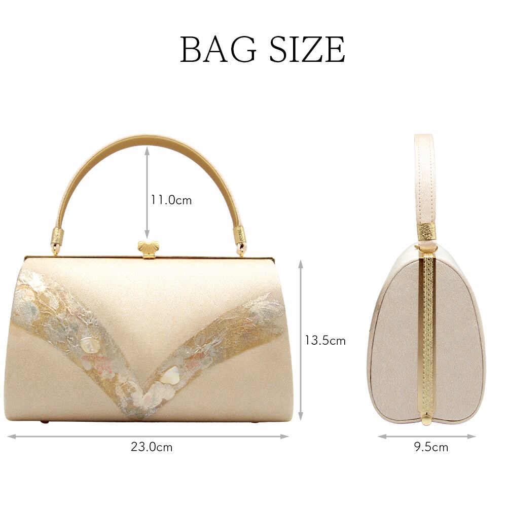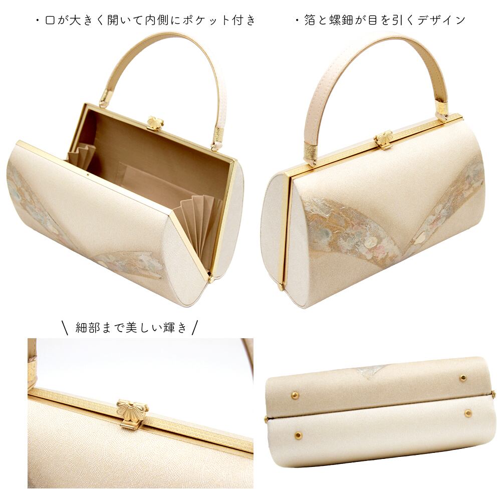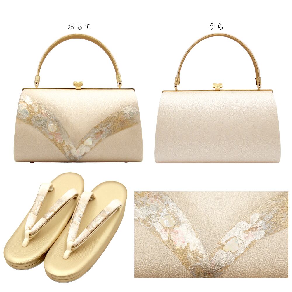 箔と螺鈿が目を引くデザインの草履バッグです。