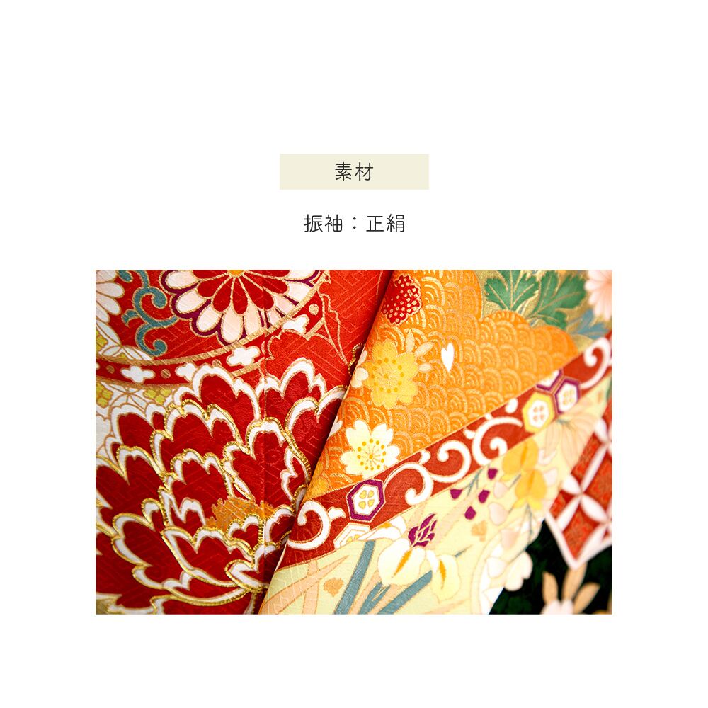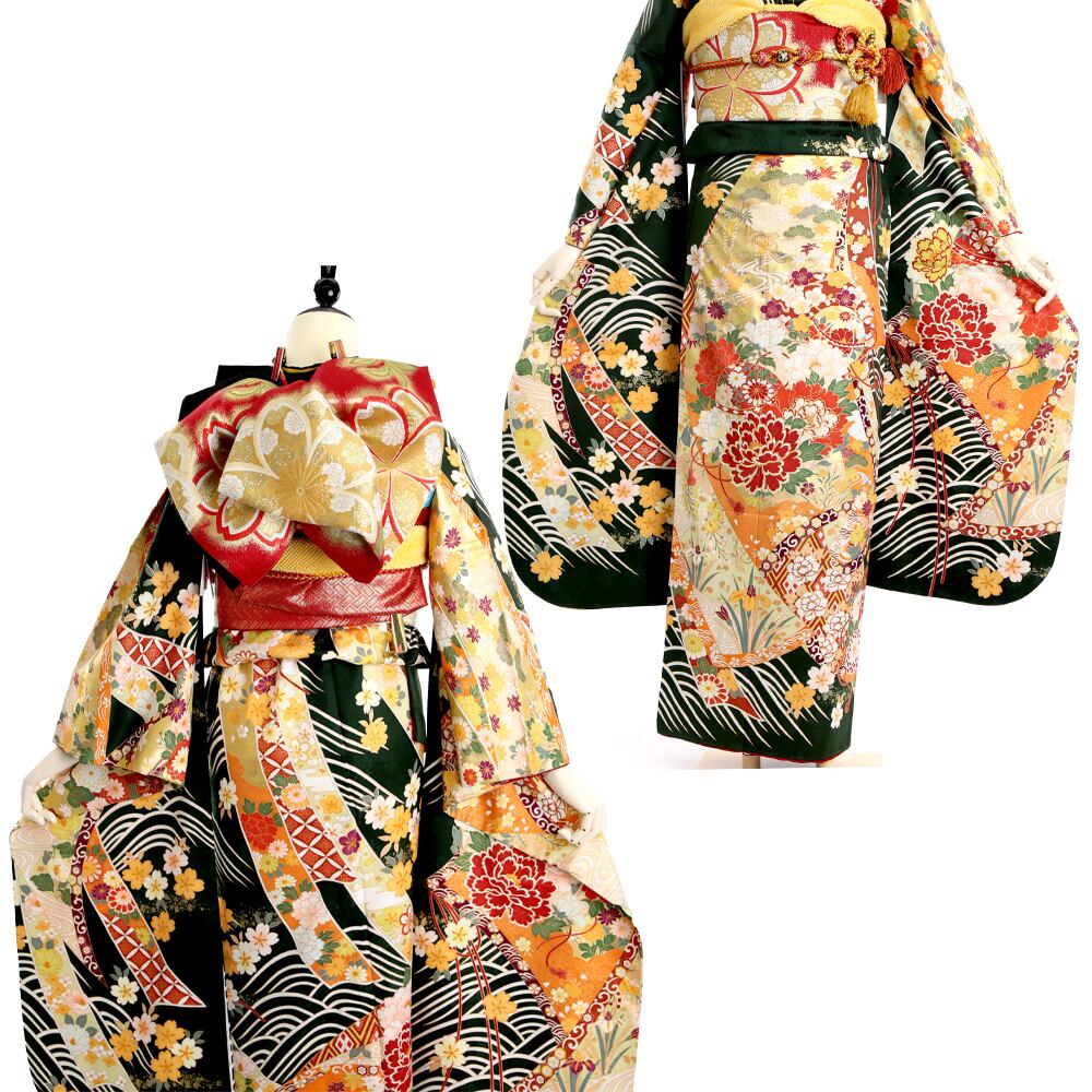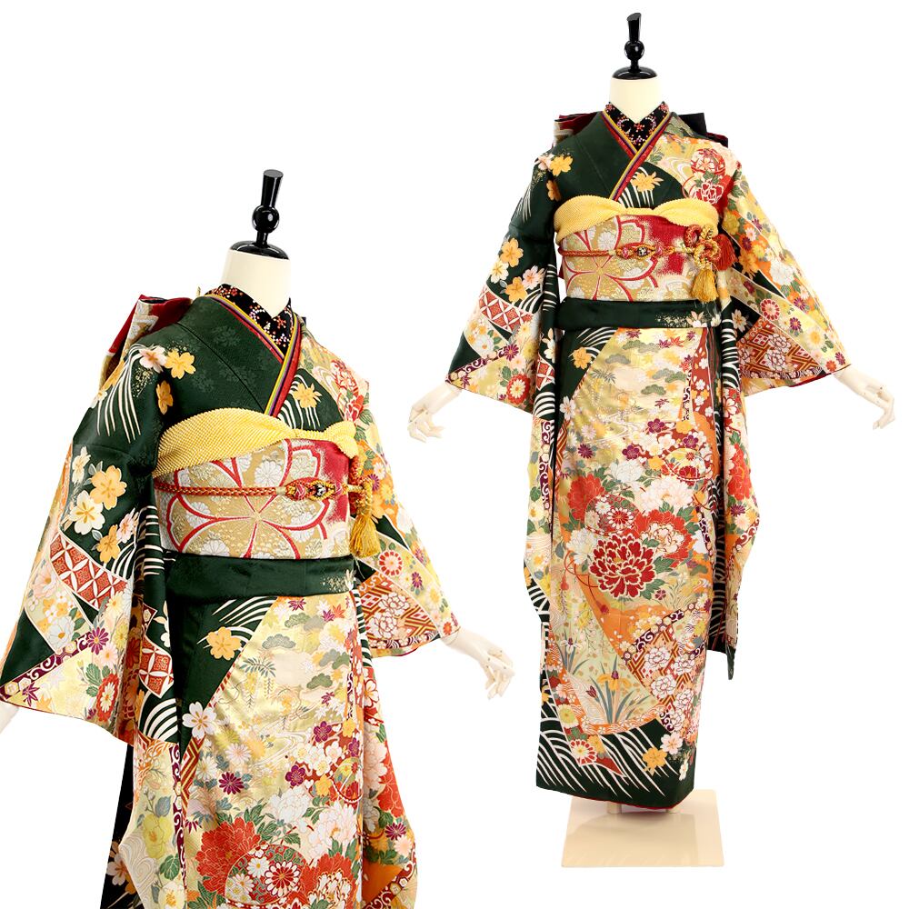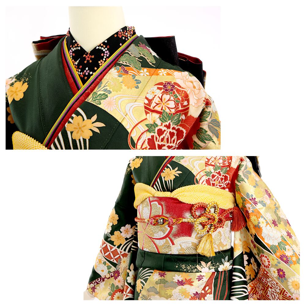 深い緑地に牡丹や熨斗が印象的な古典振袖です。
