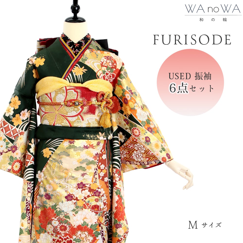 振袖 振袖セット USED振袖 緑 牡丹 熨斗 金箔 6点セット レディース Mサイズ WA-FN-8