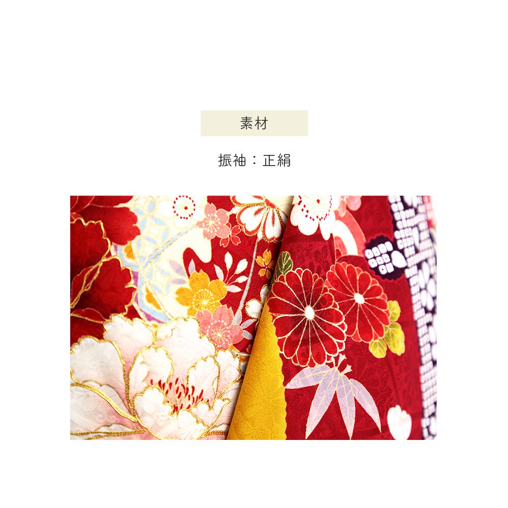 赤地に牡丹や熨斗が映える印象的な古典柄の振袖です。