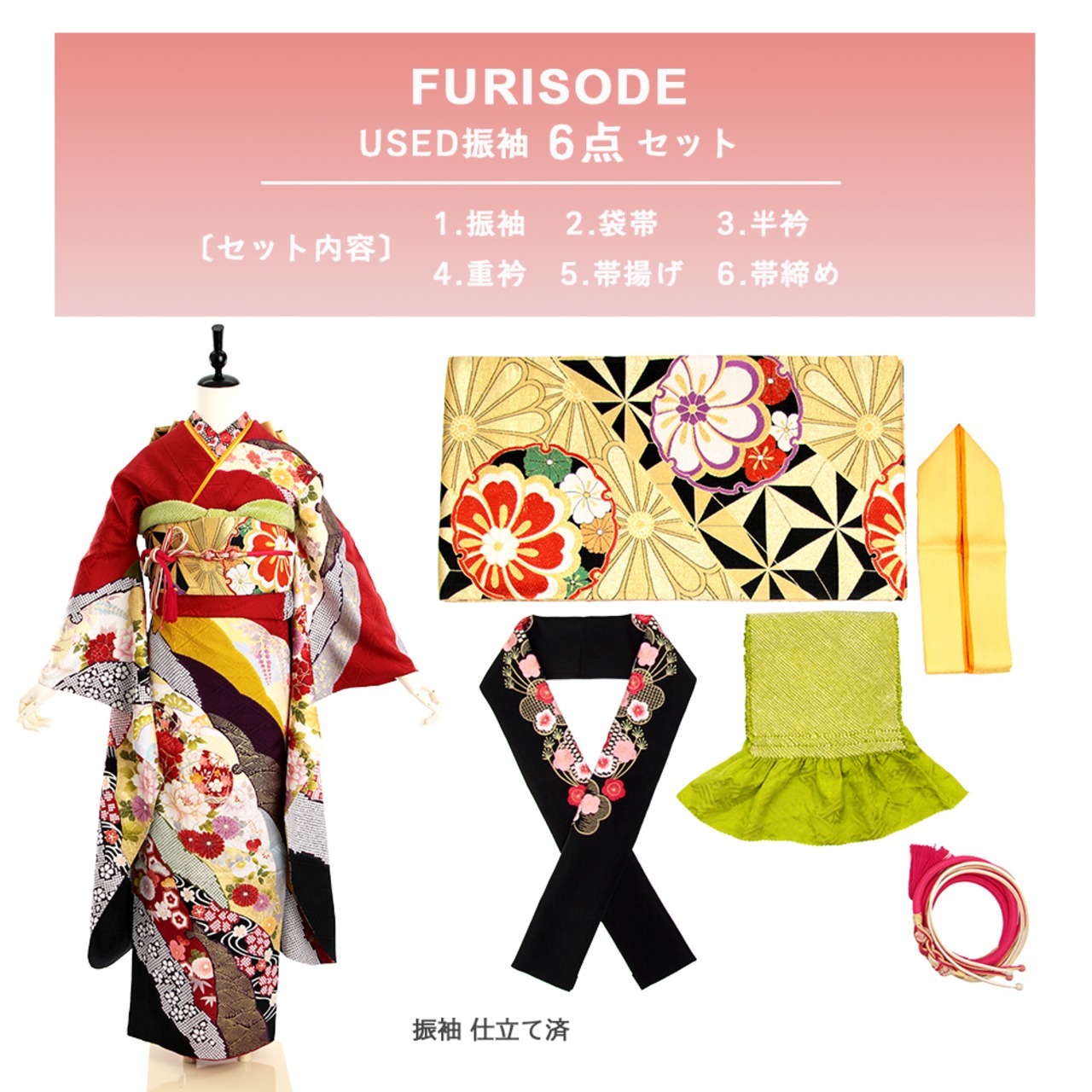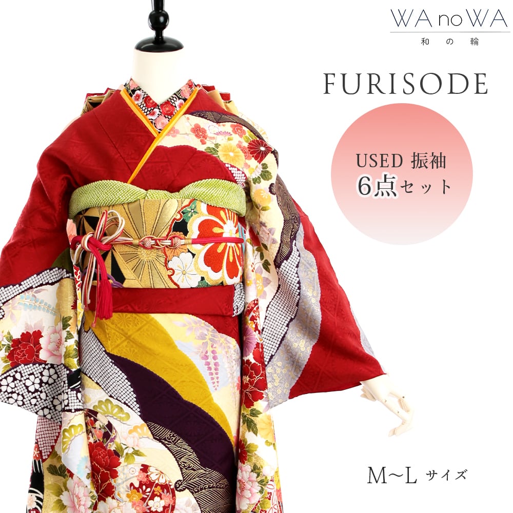 振袖 振袖セット USED振袖 赤 牡丹 熨斗 6点セット レディース M〜Lサイズ WA-FN-9