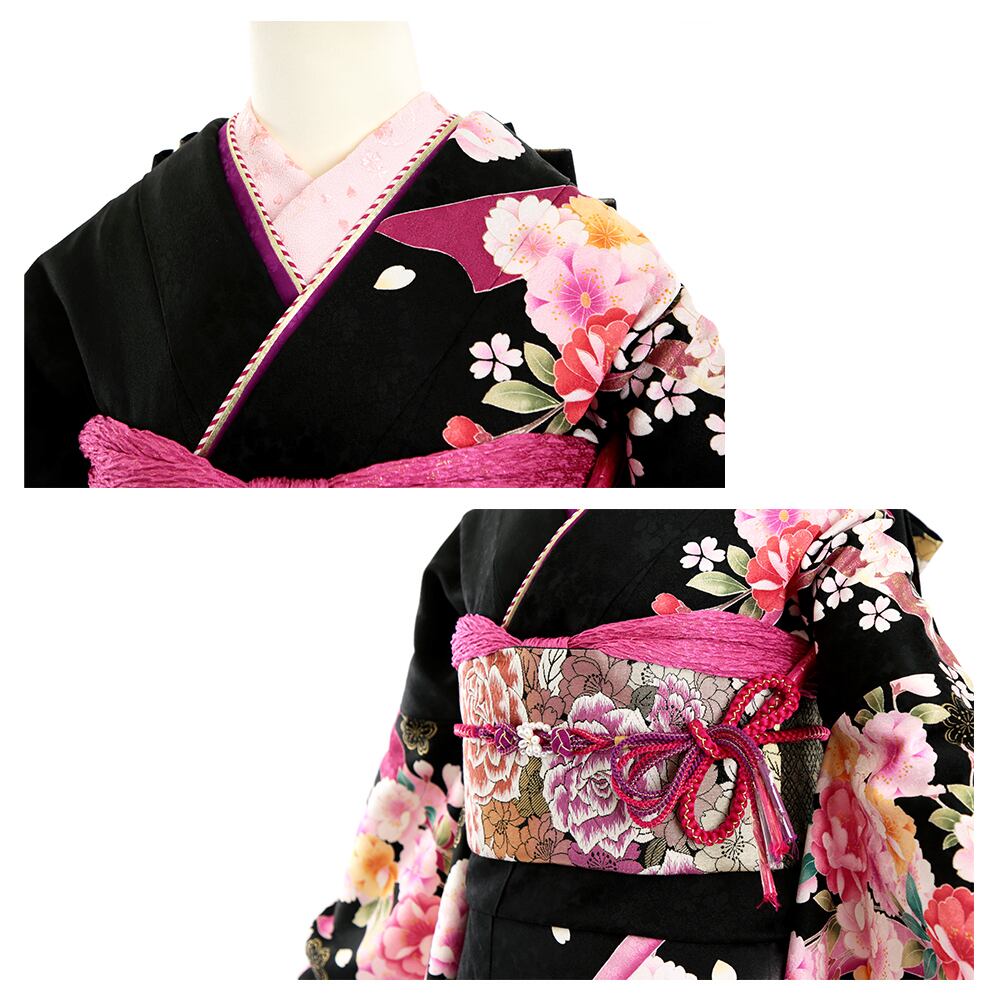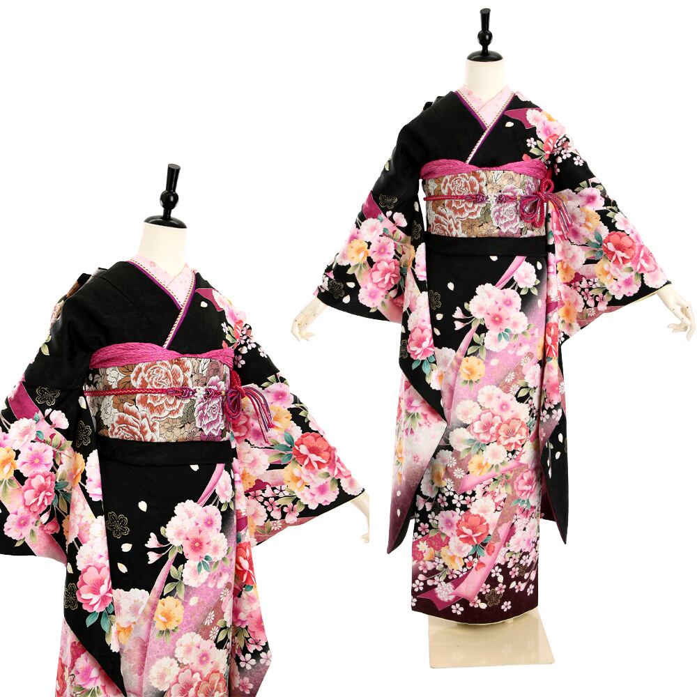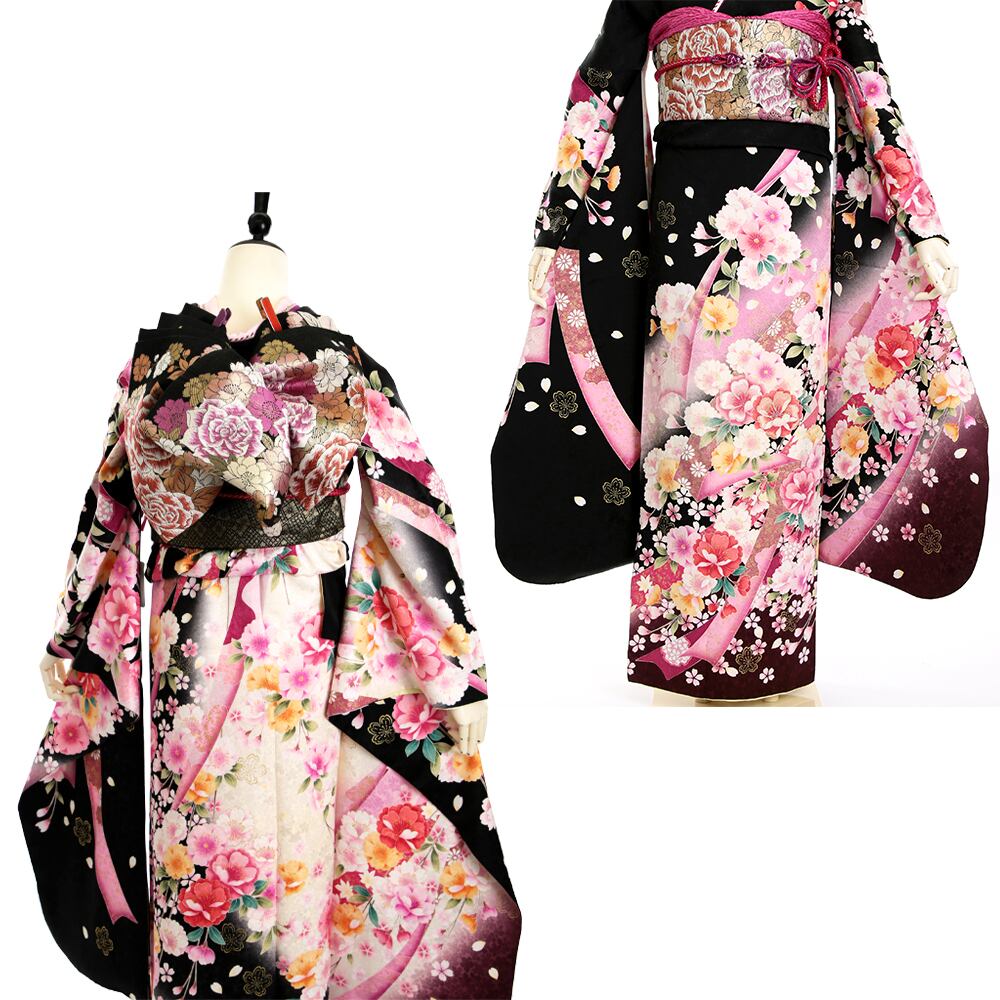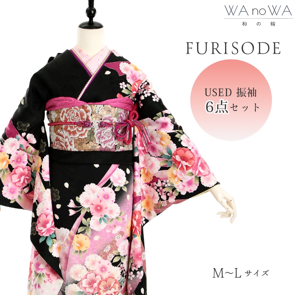 振袖 振袖セット USED振袖 黒 桜 熨斗 6点セット レディース M〜Lサイズ WA-FN-33