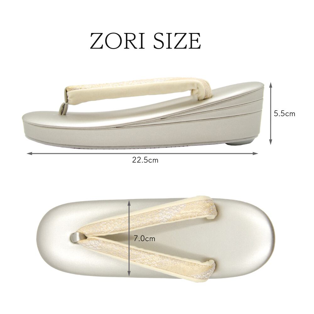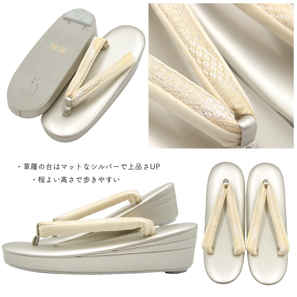 草履の台はマットなシルバーが上品さを際立たせ、程よい高さで歩きやすい作りとなっております。