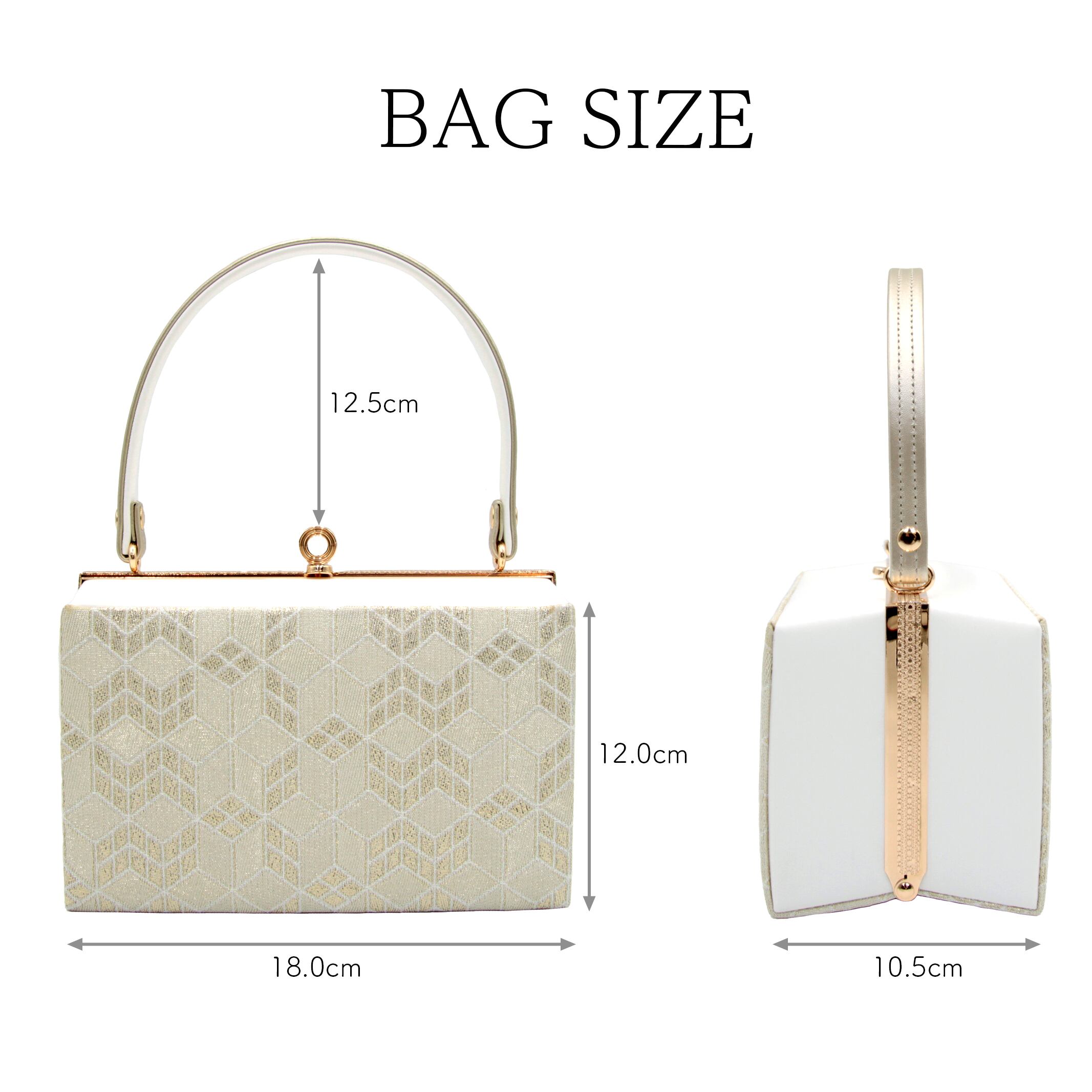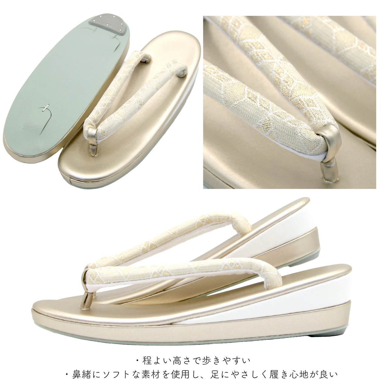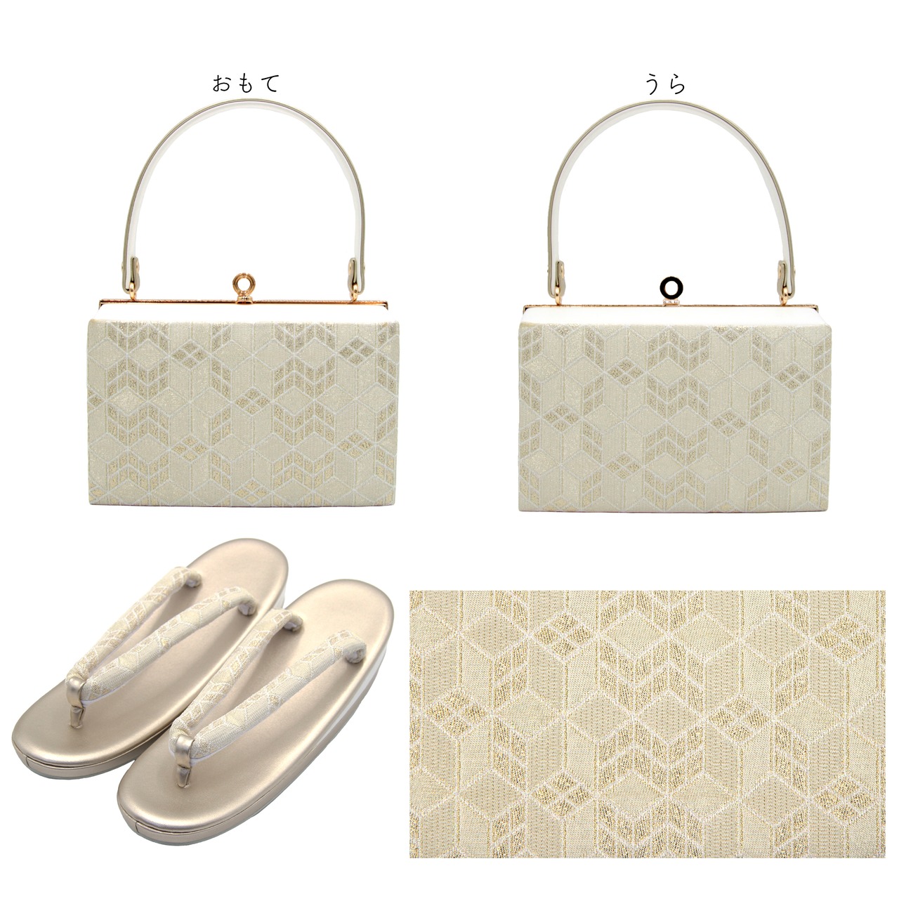 スクエア型のデザインが洗練された印象を与える、上品なシャンパンゴールドカラーの草履バッグセットです。