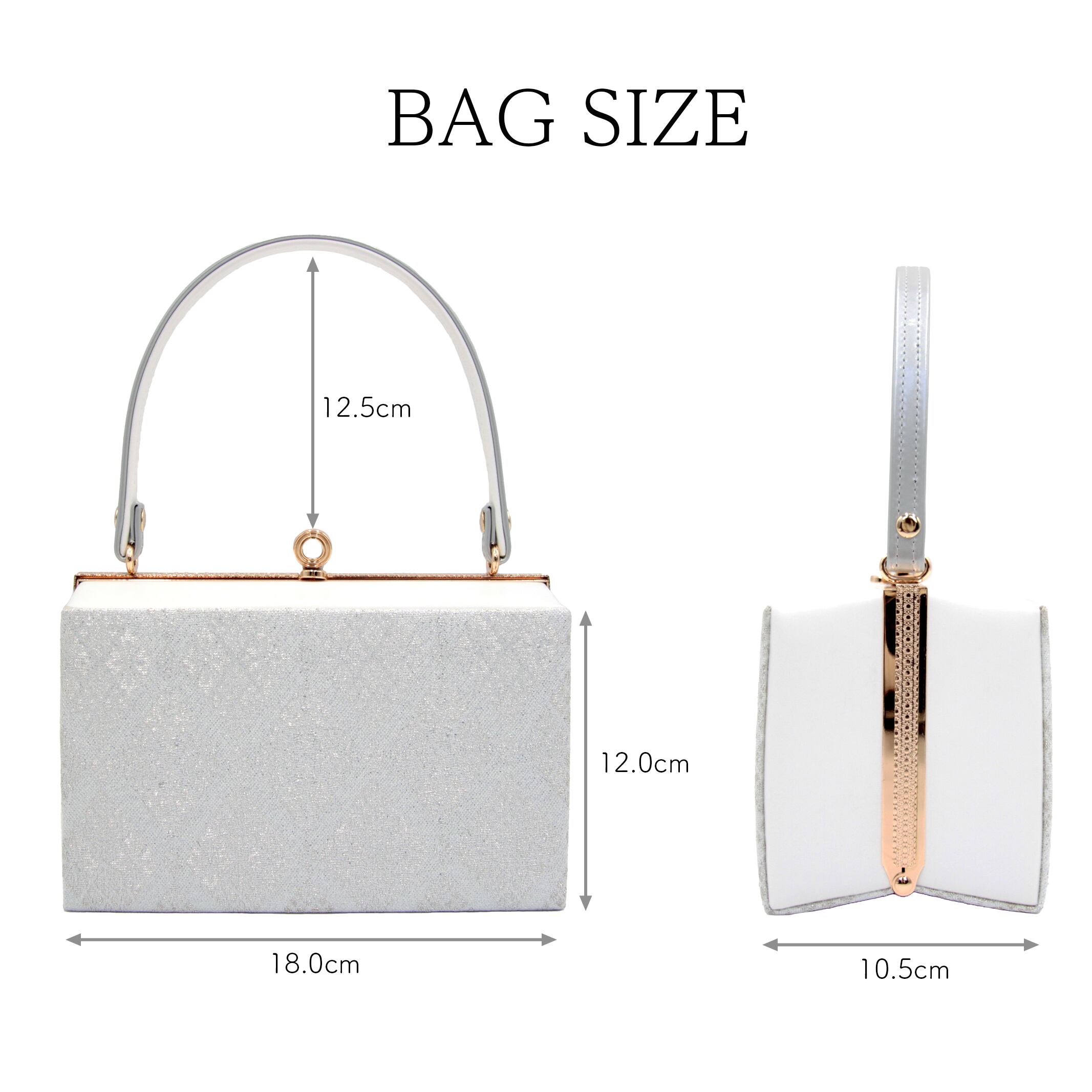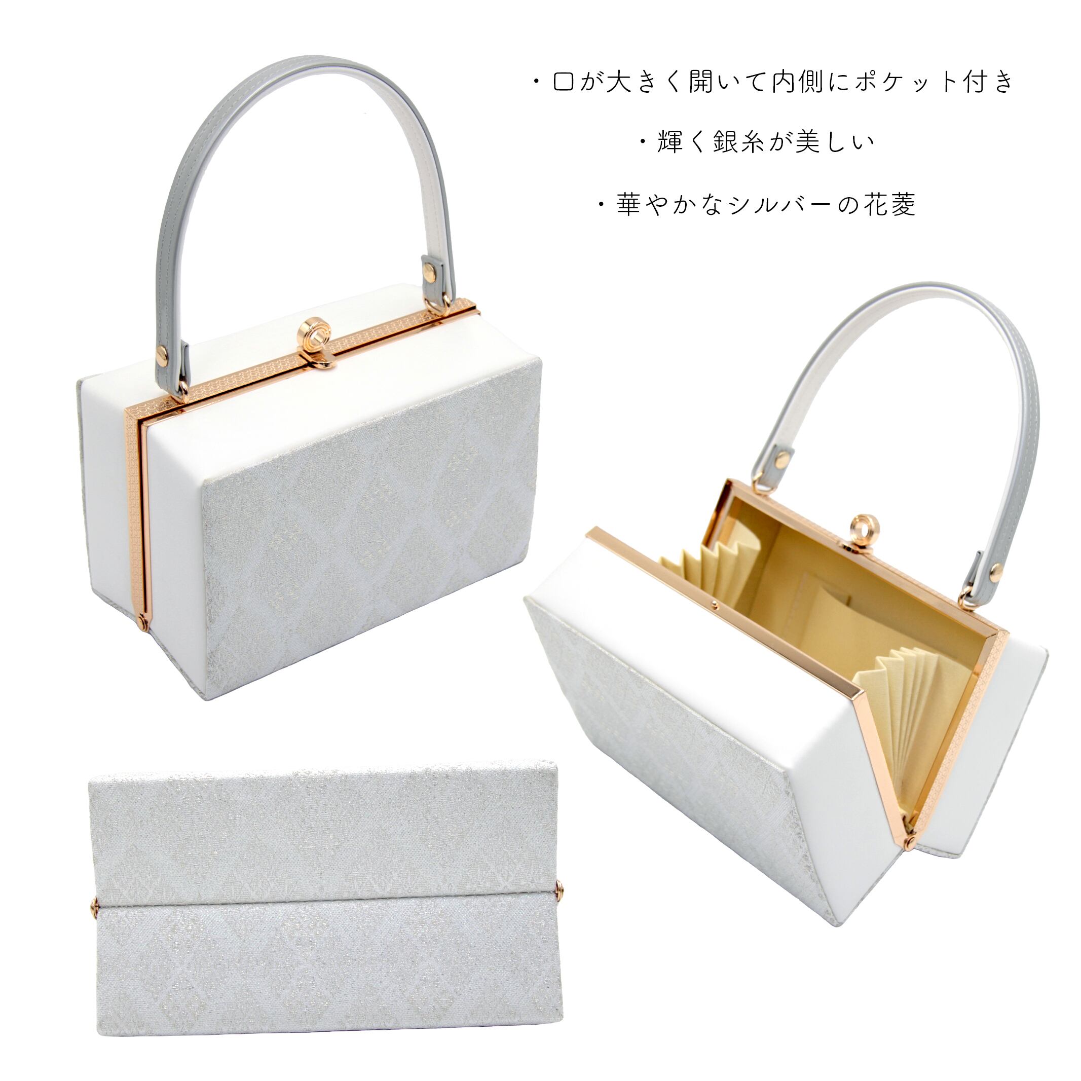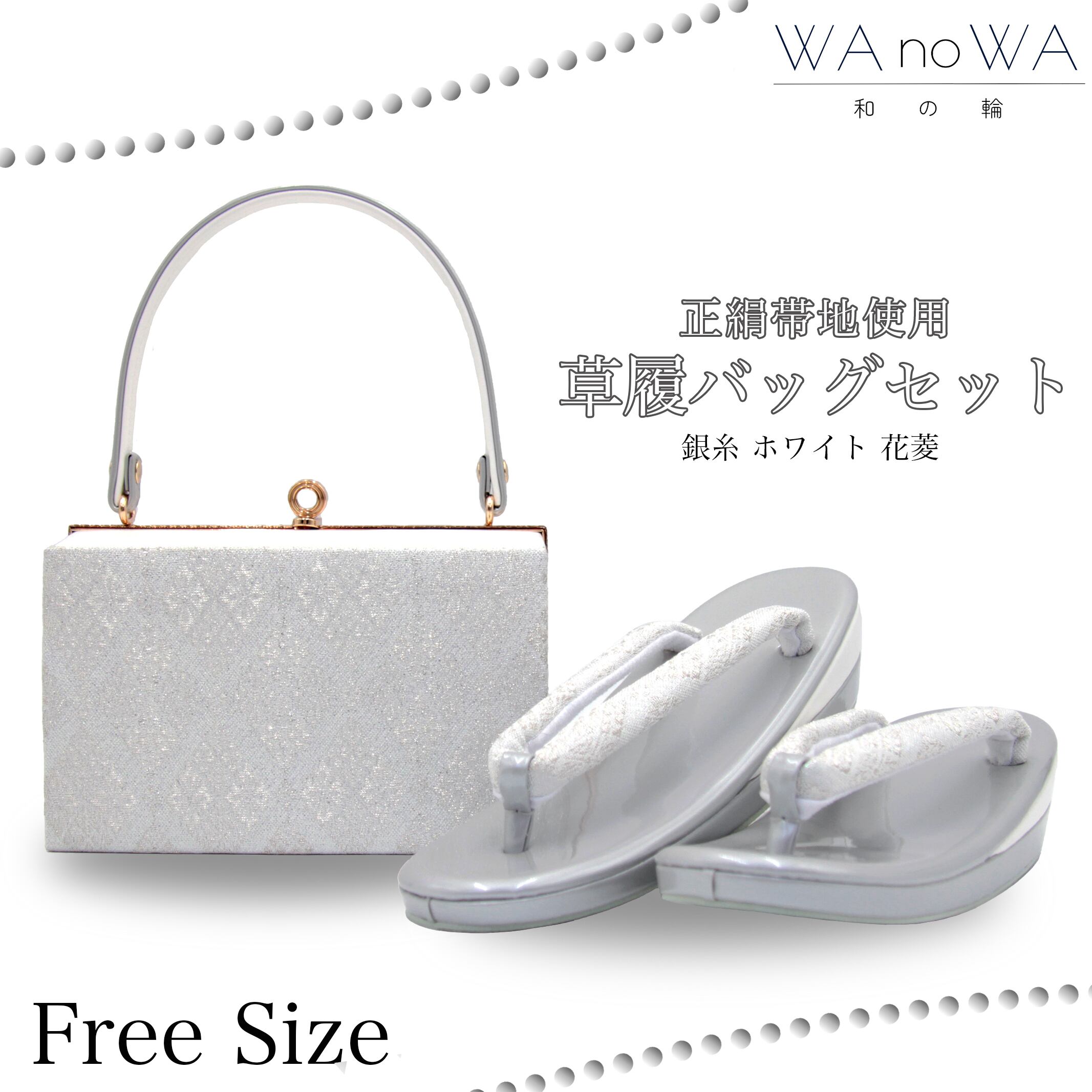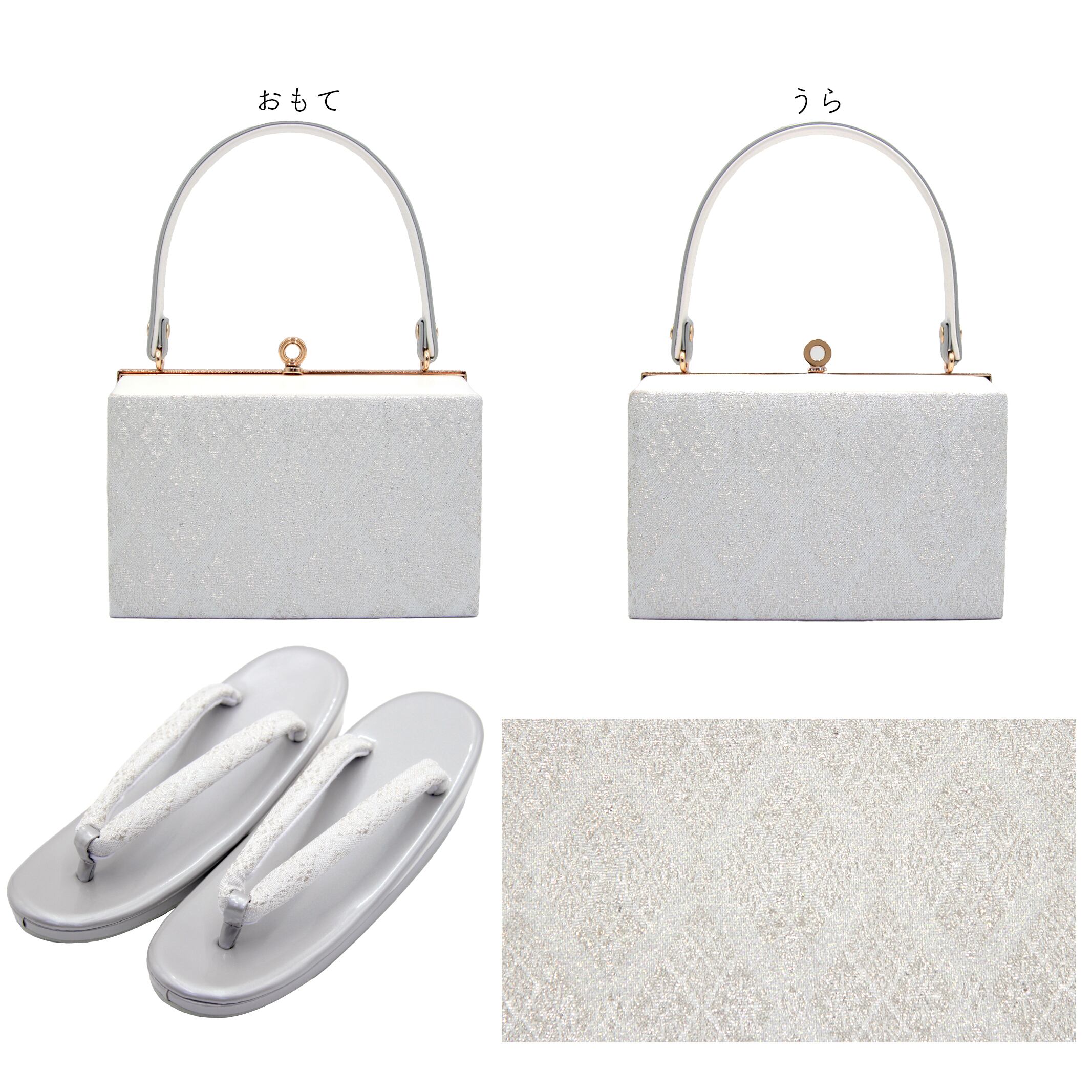 輝く銀糸が織り込まれた美しいデザインと、洗練されたスクエア型が特徴の草履バッグセットです。