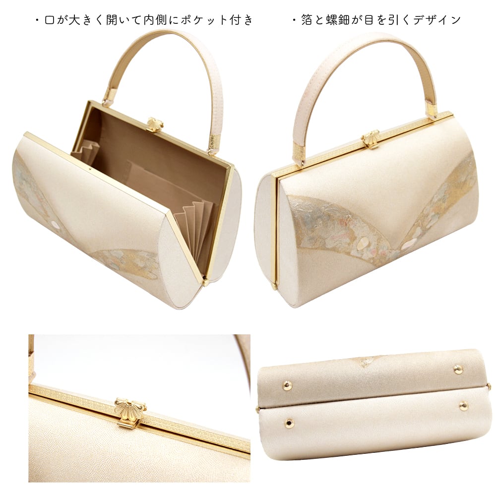 箔と螺鈿が目を引くデザインの草履バッグです。