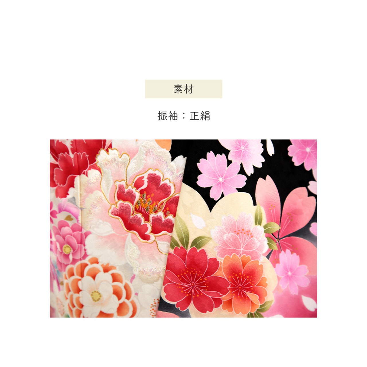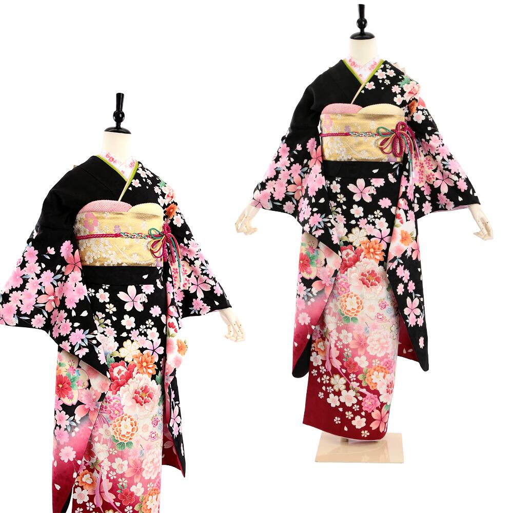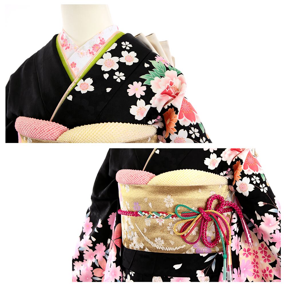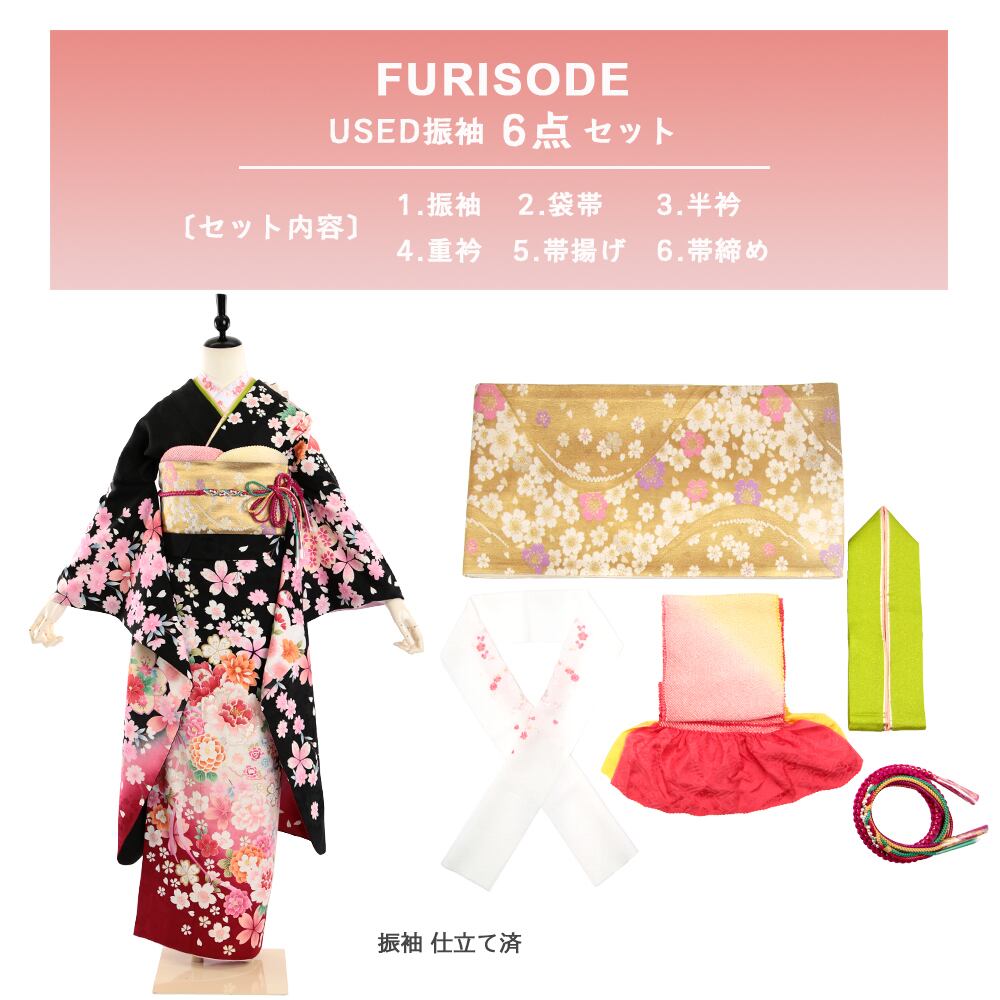振袖 振袖セット USED振袖 黒 桜 牡丹 6点セット レディース S〜Mサイズ WA-FN-57