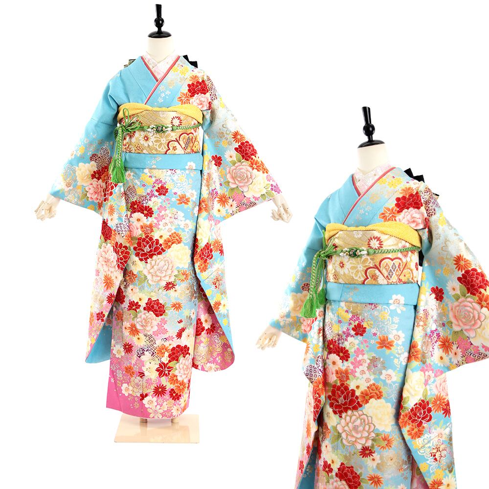 水色地に牡丹や桜が印象的な古典振袖です。