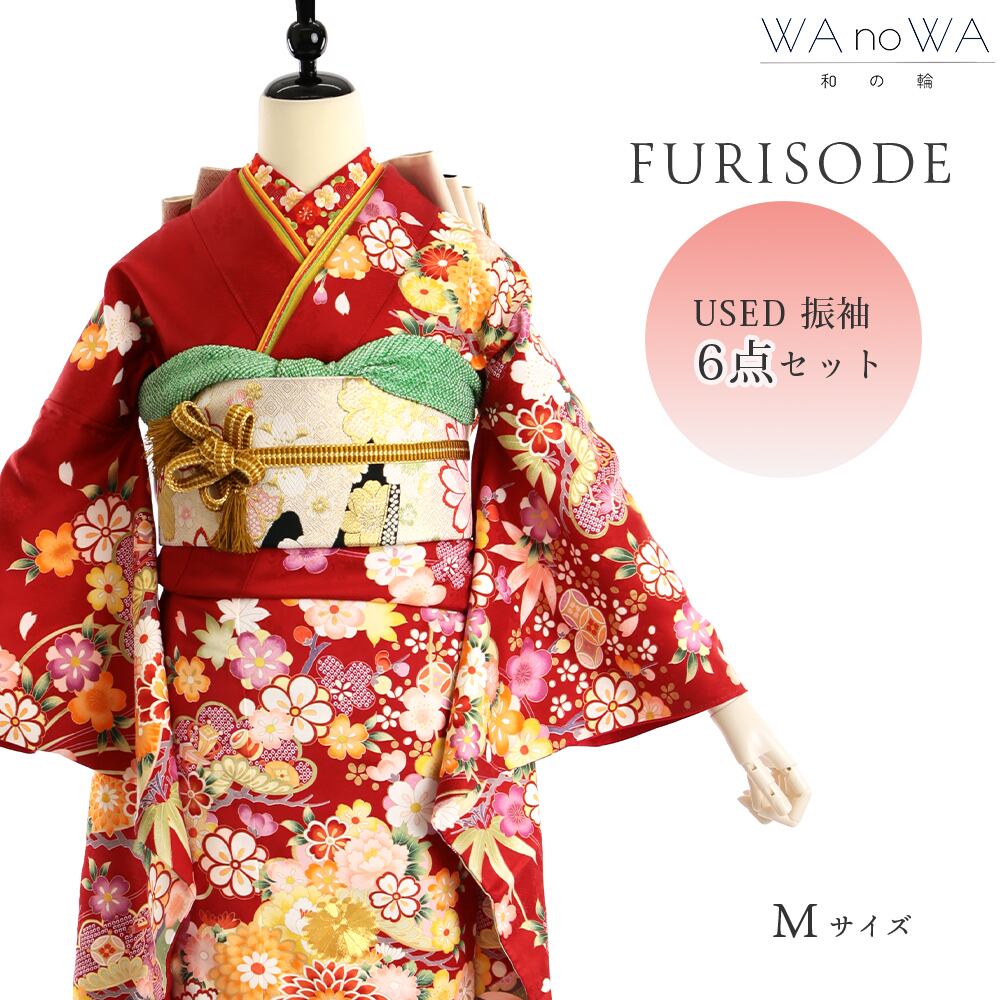 振袖 振袖セット USED振袖 赤 菊 松竹梅 6点セット レディース Mサイズ WA-FN-70