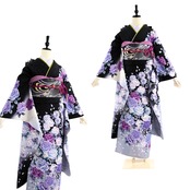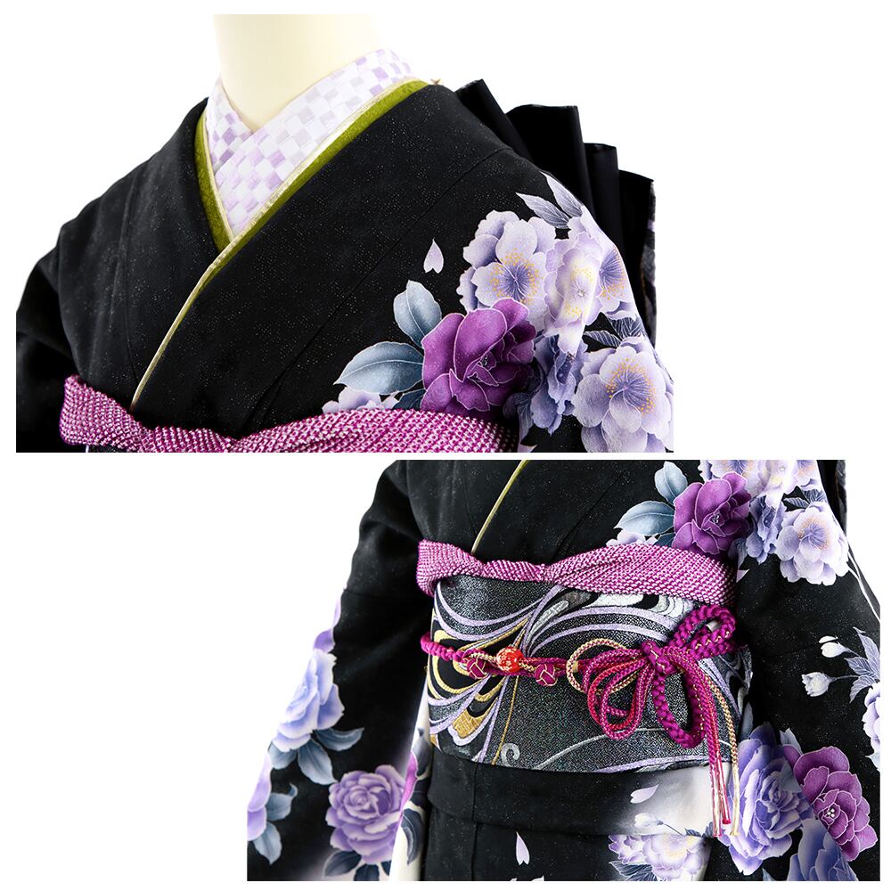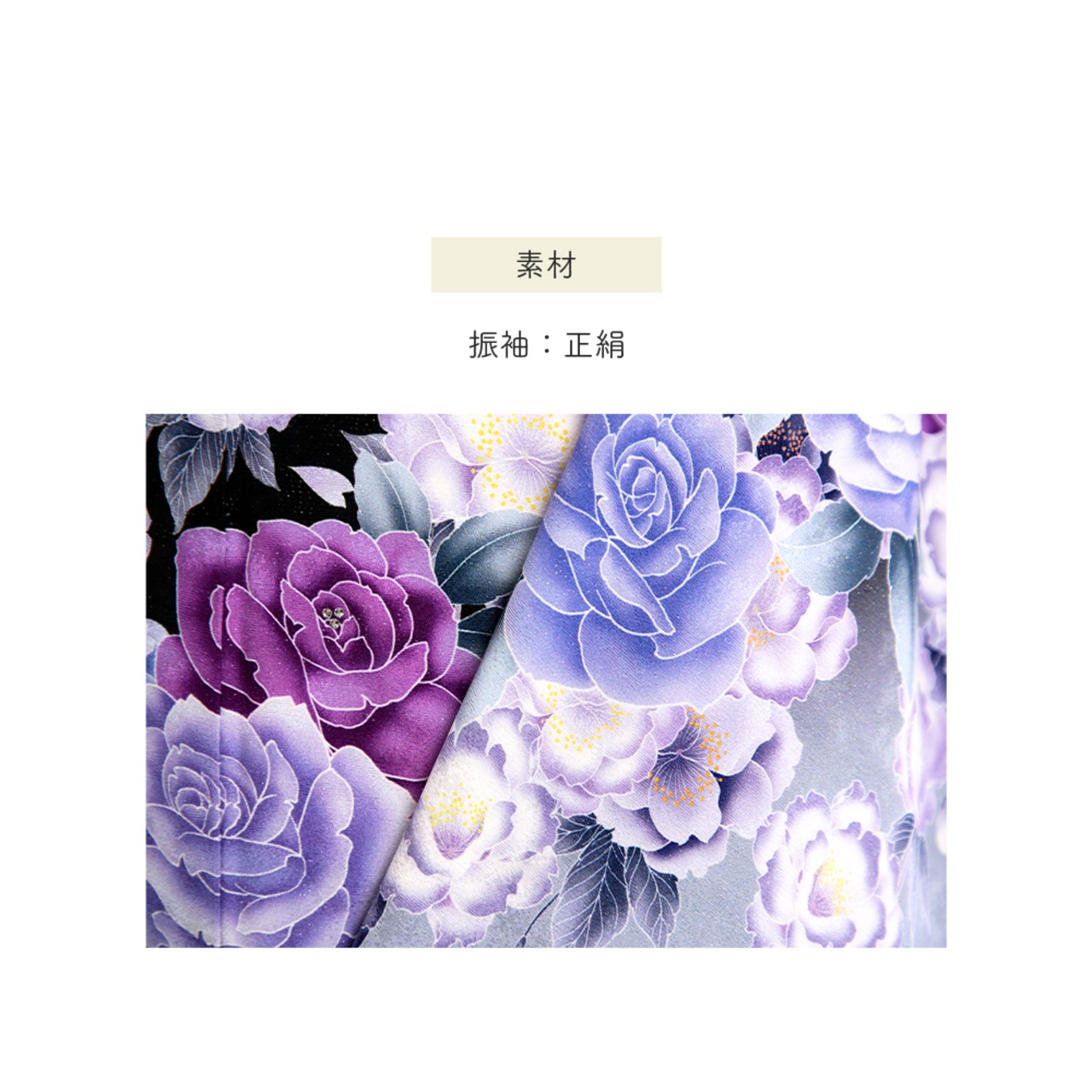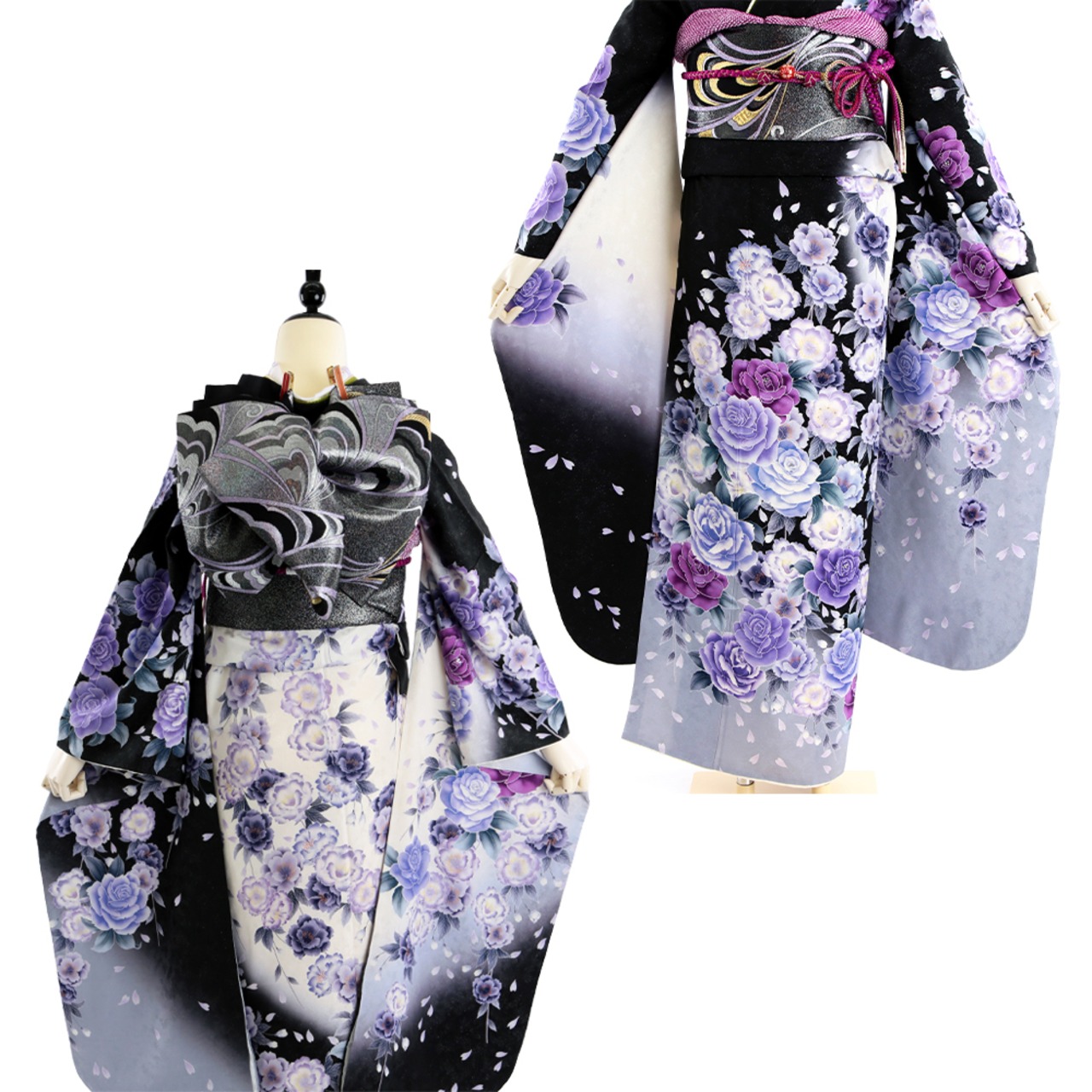 黒地に紫のバラや牡丹が印象的な古典振袖です。