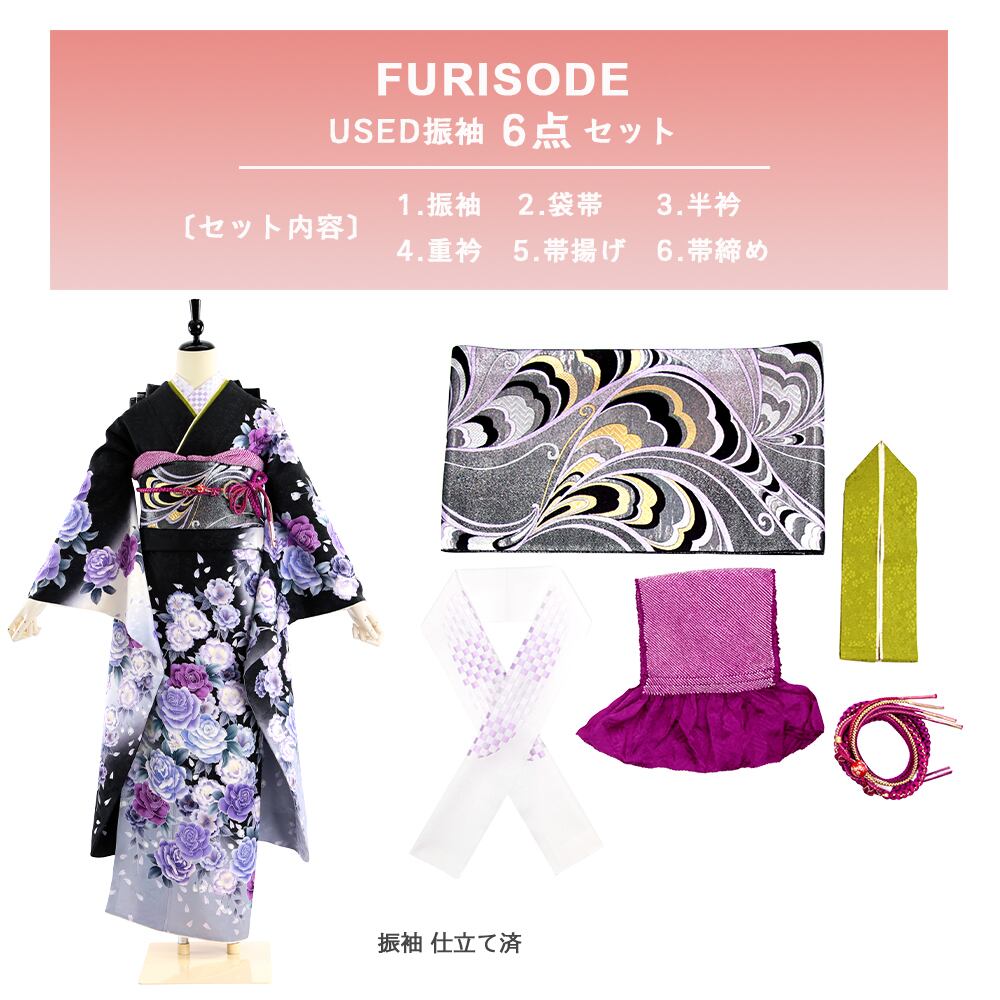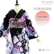 振袖 振袖セット USED振袖 黒 バラ 牡丹 6点セット レディース M〜Lサイズ WA-FN-80