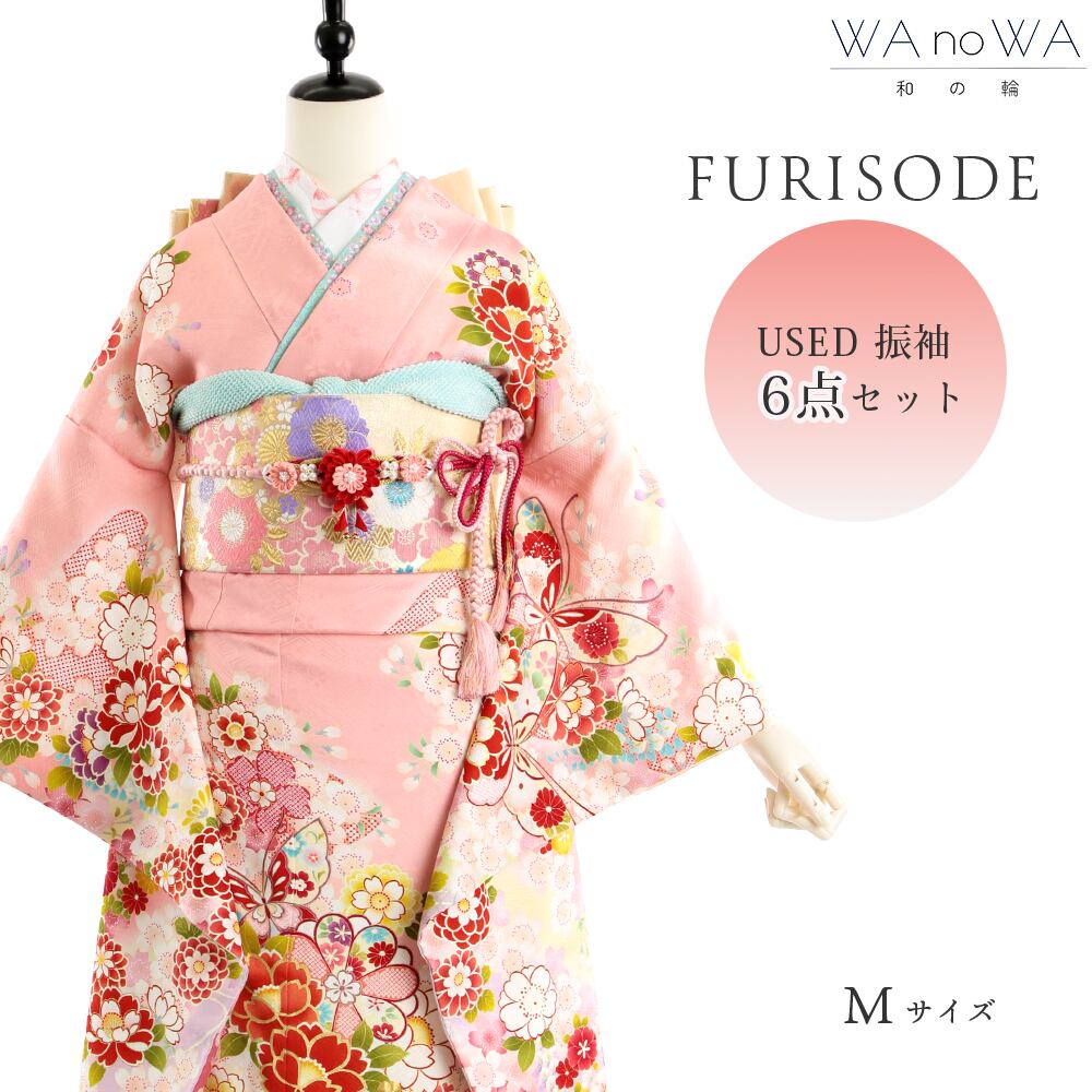 振袖 振袖セット USED振袖 ピンク 牡丹 蝶 6点セット レディース Mサイズ WA-FN-83
