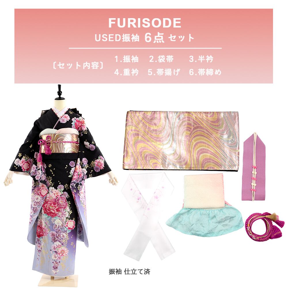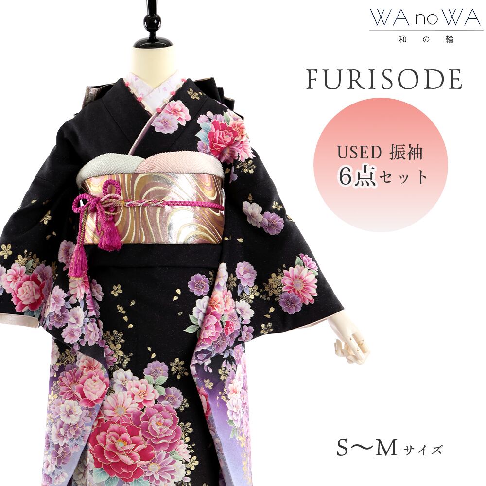 振袖 振袖セット USED振袖 黒 牡丹 6点セット レディース S〜Mサイズ WA-FN-88