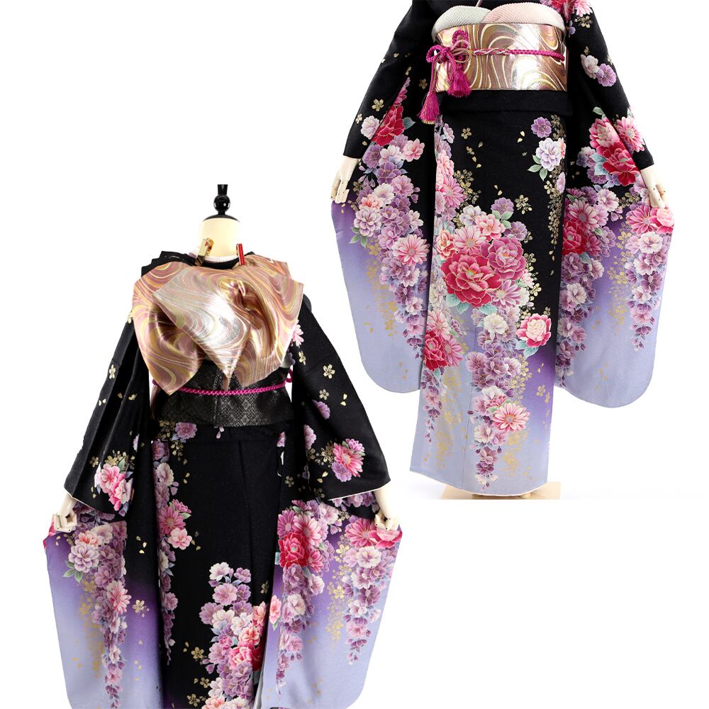 黒地に華やかな牡丹が印象的な古典振袖です。