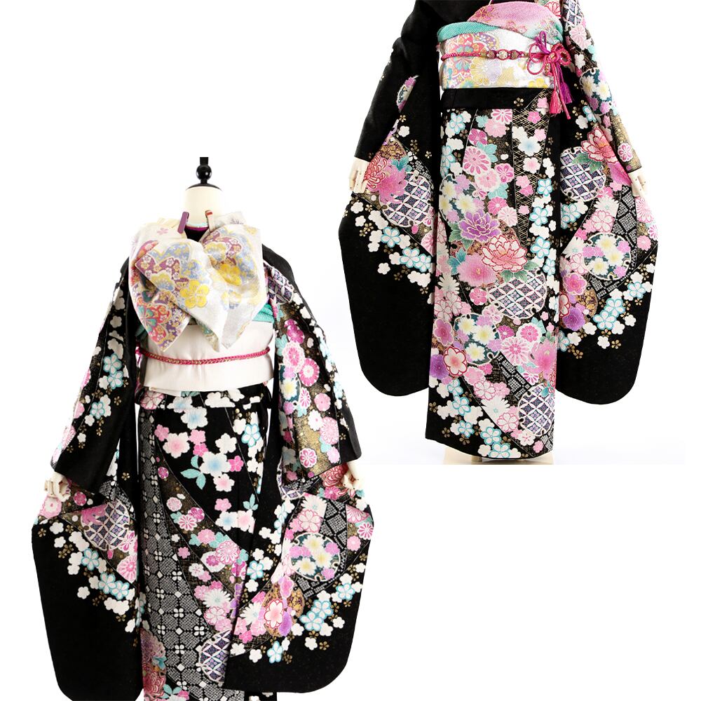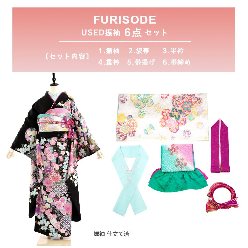 振袖 振袖セット USED振袖 黒 桜 雪輪 6点セット レディース M〜Lサイズ WA-FN-89