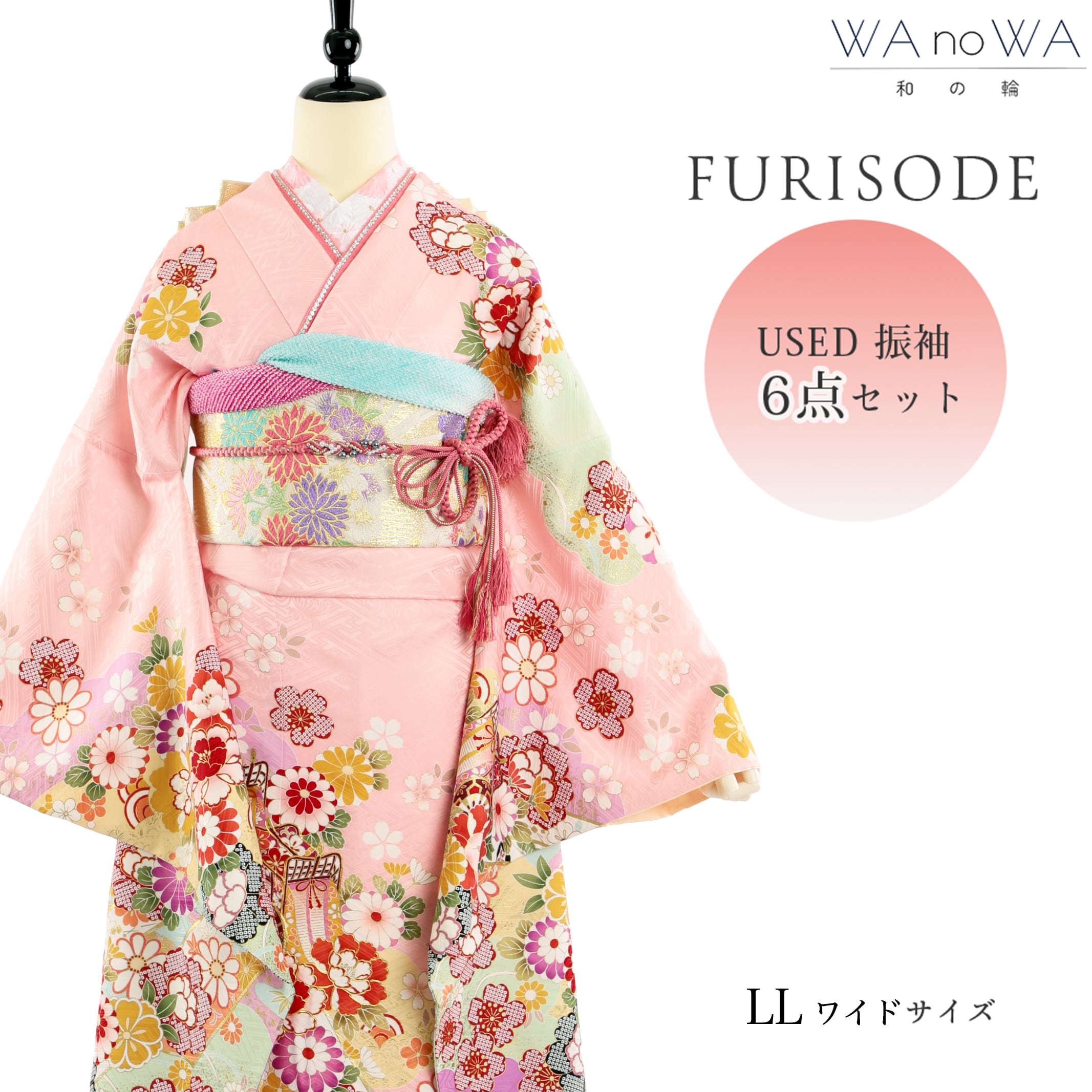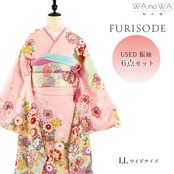 振袖 振袖セット USED振袖 ピンク 御所車 牡丹 鹿の子 6点セット レディース LLワイドサイズ WA-FN-209