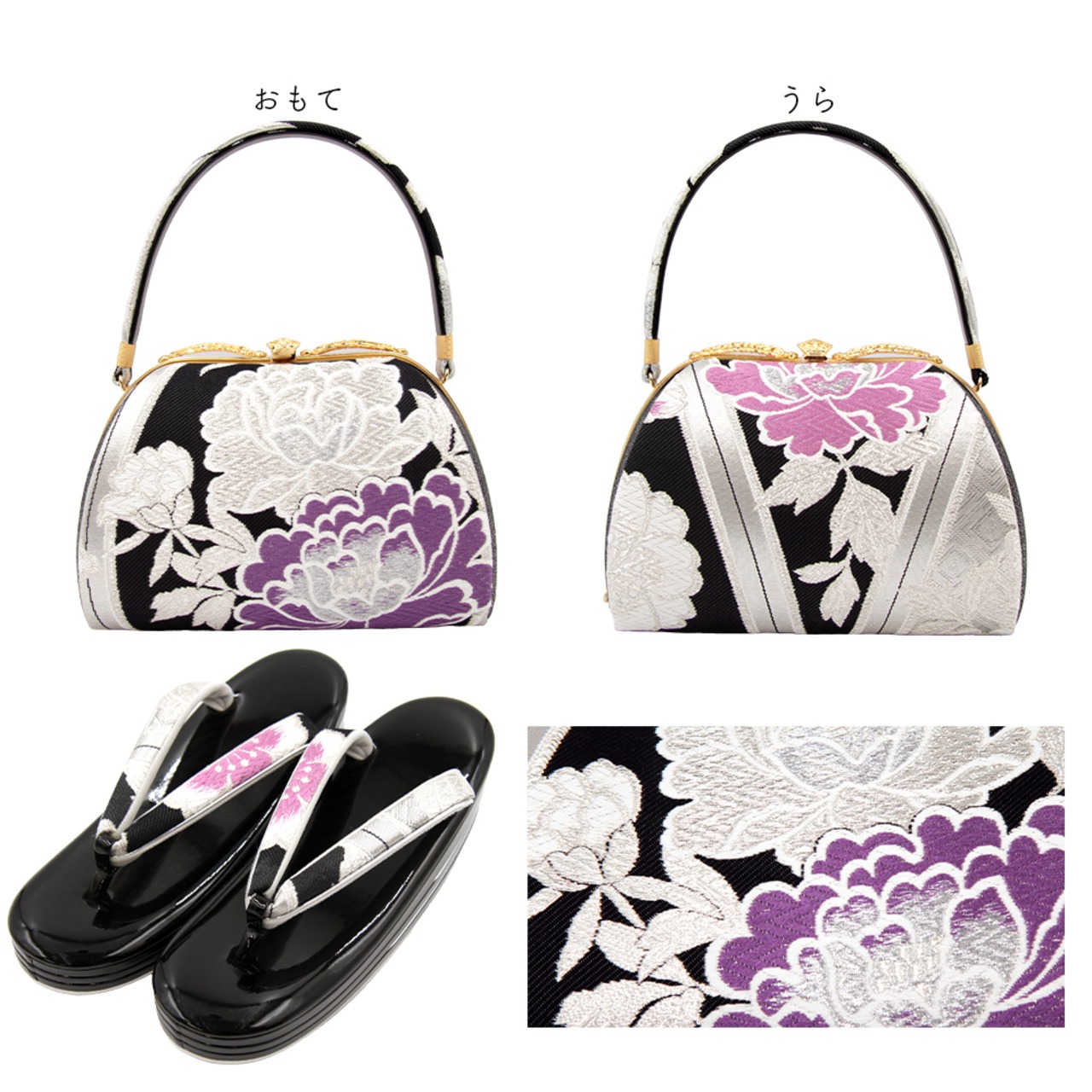 銀糸の牡丹が美しく華やかな草履バッグセットです。