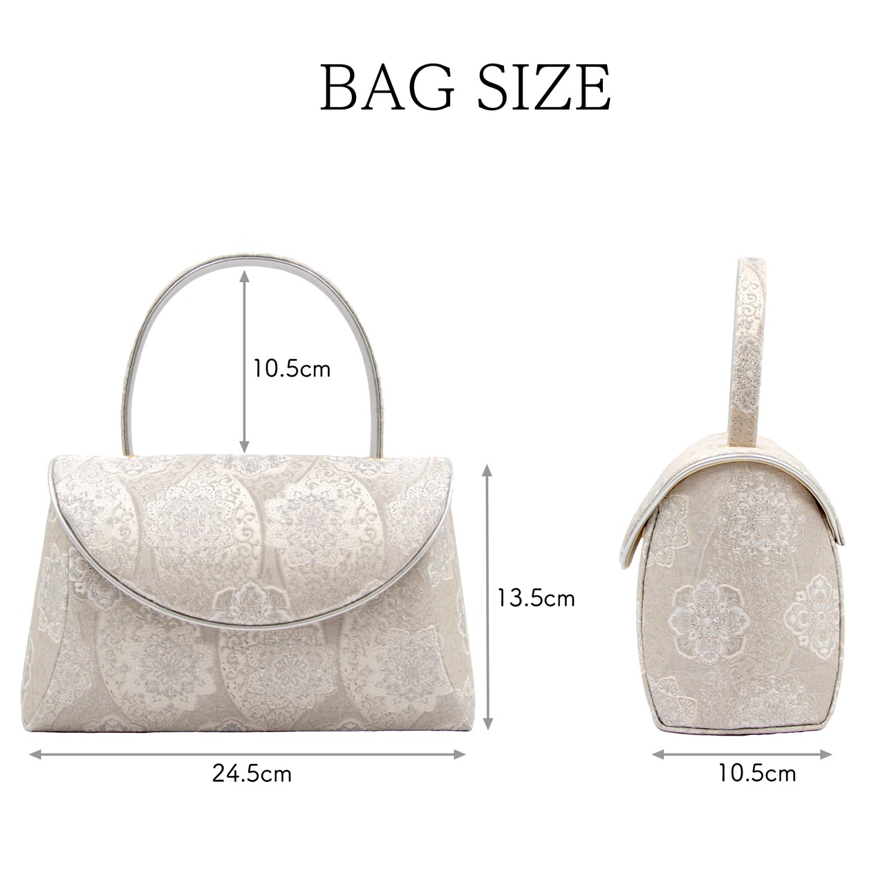 輝く銀糸が美しく丸みある形が特徴的な礼装用草履バッグです。