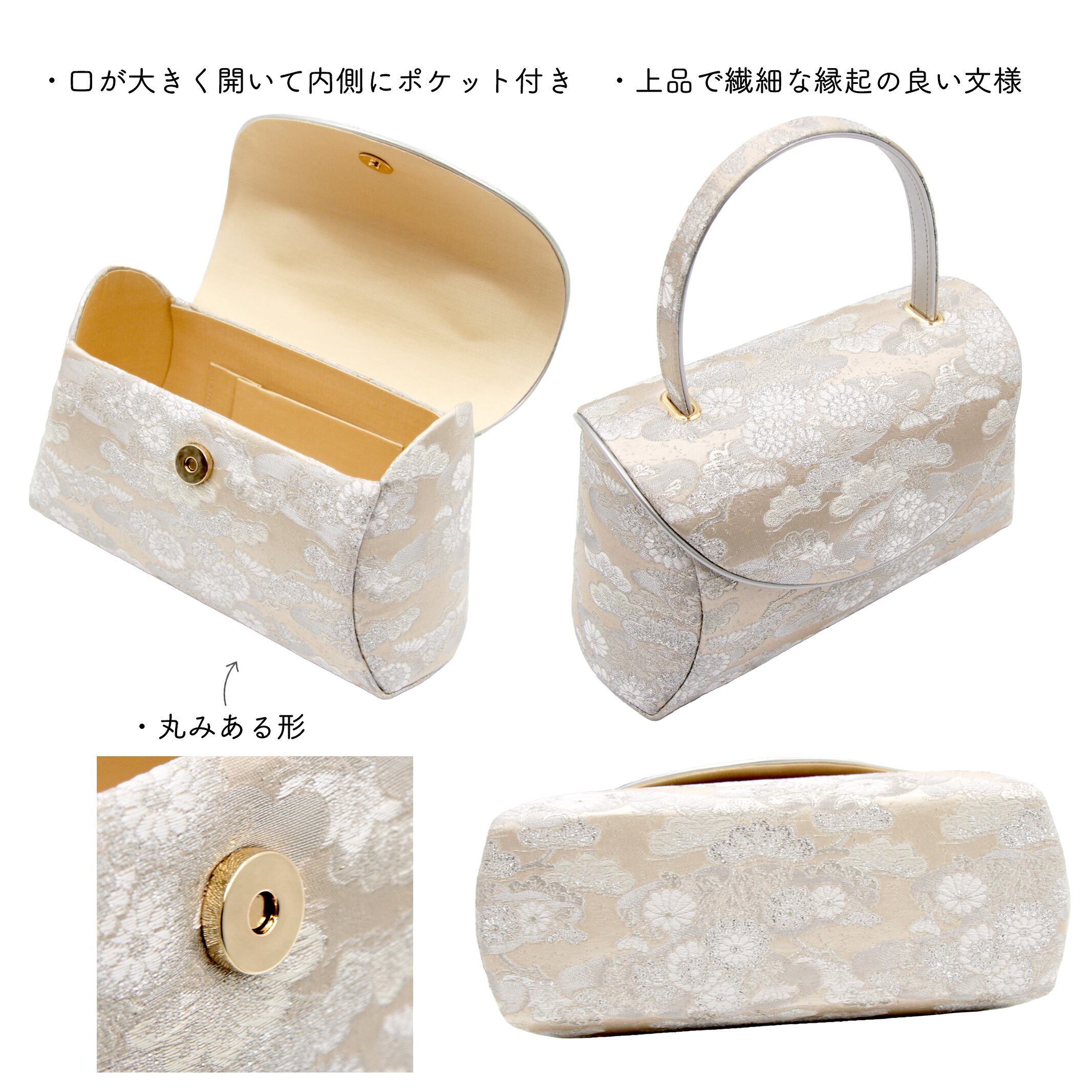 輝く銀糸が美しく丸みある形が特徴的な礼装用草履バッグです。