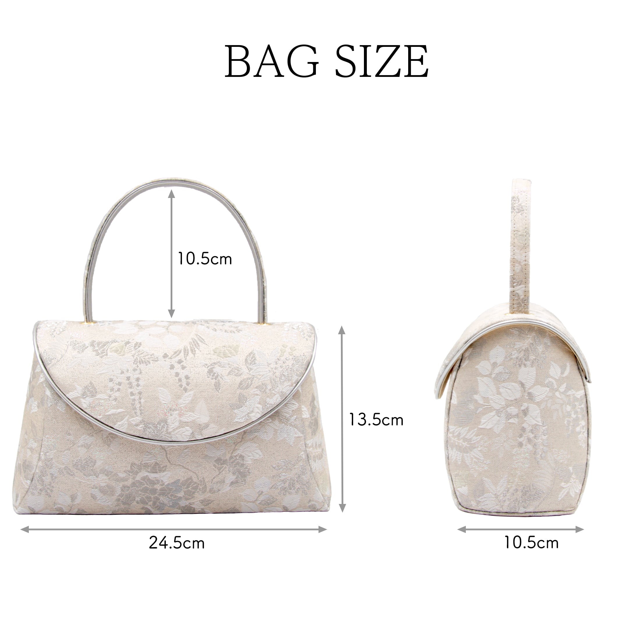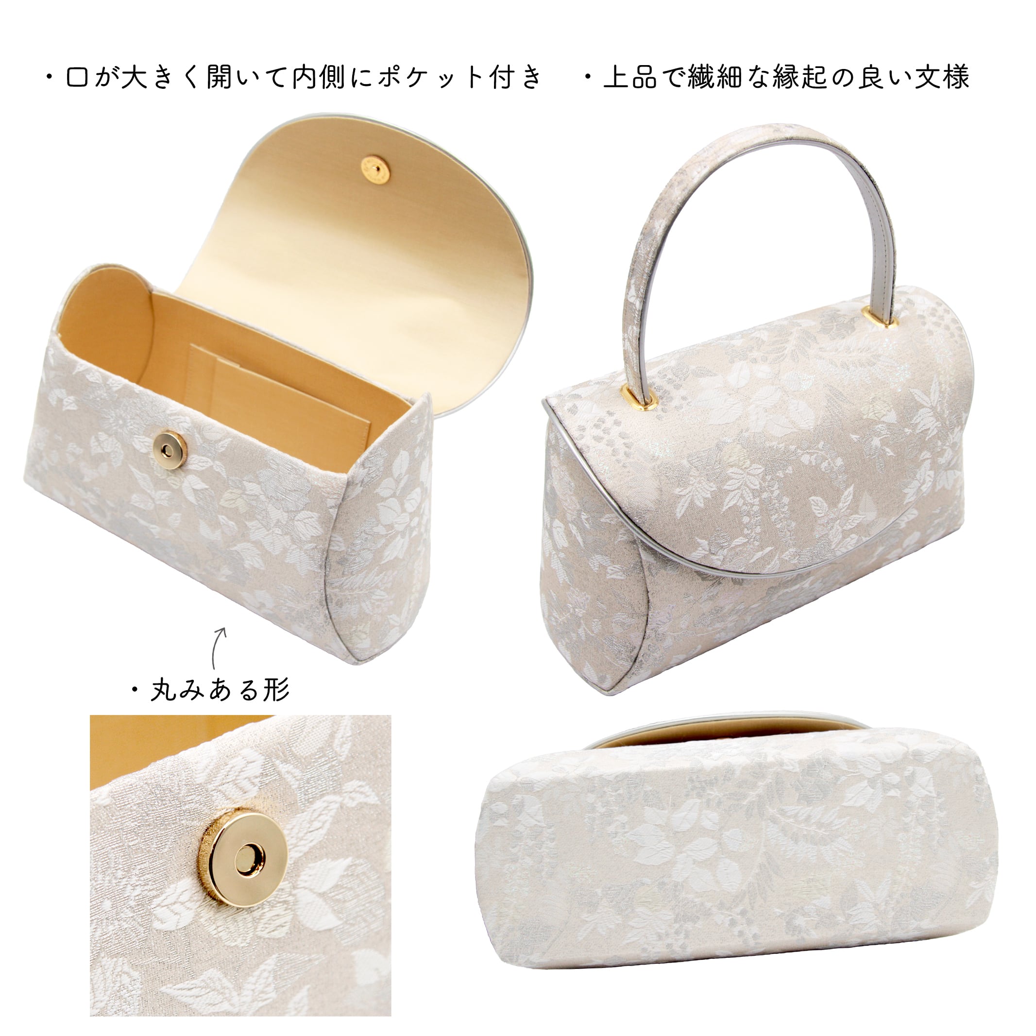 輝く銀糸が美しく丸みある形が特徴的な礼装用草履バッグです。