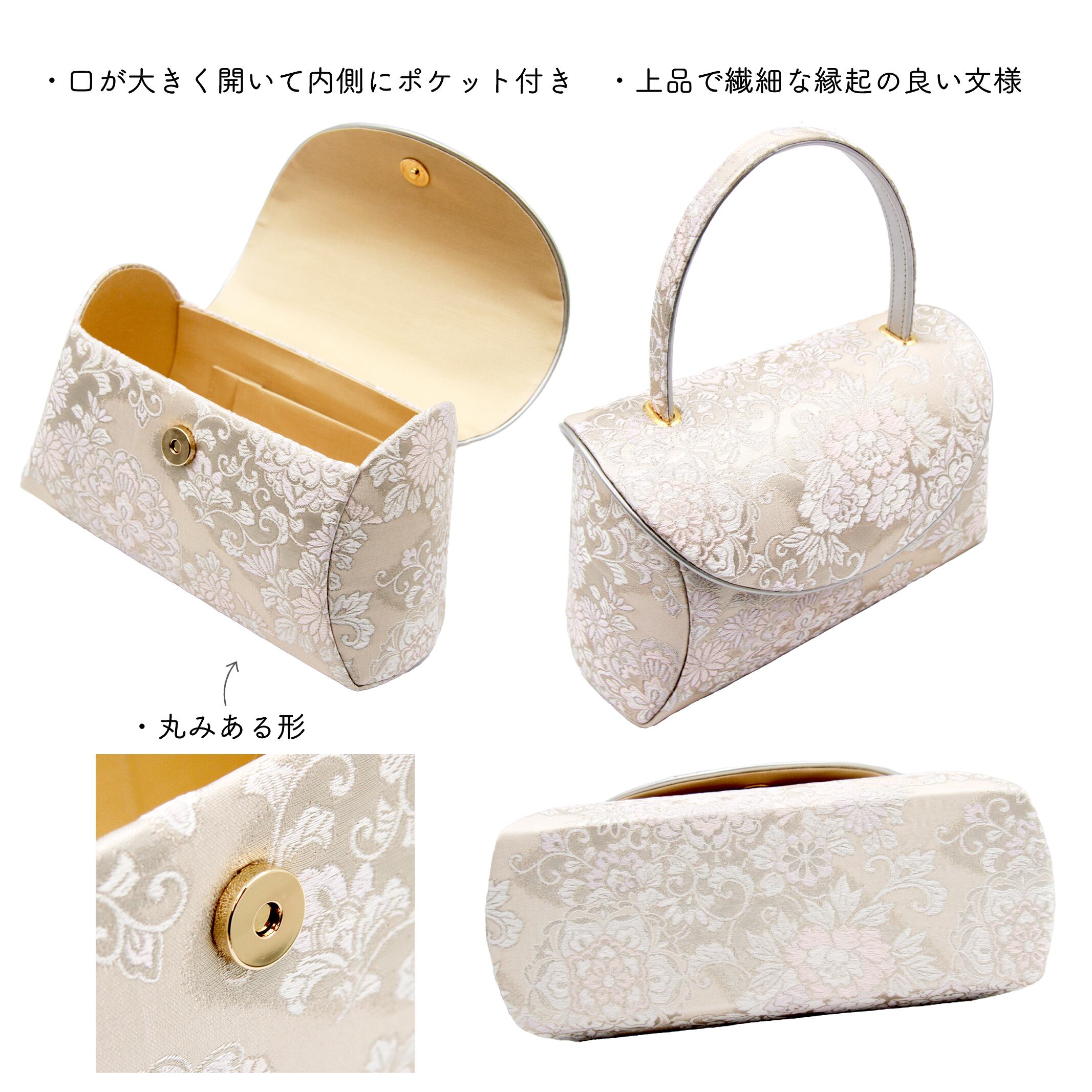 輝く銀糸が美しく丸みある形が特徴的な礼装用草履バッグです。